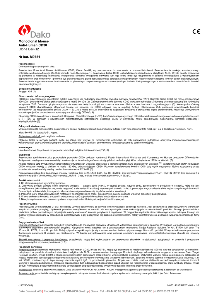 Monoclonal Mouse Anti-Human CD30 Clone Ber-H2 Nr kat. M0751 Przeznaczenie Do badań diagnostycznych in vitro. Przeciwciała Monoclonal Mouse Anti-Human CD30, Clone Ber-H2, są przeznaczone do stosowania w immunohistochemii. Przeciwciała te znakują anaplastycznego chłoniaka wielkokomórkowego (ALCL) i komórki Reed-Sternberga (1). Znakowanie białka CD30 jest uŜytecznym narzędziem w klasyfikacji ALCL. Wyniki panelu przeciwciał są pomocne w klasyfikacji róŜnicowej. Interpretacja kliniczna wystąpienia barwienia lub jego braku musi być uzupełniona o badania morfologiczne z wykorzystaniem odpowiednich prób kontrolnych i powinna być przeprowadzana przez doświadczonego patologa z uwzględnieniem historii choroby pacjenta i innych badań diagnostycznych. Przeciwciała te są przeznaczone do stosowania po pierwotnym rozpoznaniu guza w konwencjonalnym badaniu histopatologicznym z zastosowaniem barwników do barwień nieimmunologicznych. Synonimy antygenu Antygen Ki-1 (1). Streszczenie i informacje ogólne CD30 jest przezbłonowym receptorem cytokin naleŜącym do nadrodziny receptorów czynnika martwicy nowotworów (TNF). Dojrzałe białko CD30 ma masę cząsteczkową 120 kDa i pochodzi od białka prekursorowego o masie 90 kDa (2). Zewnątrzkomórkowa domena CD30 wykazuje homologię z domeną charakterystyczną dla nadrodziny receptorów TNF. Domena cytoplazmatyczna nie wykazuje takiej homologii, co oznacza znaczne róŜnice w mechanizmach sygnalizacyjnych (3). Wewnątrzkomórkowy fragment CD30 charakteryzuje aktywność kinazy, co oznacza, Ŝe CD30 odgrywa rolę w regulacji funkcji, róŜnicowania i/lub proliferacji prawidłowych komórek limfoidalnych (2). Rozpuszczalna postać CD30 — sCD30 o masie 85 kDa, uwolniona od cząsteczki związanej z błoną przez cięcie proteolityczne, moŜe być wykrywana w surowicy pacjentów z nowotworami wykazującymi ekspresję CD30 (3, 4). Ekspresję CD30 stwierdzono w komórkach Hodgkina i Reed-Sternberga (H-RS), komórkach anaplastycznego chłoniaka wielkokomórkowego oraz aktywowanych limfocytach B i T (2). W tkankach i nowotworach nielimfoidalnych potwierdzono ekspresję CD30 w przypadku raków zarodkowych, nasieniaków, komórek doczesnej i międzybłoniaków (5). Odczynnik dostarczony Mysie przeciwciała monoklonalne dostarczane w postaci nadsączu hodowli komórkowej w buforze Tris/HCl o stęŜeniu 0,05 mol/L i pH 7,2 z dodatkiem 15 mmol/L NaN 3. Klon: Ber-H2 (1). Izotyp: IgG1, kappa. StęŜenie mysich IgG: patrz etykieta na fiolce. StęŜenie białek w róŜnych partiach moŜe się róŜnić bez wpływu na rozcieńczenie optymalne. W celu zapewnienia jednolitości odczynów immunohistochemicznych wykonywanych przy uŜyciu róŜnych partii produktu, miano kaŜdej partii jest porównywane i dostosowywane do partii referencyjnej. Immunogen Linia komórkowa Co pobrana od pacjenta z chorobą Hodgkina linii komórkowej T (1, 6). Swoistość Przeciwciała zdefiniowano jako przeciwciała przeciwko CD30 podczas konferencji Fourth International Workshop and Conference on Human Leucocyte Differentiation Antigens (4. międzynarodowe warsztaty i konferencja na temat antygenów róŜnicujących ludzkie leukocyty), która odbyła się w 1989 r. w Wiedniu (7). 125 Analiza metodą SDS-PAGE immunoprecypitatów wytwarzanych w reakcji przeciwciał z lizatami komórek COS znakowanych izotopem I transfekowanych cDNA kodującym CD30 wykazuje reakcję z białkiem o masie 120 kDa, odpowiadającym CD30. Pozornie transfekowane komórki COS dały wynik negatywny. Epitop rozpoznany przez przeciwciała znajdował się między resztami aminokwasów 112 i 412 (8). Przeciwciała znakują linie komórkowe choroby Hodgkina, linie L428, L540, L591, Co, Ho i KM-H2; linie komórek T transfekowane HTLV-1, Hut-102 i MT-2; linie komórek B z transformacją EBV (nie Burkitta), B95-8 (małpy), BJA-B i Cess, a takŜe linie komórek szpikowych, K 562 (1). Środki ostroŜności 1. Do stosowania przez wyszkolony personel. 2. Opisywany produkt zawiera silnie toksyczny związek — azydek sodu (NaN3), w czystej postaci. Azydek sodu, zastosowany w produkcie w stęŜeniu, które nie jest sklasyfikowane jako niebezpieczne, moŜe reagować z elementami kanalizacji wykonanymi z ołowiu i miedzi, powodując nagromadzenie silnie wybuchowych azydków metali. Po usunięciu spłukać duŜą ilością wody, aby zapobiec nagromadzeniu się azydków metali w kanalizacji. 3. Podobnie jak w przypadku wszelkich materiałów pochodzących ze źródeł biologicznych, naleŜy stosować właściwe procedury postępowania. 4. W celu uniknięcia kontaktu z oczami i skórą naleŜy nosić odpowiednie osobiste wyposaŜenie ochronne. 5. Niewykorzystany roztwór usuwać zgodnie z rozporządzeniami lokalnymi, wojewódzkimi i krajowymi. Przechowywanie Przechowywać w temperaturze 2–8°C. Nie naleŜy uŜywać odczynników po upływie terminu waŜności podanego na fiolce. Jeśli odczynniki są przechowywane w warunkach innych niŜ podane powyŜej, uŜytkownik powinien zweryfikować te warunki. Nie ma wyraźnych oznak wskazujących na niestabilność produktu. Dlatego jednocześnie z badaniem próbek pochodzących od pacjenta naleŜy wykonywać kontrole pozytywne i negatywne. W przypadku uzyskania nieoczekiwanego wyniku odczynu, którego nie moŜna wyjaśnić róŜnicami w procedurach laboratoryjnych, i gdy podejrzewa się problem z przeciwciałem, naleŜy skontaktować się z działem wsparcia technicznego firmy Dako. Przygotowlanie próbek Skrawki parafinowe: przeciwciała mogą być wykorzystane do znakowania skrawków utrwalonych w formalinie i zatopionych w parafinie. Wymagane jest poddanie preparatów tkankowych cieplnemu odmaskowaniu antygenu. Optymalne wyniki uzyskuje się z zastosowaniem roztworów: Target Retrieval Solution, nr kat. S1700, lub bufor Tris 10 mmol/L, EDTA, 1 mmol/L, pH 9,0. Mniej optymalne wyniki uzyskuje się z zastosowaniem buforu cytrynianowego 10 mmol/L, pH 6,0. Wstępne traktowanie 