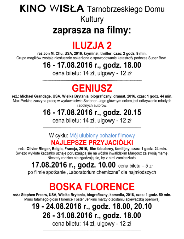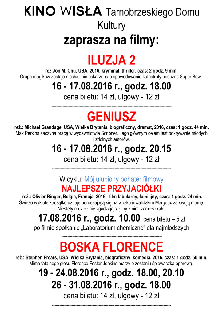 KINO WISŁA Tarnobrzeskiego Domu Kultury zaprasza na filmy: ILUZJA 2 reż.Jon M. Chu, USA, 2016, kryminał, thriller, czas: 2 godz. 9 min. Grupa magików zostaje niesłusznie oskarżona o spowodowanie katastrofy podczas Super Bowl. 16 - 17.08.2016 r., godz. 18.00 cena biletu: 14 zł, ulgowy - 12 zł -------------------------------------------------------------------------------------------------- GENIUSZ reż.: Michael Grandage, USA, Wielka Brytania, biograficzny, dramat, 2016, czas: 1 godz. 44 min. Max Perkins zaczyna pracę w wydawnictwie Scribner. Jego głównym celem jest odkrywanie młodych i zdolnych autorów. 16 - 17.08.2016 r., godz. 20.15 cena biletu: 14 zł, ulgowy - 12 zł ------------------------------------------------------------------------------------------------- W cyklu: Mój ulubiony bohater filmowy NAJLEPSZE PRZYJACIÓŁKI reż.: Olivier Ringer, Belgia, Francja, 2016, film fabularny, familijny, czas: 1 godz. 24 min. Świeżo wyklute kaczątko uznaje poruszającą się na wózku inwalidzkim Margoux za swoją mamę. Niestety rodzice nie zgadzają się, by z nimi zamieszkało. 17.08.2016 r., godz. 10.00 cena biletu – 5 zł po filmie spotkanie „Laboratorium chemiczne” dla najmłodszych ---------------------------------------------------------------------------------- BOSKA FLORENCE reż.: Stephen Frears, USA, Wielka Brytania, biograficzny, komedia, 2016, czas: 1 godz. 50 min. Mimo fatalnego głosu Florence Foster Jenkins marzy o zostaniu śpiewaczką operową. 19 - 24.08.2016 r., godz. 18.00, 20.10 26 - 31.08.2016 r., godz. 18.00 cena biletu: 14 zł, ulgowy - 12 zł ------------------------------------------------------------------------------------------------- W cyklu: Mój ulubiony bohater filmowy spotkanie z operatorem filmowym Aleksandrem Dylem „Jak powstaje film animowany i nie tylko” po spotkaniu projekcja filmu JAK URATOWAĆ MAMĘ reż. Daniel Zduńczyk, Polska, animowany, 2015, czas: 1 godz. 30 min. Dwoje dzieci wyrusza do średniowiecznej krainy, by odnaleźć Złote Krople, które pomogą uratować ich mamę. 24.08.2016 r., godz. 10.00 cena biletu - 5 zł ---------------------------------------------------------------------------------- MÓJ PRZYJACIEL SMOK - 3D reż.: David Lowery, USA, familijny, przygodowy, 2016, czas: 1 godz. 42 min. Tajemniczy dziesięciolatek Pete twierdzi, że mieszka w lesie sam, bez rodziny, jedynie z wielkim zielonym smokiem o imieniu Elliott. 26 - 31.08.2016 r., godz. 16.00 cena biletu: 16 zł, ulgowy - 14 zł ---------------------------------------------------------------------------------- STAR TREK: W nieznane - 3D napisy reż.: Justin Lin, USA, akcja, Sci-Fi, 2016, czas: 2 godz. Kapitan Kirk wraz z załogą USS Enterprise odbywa pięcioletnią misję, podczas której natyka się na złowrogą kosmiczną rasę dowodzoną przez demonicznego Kralla. 26 - 31.08.2016 r., godz. 20.00 cena biletu: 16 zł, ulgowy - 14 zł ---------------------------------------------------------------------------------- BARBIE: Gwiezdna przygoda reż.: Andrew Tan, USA, animacja, 2016, czas: 1 godz. 20 min. Piękna Barbie tym razem w roli kosmicznej księżniczki latającej w kosmosie na magicznej deskorolce. W podróży przez przestworza towarzyszy jej ukochane zwierzątko, oddany, wierny przyjaciel Pupcorn. 2 - 7.09.2016 r., godz. 16.30 cena biletu: 14 zł, ulgowy - 12 zł ---------------------------------------------------------------------------------- JAK BÓG DA reż.: Edoardo Maria Falcone, Włochy, komedia, 2016, czas: 1 godz. 27 min. Tommaso to ceniony rzymski kardiochirurg. I ateista. Wraz z żoną Carlą i dwójką dorosłych już dzieci tworzą modelową, nowoczesną, mieszczańską rodzinę. Przynajmniej tak im się wydaje. 2 - 7.09.2016 r., godz. 18.00 cena biletu: 14 zł, ulgowy - 12 zł ---------------------------------------------------------------------------------- LEGION SAMOBÓJCÓW - 3D dubbing reż.: David Ayer, USA, Kanada, akcja, 2016, czas: 2 godz. 3 min. Grupa złoczyńców otrzymuje od rządu szansę na odkupienie, wypełniając misję zagrażającą ich życiu. 2 - 7.09.2016 r., godz. 20.00 cena biletu: 16 zł, ulgowy - 14 zł ---------------------------------------------------------------------------------- SMOLEŃSK reż.: Antoni Krauze, Polska, dramat, 2016 Młoda dziennikarka na własną rękę prowadzi dochodzenie w sprawie katastrofy smoleńskiej. 11 - 14.09.2016 r., godz. 18.00 i 20.00 16 - 24.09.2016 r., godz. 18.00 cena biletu: 14 zł, ulgowy - 12 zł ---------------------------------------------------------------------------------- od 23 września SEKRETY ŻYCIA ZWIERZAKÓW DOMOWYCH reż.: Chris Renaud, USA, animacja, komedia, 2016, czas: 1 godz. 30 min. Gdy ludzie opuszczają dom, zwierzęta prowadzą życie pełne przygód i intryg. Kino „WISŁA” TDK zastrzega sobie możliwość zmiany repertuaru. INFORMACJE I SPRZEDAŻ BILETÓW: TDK - Dział Organizacji Imprez, tel. 15 822 21 10, w. 32