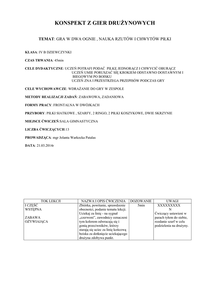 KONSPEKT Z GIER DRUŻYNOWYCH TEMAT: GRA W DWA OGNIE , NAUKA RZUTÓW I CHWYTÓW PIŁKI KLASA: IV B DZIEWCZYNKI CZAS TRWANIA: 45min CELE DYDAKTYCZNE: UCZEŃ POTRAFI PODAĆ PIŁKĘ JEDNORĄCZ I CHWYCIĆ OBURĄCZ UCZEŃ UMIE PORUSZAĆ SIĘ KROKIEM ODSTAWNO DOSTAWNYM I BIEGOWYM PO BOISKU UCZEŃ ZNA I PRZESTRZEGA PRZEPISÓW PODCZAS GRY CELE WYCHOWAWCZE: WDRAŻANIE DO GRY W ZESPOLE METODY REALIZACJI ZADAŃ: ZABAWOWA, ZADANIOWA FORMY PRACY: FRONTALNA W DWÓJKACH PRZYBORY: PIŁKI SIATKOWE , SZARFY, 2 RINGO, 2 PIŁKI KOSZYKOWE, DWIE SKRZYNIE MIEJSCE ĆWICZEŃ:SALA GIMNASTYCZNA LICZBA ĆWICZĄCYCH:13 PROWADZĄCA: mgr Jolanta Warkocka Patalas DATA: 21.03.2014r TOK LEKCJI I CZĘŚĆ WSTĘPNA ZABAWA OŻYWIAJĄCA NAZWA I OPIS ĆWICZENIA DOZOWANIE UWAGI Zbiórka, powitanie, sprawdzenie 5min XXXXXXXXX obecności, podanie tematu lekcji. N Uciekaj za linię - na sygnał Ćwiczący ustawieni w „czerwoni”, zawodnicy oznaczeni parach tyłem do siebie, tym kolorem odwracają się i rozdanie szarf w celu gonią przeciwników, którzy podzielenia na drużyny. starają się uciec za linię końcową boiska za dotknięcie uciekającego drużyna zdobywa punkt. II CZĘŚC GŁÓWNA A ĆW. RR,NN,T BEZ PIŁEK I Z PIŁKAMI Czarodziejski las – jeden z zespołów jest rozstawiony dowolnie na ograniczonym polu. Członkowie drugiego starają się przejść przez „las”, który może chwytać, stwarzając blokadę. ĆWICZENIA Z PIŁKĄ: - toczenie piłki prawą ręką - toczenie piłki lewą ręką - w biegu wyrzut i złapanie piłki - w truchcie – odbicie piłki przed sobą i chwyt nad głową - jw. z klaśnięciem z przodu i za plecami - w marszu co trzeci kro przełożenie piłki pod uniesioną nogą - w marszu, krążenie piłki wokół bioder - w marszu co trzeci krok – wypad nogi w przód i przełożenie piłki pod nogą wykroczną - piłka między nogami – podskoki obunóż 35min Ćwiczący podzieleni na dwa zespoły Każdy ma piłkę, ustawieni na linii końcowe w bezpiecznych odległościach ĆW. W PARACH ĆW KSZTAŁTUJĄCE II CZĘŚĆ GŁÓWNA B - - piłka trzymana z tyłu wyrzut do partnera nad głową stojąc tyłem podanie kozłem pod nogami podanie piłki oburącz znad głowy podanie piłki prawą i lewą ręką półgórnie podanie piłki prawą i lewą ręką wysoko podanie piłek od każdego ćwiczącego z piłką do zawodników przemieszczających się krokiem odstawno dostawnym bez piłek. „Ruchomy cel”Zawodnicy drużyny B przebiegają w kierunku przeciwnej linii końcowej. Zawodnicy drużyny A rzucają piłkami w przebiegających zawodników X X X X X X N XXXX---oX oX oX oX Ćwiczący podzieleni na dwie drużyny, drużyna A ustawiona w dwu szeregach naprzeciw siebie na liniach bocznych do siatkówki. Każdy zawodnik z piłką. Zawodnicy drużyny B ustawieni na linii końcowej GRA Gra w dwa ognie „zbijak” Gra „piłka na skrzyni”(zbijak z wybawianiem i z piłkami na skrzyni) III CZĘŚĆ KOŃCOWA ĆWICZENIA USPOKAJAJĄCE PODSUMOWANIE LEKCJI PISANIE NA PLECACHzabawa polega na rysowaniu na plecach jednej osoby z pary liter i cyfra jej zadaniem jest to odgadnąć. Po minucie następuje zmiana. Omówienie lekcji, pożegnanie 5min. Ćwiczący ustawieni w dwójkach, w siadzie skrzyżnym. XX XX XX XX XXXXXXX N