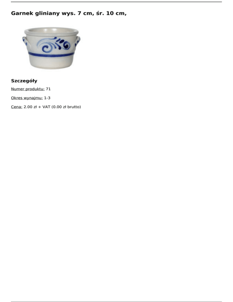 Garnek gliniany wys. 7 cm, śr. 10 cm, Szczegóły Numer produktu: 71 Okres wynajmu: 1-3 Cena: 2.00 zł + VAT (0.00 zł brutto) Powered by TCPDF (www.tcpdf.org)