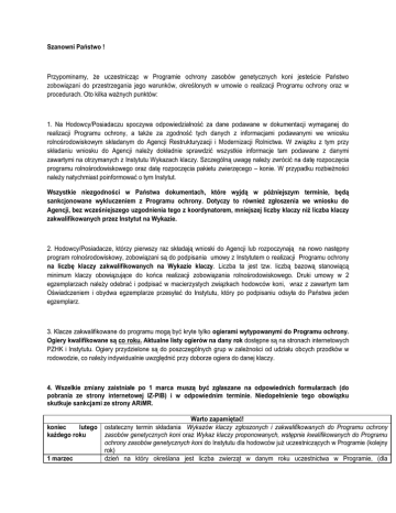 Szanowni Państwo ! Przypominamy, że uczestnicząc w Programie ochrony zasobów genetycznych koni jesteście Państwo zobowiązani do przestrzegania jego warunków, określonych w umowie o realizacji Programu ochrony oraz w procedurach. Oto kilka ważnych punktów: 1. Na Hodowcy/Posiadaczu spoczywa odpowiedzialność za dane podawane w dokumentacji wymaganej do realizacji Programu ochrony, a także za zgodność tych danych z informacjami podawanymi we wniosku rolnośrodowiskowym składanym do Agencji Restrukturyzacji i Modernizacji Rolnictwa. W związku z tym przy składaniu wniosku do Agencji należy dokładnie sprawdzić wszystkie informacje tam podawane z danymi zawartymi na otrzymanych z Instytutu Wykazach klaczy. Szczególną uwagę należy zwrócić na datę rozpoczęcia programu rolnośrodowiskowego oraz datę rozpoczęcia pakietu zwierzęcego – konie. W przypadku rozbieżności należy natychmiast poinformować o tym Instytut. Wszystkie niezgodności w Państwa dokumentach, które wyjdą w późniejszym terminie, będą sankcjonowane wykluczeniem z Programu ochrony. Dotyczy to również zgłoszenia we wniosku do Agencji, bez wcześniejszego uzgodnienia tego z koordynatorem, mniejszej liczby klaczy niż liczba klaczy zakwalifikowanych przez Instytut na Wykazie. 2. Hodowcy/Posiadacze, którzy pierwszy raz składają wnioski do Agencji lub rozpoczynają na nowo następny program rolnośrodowiskowy, zobowiązani są do podpisania umowy z Instytutem o realizacji Programu ochrony na liczbę klaczy zakwalifikowanych na Wykazie klaczy. Liczba ta jest tzw. liczbą bazową stanowiącą minimum klaczy obowiązujące do końca realizacji zobowiązania rolnośrodowiskowego. Druki umowy w 2 egzemplarzach należy odebrać i podpisać w macierzystych związkach hodowców koni, wraz z zawartym tam Oświadczeniem i obydwa egzemplarze przesyłać do Instytutu, który po podpisaniu odsyła do Państwa jeden egzemplarz. 3. Klacze zakwalifikowane do programu mogą być kryte tylko ogierami wytypowanymi do Programu ochrony. Ogiery kwalifikowane są co roku. Aktualne listy ogierów na dany rok dostępne są na stronach internetowych PZHK i Instytutu. Ogiery przydzielone są do poszczególnych grup w zależności od udziału obcych przodków w rodowodzie, co należy indywidualnie uwzględnić przy doborze ogiera do danej klaczy. 4. Wszelkie zmiany zaistniałe po 1 marca muszą być zgłaszane na odpowiednich formularzach (do pobrania ze strony internetowej IZ-PIB) i w odpowiednim terminie. Niedopełnienie tego obowiązku skutkuje sankcjami ze strony ARiMR. Warto zapamiętać! koniec lutego ostateczny termin składania Wykazów klaczy zgłoszonych i zakwalifikowanych do Programu ochrony każdego roku zasobów genetycznych koni oraz Wykaz klaczy proponowanych, wstępnie kwalifikowanych do Programu ochrony zasobów genetycznych koni do Instytutu dla hodowców już uczestniczących w Programie (kolejny rok) 1 marzec dzień na który określana jest liczba zwierząt w danym roku uczestnictwa w Programie, (dla 15 maj 30 dni !!!!! 10 dni !!!!! Podmiot prowadzący księgę Koordynator Programu uczestniczących po raz pierwszy ustanawia to tzw. liczbę bazową) ostateczny termin zatwierdzenia w/w Wykazów dotyczących realizacji Programów Ochrony na zgłoszenie do ARiMR potwierdzonej przez IZ-PIB zamiany zwierząt na zgłoszenie do ARiMR zdarzenia spowodowanego siłą wyższą Polski Związek Hodowców Koni / Okręgowe Związki Hodowców Koni Potwierdza wykaz siły wyższej Instytut Zootechniki PIB – potwierdza wykaz zamiany Informacje związane z wprowadzeniem nowelizacji rozporządzenia o płatnościach rolnośrodowiskowych ( Dz. U. z dnia 15 marca 2012 r., poz. 278) 1. Zadania w obrębie pakietu ochrony lokalnych ras koni realizowane są w cyklach rocznych. Hodowca/Posiadacz powinien utrzymywać w tym okresie wszystkie zakwalifikowane do Programu klacze. Wprowadzanie dodatkowych klaczy możliwe jest tylko po zakończeniu rocznego cyklu realizowanego zadania, po uprzednim ich zakwalifikowaniu do Programu. 2. Hodowca/Posiadacz będzie podlegał systemowi kar finansowych oraz wykluczeń z Programu rolnośrodowiskowego za niezgodność w liczbie sztuk zadeklarowanych we wniosku, a stwierdzonych podczas kontroli, dlatego też niezwykle istotne jest przestrzeganie wszelkich terminów przesyłania dokumentacji. 3. Wszelkie zmiany możliwe są tylko po uprzednim wstępnym zakwalifikowaniu klaczy przez Instytut (na Wykazie klaczy proponowanych) w terminie określonym Procedurą i tylko w obrębie zadeklarowanej we wniosku do ARiMR liczby klaczy. 4. W przypadku zmiany stanu posiadanych klaczy lub wymiany klaczy na inną, Hodowca/Posiadacz zobowiązany jest, przy składaniu do ARiMR wniosku o kolejną płatność, dołączyć aktualną kopię potwierdzonego przez Instytut Wykazu klaczy zgłoszonych i zakwalifikowanych do Programu. 5. W przypadku sprzedaży klaczy lub wycofania ze stada w związku z pracami hodowlanymi (brakowanie) możliwe jest wprowadzenie w trakcie realizacji rocznego zadania innej klaczy, po uprzednim wstępnym jej zakwalifikowaniu na Wykazie klaczy proponowanych. Klacze, po przejściu całej procedury kwalifikacji mogą być objęte Programem, ale tylko w zamian za inne wycofane klaczy, i pod warunkiem, że zostały wcześniej zgłoszone na Wykazie klaczy proponowanych, w obowiązującym terminie składania Wniosków i Wykazów. 6. W przypadku sprzedaży klaczy lub wycofania ze stada Hodowca/Posiadacz niezwłocznie przesyła do Instytutu Wykaz klaczy wprowadzonych do Programu ochrony zasobów genetycznych w ramach zamiany, wraz z załączoną kserokopią umowy kupna-sprzedaży lub innym stosownym dokumentem. Na Wykazie tym umieszcza się klacz wycofaną oraz klacz wprowadzaną na zamianę. W ciągu 30 dni Hodowca/Posiadacz zobowiązany jest dostarczyć do oddziału ARiMR zatwierdzony przez IZ-PIB Wykaz klaczy wprowadzonych w ramach zamiany. 7. W przypadku ubycia zwierzęcia ze stada w wyniku d