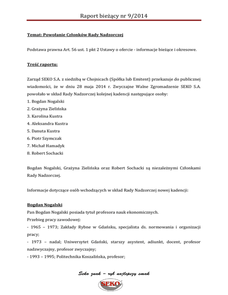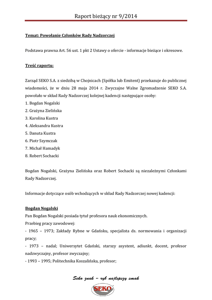 Raport bieżący nr 9/2014 Temat: Powołanie Członków Rady Nadzorczej Podstawa prawna Art. 56 ust. 1 pkt 2 Ustawy o ofercie - informacje bieżące i okresowe. Treść raportu: Zarząd SEKO S.A. z siedzibą w Chojnicach (Spółka lub Emitent) przekazuje do publicznej wiadomości, że w dniu 28 maja 2014 r. Zwyczajne Walne Zgromadzenie SEKO S.A. powołało w skład Rady Nadzorczej kolejnej kadencji następujące osoby: 1. Bogdan Nogalski 2. Grażyna Zielińska 3. Karolina Kustra 4. Aleksandra Kustra 5. Danuta Kustra 6. Piotr Szymczak 7. Michał Hamadyk 8. Robert Sochacki Bogdan Nogalski, Grażyna Zielińska oraz Robert Sochacki są niezależnymi Członkami Rady Nadzorczej. Informacje dotyczące osób wchodzących w skład Rady Nadzorczej nowej kadencji: Bogdan Nogalski Pan Bogdan Nogalski posiada tytuł profesora nauk ekonomicznych. Przebieg pracy zawodowej: - 1965 – 1973; Zakłady Rybne w Gdańsku, specjalista ds. normowania i organizacji pracy; - 1973 – nadal; Uniwersytet Gdański, starszy asystent, adiunkt, docent, profesor nadzwyczajny, profesor zwyczajny; - 1993 – 1995; Politechnika Koszalińska, profesor; Seko znak – ryb najlepszy smak Raport bieżący nr 9/2014 - 1995 – 1999; Wyższa Szkoła Administracji i Biznesu im. Eugeniusza Kwiatkowskiego w Gdyni, profesor, dziekan; - 1999 – 2005; Wyższa Szkoła Administracji i Biznesu im. Eugeniusza Kwiatkowskiego w Gdyni, profesor, rektor; - 1995 – 2010; profesor w Akademii Techniczno – Rolniczej im. J. J. Śniadeckich Bydgoszczy (obecnie Uniwersytet Technologiczno – Przyrodniczy im. J. J. Śniadeckich Bydgoszczy).; - 1996 – 2006; własna działalność gospodarcza (konsulting); - 1997 – nadal; członek zarządu i wspólnik Biuro Doradztwa Ekonomicznego i Prawnego BUSINESS CONSULTANTS Sp. z o.o. z siedzibą w Gdańsku, ul. Jaśkowa Dolina 15, zarejestrowanej w rejestrze przedsiębiorców Krajowego Rejestru Sądowego w Sądzie Rejonowym Gdańsk – Północ w Gdańsku, VII Wydział Gospodarczy Krajowego Rejestru Sądowego pod numerem KRS 193146. - 2007 – nadal, członek Rady Nadzorczej SEKO S.A., - 2008 – nadal; profesor w Wyższej Szkole Bankowej w Gdańsku, - 2010 – 2011; profesor w Akademii Leona Koźmińskiego w Warszawie. Praca dydaktyczno - naukowa na Uniwersytecie Gdańskim, Instytut Organizacji i Zarządzania profesor zwyczajny, - Dyrektor (1999 – 2004), obecnie Wicedyrektor (od 2005) - profesor tytularny, b. Rektor - Wyższa Szkoła Administracji i Biznesu w Gdyni (dwie kadencje). Autor licznych publikacji z zakresu zarządzania strategicznego i strategii zarządzania. Uczestnictwo w komitetach i organizacjach: Doctor Honoris Causa Uniwersytetu Bioterra w Bukareszcie (Rumunia), Przewodniczący Komitetu Nauk Organizacji i Zarządzania Polskiej Akademii Nauk, Członek Prezydium Centralnej Komisji do Spraw Stopni i Tytułów, Członek i Przewodniczący Sekcji Nauk Ekonomicznych Centralnej Komisji do Spraw Stopni i Tytułów, Członek Rady Programowej "Przegląd Organizacji", Przewodniczący Rady Programowej "Współczesne Zarządzanie" Kwartalnika Środowisk Naukowych i Liderów Biznesu, Członek Kolegium Redakcyjnego "Master of Business Administration", Członek Rady Programowej Zeszytów Naukowych Wydziału Zarządzania i Ekonomiki Usług Uniwersytetu Szczecińskiego pt.: Problemy zarządzania, finansów i marketingu, Członek Komitetu Seko znak – ryb najlepszy smak Raport bieżący nr 9/2014 Nauk Organizacji i Zarządzania Polskiej Akademii Nauk, Członek Kapituły Medalu im. T. Kotarbińskiego, Członek wielu Rady Programowych Konferencji Naukowych. Kwalifikacje i zajmowane wcześniej stanowiska: Pan Bogdan Nogalski pełnił funkcje konsultanta ds. zarządzania i restrukturyzacji oraz tworzenia strategii m.in. w ZCh Police SA. w Policach; Rafako S.A. w Raciborzu, Polifarb – Oliva ZF PP, ELZAM-HOLDING S.A., Port Gdynia Holding S.A., POL-MOT Warfama S.A. w Dobrym Mieście, Anwil S.A. b. Zakłady Azotowe Włocławek S.A., PPPPRiG Petrobaltic Gdańsk, Zakład Energetyczny Koszalin S.A., Zakład Energetyczny Słupsk S.A., Hevelius Brewing Company LTD w Gdańsku, ESPEBEPE - Holding S.A. w Szczecinie, ELBREWERY Co. LTD w Elblągu, POLIFARB-OLIVA ZF PP w Gdyni, Wytwórnia Uszczelek MORPAK Sp. z o.o. w Gdańsku, Polimex-Cekop S.A., OMI Sp. z o.o. w Gdańsku spółki zarządzającej grupą kapitałową OLECH, Kapena S.A. w Słupsku, Polmo S.A. w Szczecinie, ZCH Organika – Zachem w Bydgoszczy, ROLMAX Sp. Z o.o. w Suszu, MZK Sp. z o.o. w Słupsku. Były Członek Rad Nadzorczych w następujących spółkach: Remprodex Sp. z o.o. w Człuchowie, SANIPOR Sp. z o.o. w Gdyni, ZPB Zawtex S.A. w Zawierciu, Wigolen S.A. w Częstochowie, Dyrekcja Budowy Szpitala w Kościerzynie, Pucka Gospodarka Komunalna w Sp. z o.o. w Pucku, ZRE Sp. z o.o. w Gdańsku., TUiR Gwarant S.A. w Gdańsku, OLECH S.A. w Gdańsku, Olech Agencja Celna S.A. w Gdańsku, Sapro Finance S.A. w Gdańsku, PTS OSKAR S.A. w Gdańsku, PROFOOD S.A. w Gdańsku, ARYTON Sp. z o.o. w Chmielnie, INVESTA S.A. w Pruszczu Gdańskim, Prolim S.A. w Sopocie, PBUCH S.A. w Gdyni, Nexus Sp. z o.o. w Gdyni, Przedsiębiorstwo Budowy Szybów S.A. w Bytomiu. Aktualny Członek Rady Nadzorczej: DC SA Grupa Komputer Plus w Gdyni, JUPITER NFI SA w Warszawie, Wykonywana przez Pana Bogdana Nogalskiego działalność poza przedsiębiorstwem SEKO S.A. nie jest konkurencyjna w stosunku do SEKO S.A. Zgodnie ze złożonym oświadczeniem Pan Bogdan Nogalski nie uczestniczy w spółce konkurencyjnej w stosunku do SEKO S.A. jako wspólnik spółki cywilnej, osobowej lub jako członek organu spółki kapitałowej, nie uczestniczy w innej konkurencyjnej wobec SEKO S.A. osobie prawnej jako członek jej organu ani nie jest wpisany do Rejestru Dłużników Niewypłacalnych prowadzonego na podstawie ustawy o KRS. Grażyna Zielińska Pani Grażyna Zielińska ukończyła studia wyższe na Uniwersytecie Gdańskim na Wydziale Humanistycznym uzyskując dyplom magistra filologii polskiej. Ukońc
