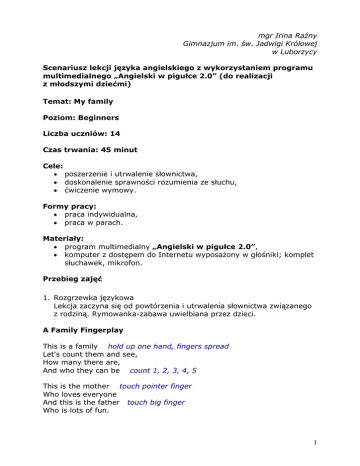 mgr Irina Raźny Gimnazjum im. św. Jadwigi Królowej w Luborzycy Scenariusz lekcji języka angielskiego z wykorzystaniem programu multimedialnego „Angielski w pigułce 2.0” (do realizacji z młodszymi dziećmi) Temat: My family Poziom: Beginners Liczba uczniów: 14 Czas trwania: 45 minut Cele: • poszerzenie i utrwalenie słownictwa, • doskonalenie sprawności rozumienia ze słuchu, • ćwiczenie wymowy. Formy pracy: • praca indywidualna, • praca w parach. Materiały: • program multimedialny „Angielski w pigułce 2.0”, • komputer z dostępem do Internetu wyposażony w głośniki; komplet słuchawek, mikrofon. Przebieg zajęć 1. Rozgrzewka językowa Lekcja zaczyna się od powtórzenia i utrwalenia słownictwa związanego z rodziną. Rymowanka-zabawa uwielbiana przez dzieci. A Family Fingerplay This is a family hold up one hand, fingers spread Let's count them and see, How many there are, And who they can be count 1, 2, 3, 4, 5 This is the mother touch pointer finger Who loves everyone And this is the father touch big finger Who is lots of fun. 1 This is my sister touch ring finger She helps and she plays, And this is the baby touch little finger He's growing each day. But who is this one? touch thumb He's out there alone, Why it's Jackie, the dog, And he's chewing a bone. wiggle thumb Następnie uczniowie powtarzają rymowankę za nauczycielem, naśladując ruchy. 2. Praca z programem multimedialnym „Angielski w pigułce 2.0” Nauczyciel uruchamia program, wybiera prezentację – rodzina. Klikając na głośnik w prawym górnym rogu uczniowie odsłuchują i powtarzają wyrazy. Następnie wykonują kolejne ćwiczenia: rozpoznawanie, dopasowanie, wpisywanie. W celu ilustracji poniżej jest zamieszczony obrazek. Z zakładki menu (lewy dolny róg) wybieramy ćwiczenia. Pracę rozpoczynamy od rozpoznawania ze słuchu, następnie – ćwiczenie wymowy. Rozumienie ze słuchu będzie ostatnim ćwiczeniem. 2 3. Praca z Internetem W celu utrwalenia poznanego słownictwa łączymy się z Internetem: www.thekidzpage.com. Wybieramy zakładkę Learning, następnie Free Educational Games Family Word Search. 4. Podsumowanie pracy. 5. Zadanie domowe Należy wykonać plakat „My Family” i zaprezentować klasie na następnej lekcji. 3
