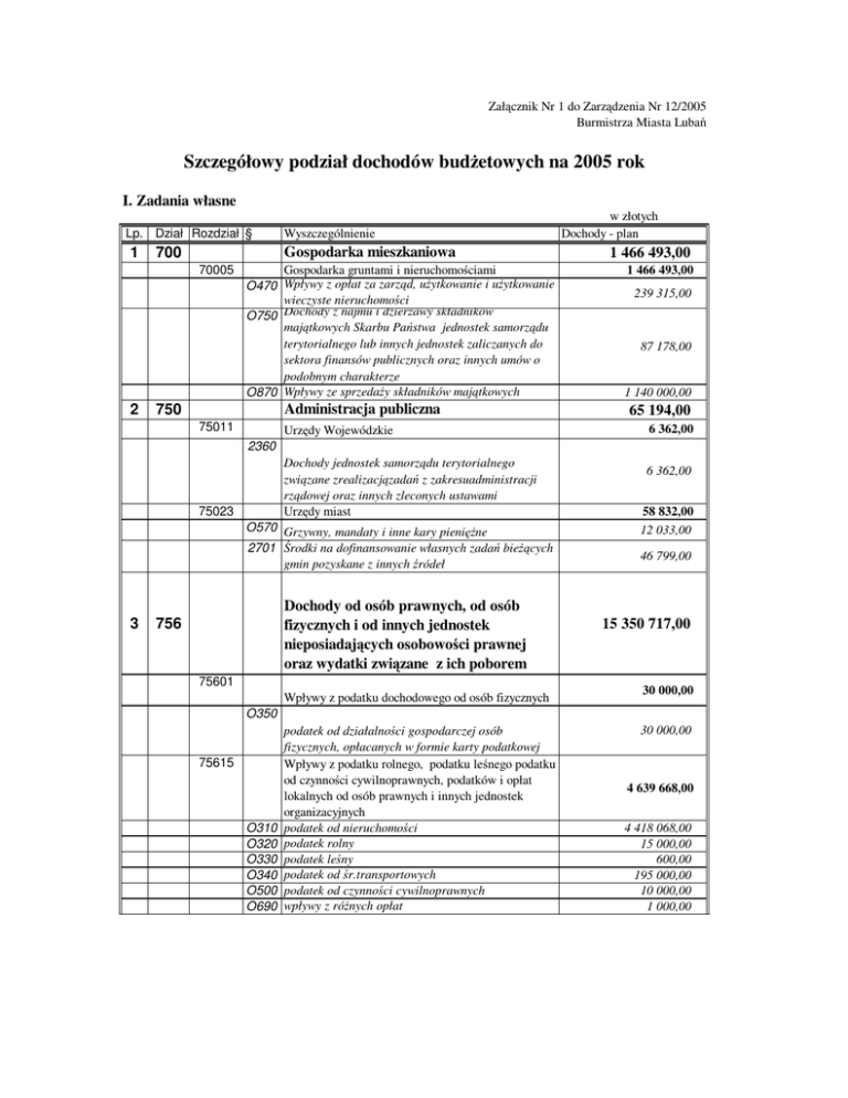 Zał cznik Nr 1 do Zarz dzenia Nr 12/2005 Burmistrza Miasta Luba Szczegółowy podział dochodów bud etowych na 2005 rok I. Zadania własne Lp. Dział Rozdział § 1 2 700 750 Wyszczególnienie Gospodarka mieszkaniowa 70005 Gospodarka gruntami i nieruchomo ciami O470 Wpływy z opłat za zarz d, u ytkowanie i u ytkowanie wieczyste nieruchomo ci O750 Dochody z najmu i dzier awy składników maj tkowych Skarbu Pa stwa jednostek samorz du terytorialnego lub innych jednostek zaliczanych do sektora finansów publicznych oraz innych umów o podobnym charakterze O870 Wpływy ze sprzeda y składników maj tkowych Administracja publiczna 75011 Urz dy Wojewódzkie w złotych Dochody - plan 1 466 493,00 1 466 493,00 239 315,00 87 178,00 1 140 000,00 65 194,00 6 362,00 2360 Dochody jednostek samorz du terytorialnego zwi zane zrealizacj zada z zakresuadministracji rz dowej oraz innych zleconych ustawami Urz dy miast 75023 O570 Grzywny, mandaty i inne kary pieni ne 2701 rodki na dofinansowanie własnych zada bie cych gmin pozyskane z innych ródeł 3 Dochody od osób prawnych, od osób fizycznych i od innych jednostek nieposiadaj cych osobowo ci prawnej oraz wydatki zwi zane z ich poborem 756 75601 Wpływy z podatku dochodowego od osób fizycznych 6 362,00 58 832,00 12 033,00 46 799,00 15 350 717,00 30 000,00 O350 75615 O310 O320 O330 O340 O500 O690 podatek od działalno ci gospodarczej osób fizycznych, opłacanych w formie karty podatkowej Wpływy z podatku rolnego, podatku le nego podatku od czynno ci cywilnoprawnych, podatków i opłat lokalnych od osób prawnych i innych jednostek organizacyjnych podatek od nieruchomo ci podatek rolny podatek le ny podatek od r.transportowych podatek od czynno ci cywilnoprawnych wpływy z ró nych opłat 30 000,00 4 639 668,00 4 418 068,00 15 000,00 600,00 195 000,00 10 000,00 1 000,00 75616 4 758 O310 O320 O330 O340 O360 O370 O430 O450 wpływy z opłaty administracyjnej za czynno ci urz dowe O500 podatek od czynno ci cywilnoprawnych O690 wpływy z ró nych opłat 75618 Wpływy z innych opłat stanowi cych dochody jednostek samorz du terytorialnego na podstawie ustaw O410 wpływy z opłaty skarbowej O460 wpływy z opłaty eksploatacyjnej O480 wpływy z opłat za zezwolenie na sprzeda alkoholu 75621 Udziały gmin w podatkach stanowi cych dochód bud etu pa stwa OO10 podatek dochodowy od osób fizycznych OO20 podatek dochodowy od osób prawnych Ró ne rozliczenia 75801 75807 75809 75831 5 801 6 852 Wpływy z podatku rolnego, podatku le nego, od spadku i darowizn, podatku od czynno ci cywilnoprawnych oraz podatków i opłat lokalnych od osób fizycznych podatek od nieruchomo ci Podatek rolny podatek le ny podatek od r.transportowych podatek od spadków i darowizn podatek od posiadania psów wpływy z opłaty targowej Cz o wiatowa subwencji ogólnej dla jednostek samorz du terytorialnego 2920 subwencje ogólne z bud etu pa stwa Cz wyrównawcza subwencji ogólnej dla gmin 2920 subwencje ogólne z bud etu pa stwa Rozliczenia mi dzy jednostkami samorz du terytorialnego 6610 Dotacje celowe przekazanie gminie lub miastu stołecznemu Warszawie na inwestycje i zakupy inwestycyjne realizowane na podstawie porozumie (umów) mi dzy jednostkami samorz du terytorialnego Cz równowa ca subwencji ogólnej dla gmin 2920 subwencje ogólne z bud etu pa stwa O wiata i wychowanie 80101 Szkoły podstawowe O830 Wpływy z usług 80104 Przedszkola O830 Wpływy z usług 80110 Gimnazja O830 wpływy z usług Pomoc społeczna 85214 zasiłki i pomoc w naturze oraz składki na ubezpieczenia społeczne 2030 Dotacje celowe otrzymane z bud etu pa stwa na realizacj własnych zada bie cych gmin 2 169 127,00 1 300 000,00 77 626,00 200,00 167 186,00 75 518,00 3 857,00 241 689,00 26 351,00 275 000,00 1 700,00 1 023 527,00 490 000,00 203 527,00 330 000,00 7 488 395,00 7 308 395,00 180 000,00 9 477 120,00 7 593 465,00 7 593 465,00 99 441,00 99 441,00 47 584,00 47 584,00 1 736 630,00 1 736 630,00 335 235,00 28 496,00 28 496,00 294 739,00 294 739,00 12 000,00 12 000,00 512 150,00 172 000,00 172 000,00 85219 o rodki pomocy społecznej O970 wpływy z ró nych dochodów 2030 Dotacje celowe otrzymane z bud etu pa stwa na realizacj własnych zada bie cych gmin 85228 Usługi opieku cze i specjalistyczne usługi opieku cze O830 Wpływyw z usług 2360 Dochody jednostek samorz du terytorialnego zwi zane z realizacj zada z zakresu administracji rz dowej oraz innych zleconych ustawami 7 Gospodarka komunalna i ochrona rodowiska 900 90001 Gospodarka ciekowa i ochrona wód 6262 Dotacje otrzymane z funduszy celowych na finansowanie lub dofinansowanie kosztów realizacji inwestycji i zakupów inwestycyjnych jednostek sektora finansów publicznych 6291 rodki na dofinansowanie własnych inwestycji gmin (zwi zków gmin), powiatów (zwi zku powiatów), samorz dów województw, pozyskane z innych ródeł OGÓŁEM zadania własne 326 000,00 4 000,00 322 000,00 14 150,00 14 000,00 150,00 7 206 361,00 7 206 361,00 1 315 000,00 5 891 361,00 34 413 270,00 II. Zadania zlecone z zakresu administracji rz dowej oraz zada z porozumie i innych zada zleconych ustawami - dochody 2005 roku Lp. Dział Rozdział 1 2 3 710 750 71035 75011 751 75101 4 752 § Wyszczególnienie Działalno usługowa Cmentarze 2020 dotacje celowe otrzymane z bud etu pa stwa na zadania bie ce realizowane przez gmin na podstawie porozumie z organami administracji rz dowej.(Cmentarz AR Wojenny) Administracja publiczna Urz dy Wojewódzkie 2010 dotacje celowe otrzymane z bud etu pa stwa na realizacj zada bie cych z zakresu administracji rz dowej oraz innych zada zleconych gminie (zwi zkom gmin) ustawami Urz dy naczelnych organów władzy pa stwowej, kontroli i ochrony prawa oraz s downictwa Urz dy naczelnych organów władzy pa stwowej, kontroli i ochrony prawa 2010 dotacje celowe otrzymane z bud etu pa stwa na realizacj zada bie cych z zakresu administracji rz dowej oraz innych zada zleconych gminie (zwi zkom gmin) ustawami Obrona narodowa w złotych Dochody - plan 3 00