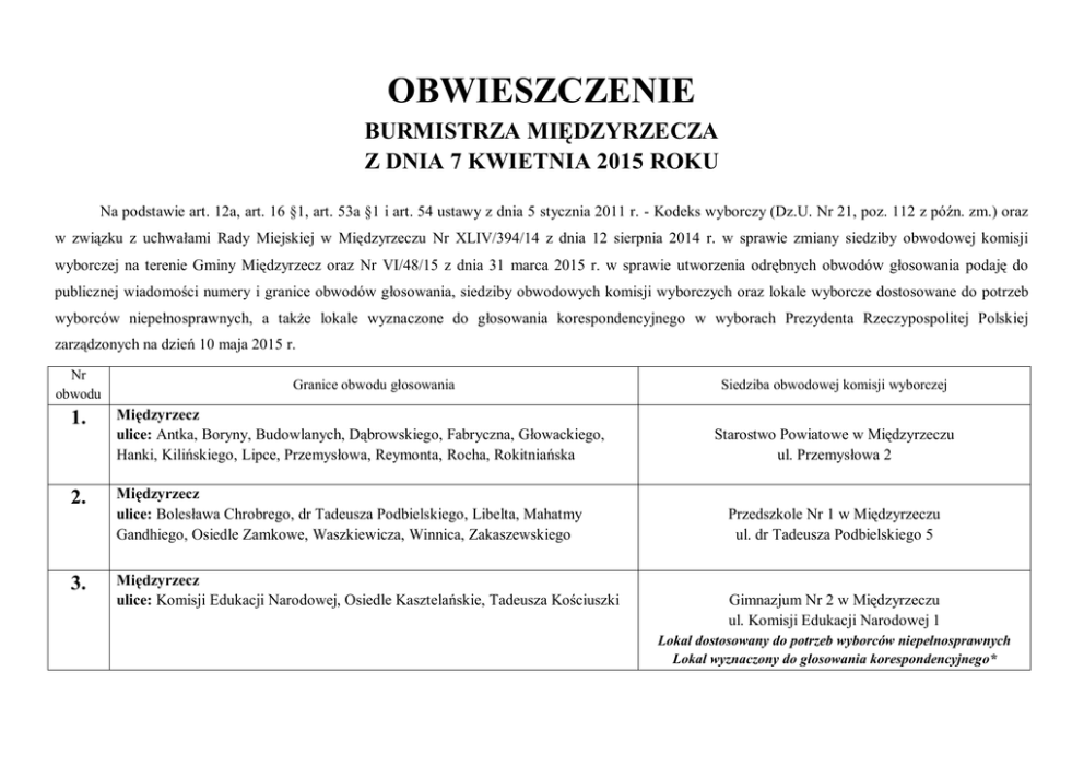 OBWIESZCZENIE BURMISTRZA MIĘDZYRZECZA Z DNIA 7 KWIETNIA 2015 ROKU Na podstawie art. 12a, art. 16 §1, art. 53a §1 i art. 54 ustawy z dnia 5 stycznia 2011 r. - Kodeks wyborczy (Dz.U. Nr 21, poz. 112 z późn. zm.) oraz w związku z uchwałami Rady Miejskiej w Międzyrzeczu Nr XLIV/394/14 z dnia 12 sierpnia 2014 r. w sprawie zmiany siedziby obwodowej komisji wyborczej na terenie Gminy Międzyrzecz oraz Nr VI/48/15 z dnia 31 marca 2015 r. w sprawie utworzenia odrębnych obwodów głosowania podaję do publicznej wiadomości numery i granice obwodów głosowania, siedziby obwodowych komisji wyborczych oraz lokale wyborcze dostosowane do potrzeb wyborców niepełnosprawnych, a także lokale wyznaczone do głosowania korespondencyjnego w wyborach Prezydenta Rzeczypospolitej Polskiej zarządzonych na dzień 10 maja 2015 r. Nr obwodu 1. 2. 3. Granice obwodu głosowania Międzyrzecz ulice: Antka, Boryny, Budowlanych, Dąbrowskiego, Fabryczna, Głowackiego, Hanki, Kilińskiego, Lipce, Przemysłowa, Reymonta, Rocha, Rokitniańska Międzyrzecz ulice: Bolesława Chrobrego, dr Tadeusza Podbielskiego, Libelta, Mahatmy Gandhiego, Osiedle Zamkowe, Waszkiewicza, Winnica, Zakaszewskiego Międzyrzecz ulice: Komisji Edukacji Narodowej, Osiedle Kasztelańskie, Tadeusza Kościuszki Siedziba obwodowej komisji wyborczej Starostwo Powiatowe w Międzyrzeczu ul. Przemysłowa 2 Przedszkole Nr 1 w Międzyrzeczu ul. dr Tadeusza Podbielskiego 5 Gimnazjum Nr 2 w Międzyrzeczu ul. Komisji Edukacji Narodowej 1 Lokal dostosowany do potrzeb wyborców niepełnosprawnych Lokal wyznaczony do głosowania korespondencyjnego* 4. Międzyrzecz ulice: Chopina, Karola Szymanowskiego, Moniuszki, Wojska Polskiego Szkoła Podstawowa Nr 3 w Międzyrzeczu ul. Mickiewicza 5 Lokal dostosowany do potrzeb wyborców niepełnosprawnych Lokal wyznaczony do głosowania korespondencyjnego* 5. 6. 7. 8. Międzyrzecz ulice: Cypriana Kamila Norwida, Jacka Malczewskiego, Józefa Chełmońskiego, Kopernika, Kossaka, Krasińskiego, Marii Konopnickiej, Matejki, Mickiewicza, Słowackiego, Wita Stwosza, Wyspiańskiego Międzyrzecz ulice: Chłodna, Garncarska, Konstytucji 3 Maja, Lipowa, Łąkowa, Młyńska, Ogrodowa, Osiedle Gen. W. Sikorskiego, Podzamcze, Polna, Różana, Rynek, Spokojna, Świerczewskiego, Wesoła Międzyrzecz ulice: 30 Stycznia, Hugo Kołłątaja, Księdza Skargi, Mieczysława Mikuły, Sportowa, Staszica, Szkolna, Ściegiennego Międzyrzecz ulice: Osiedle Centrum od nr 1do nr 4, od nr 9 do nr 19 Przedszkole Nr 6 w Międzyrzeczu ul. Mickiewicza 25 Międzyrzecki Ośrodek Kultury w Międzyrzeczu ul. Konstytucji 3 Maja 30 Lokal dostosowany do potrzeb wyborców niepełnosprawnych Lokal wyznaczony do głosowania korespondencyjnego* Gimnazjum Nr 1 w Międzyrzeczu ul. Staszica 22 A Międzyrzecki Ośrodek Kultury w Międzyrzeczu ul. Konstytucji 3 Maja 30 Lokal dostosowany do potrzeb wyborców niepełnosprawnych Lokal wyznaczony do głosowania korespondencyjnego* 9. Międzyrzecz ulice: Kwiatowa, Marcinkowskiego, Osiedle Centrum od nr 5 do nr 7, Pamiątkowa, Plac Powstańców Wielkopolskich, Rolna, Sienkiewicza, Stoczniowców Gdańskich 1970 Zespół Szkół Budowlanych w Międzyrzeczu ul. Marcinkowskiego 26 10. Międzyrzecz ulice: Poznańska Samodzielny Publiczny Szpital dla Nerwowo i Psychicznie Chorych w Międzyrzeczu ul. Poznańska 109 Pawilon IV – Klub Chorych Lokal dostosowany do potrzeb wyborców niepełnosprawnych Lokal wyznaczony do głosowania korespondencyjnego* 11. 12. 13. 14. 15. 16. 17. Miejscowości: Kaława, Pniewo, Szumiąca, Wysoka Szkoła Podstawowa w Kaławie 92 Miejscowości: Bukowiec, Czarny Bocian, Wyszanowo Szkoła Podstawowa w Bukowcu 61 Miejscowości: Bobowicko, Karolewo, Kuligowo, Kuźnik, Łęgowskie, Marianowo, Międzyrzecz - Wybudowanie, Skoki, Żółwin Miejscowości: Brzozowy Ług, Głębokie, Jagielnik, Jeleniegłowy, Kalsko, Kęszyca - Kolonia, Kolonia Żółwin, Kwiecie, Lubosinek, Porąbka, Rojewo, Święty Wojciech, Wojciechówek Miejscowości: Kęszyca, Kęszyca Leśna, Nietoperek Miejscowości: Gorzyca, Kursko, Pieski, Zamostowo Międzyrzecz ulice: Piastowska Zespół Szkół Centrum Kształcenia Rolniczego w Bobowicku ul. Międzyrzecka 7a Zespół Szkół Ekonomicznych w Międzyrzeczu ul. Libelta 4 Remiza Ochotniczej Straży Pożarnej w Kęszycy Leśnej 56 Centrum Rekreacyjno-Sportowe w Gorzycy 36 Ośrodek Szkolenia i Wychowania Ochotnicze Hufce Pracy w Międzyrzeczu ul. Piastowska 18 18. 19. 20. 21. 22. Międzyrzecz ulice: Bolesława Prusa, Jana Zamoyskiego, Pięciu Świętych Braci Międzyrzeckich, Stanisława Ożoga, Zachodnia Międzyrzecz ulice: Aleksandra Zawadzkiego, Alfa Kowalskiego, Długa, Krótka, Ks. Inf. Henryka Guzowskiego, Leśna, L. Kiszmanowicza, Marcelego Nowotki, Rzemieślnicza, Słoneczna, Sybiraka, Żołnierska Międzyrzecz Szpital Międzyrzecki Sp. z o. o. w Międzyrzeczu, ul. Konstytucji 3 Maja 35 Międzyrzecz Areszt Śledczy w Międzyrzeczu, ul. Młyńska 21 Międzyrzecz Samodzielny Publiczny Szpital dla Nerwowo i Psychicznie Chorych w Międzyrzeczu, ul. Poznańska 109 Przedszkole Nr 4 w Międzyrzeczu ul. Zachodnia 8 Nadleśnictwo Międzyrzecz w Międzyrzeczu ul. Poznańska 38 Lokal dostosowany do potrzeb wyborców niepełnosprawnych Lokal wyznaczony do głosowania korespondencyjnego* Szpital Międzyrzecki Sp. z o. o. w Międzyrzeczu ul. Konstytucji 3 Maja 35 Areszt Śledczy w Międzyrzeczu ul. Młyńska 21 Samodzielny Publiczny Szpital dla Nerwowo i Psychicznie Chorych w Międzyrzeczu Pawilon IV – Klub Chorych ul. Poznańska 109 (wejście główne) * Wyborca niepełnosprawny o znacznym lub umiarkowanym stopniu niepełnosprawności w rozumieniu ustawy z dnia 27 sierpnia 1997 r. o rehabilitacji zawodowej i społecznej oraz zatrudnianiu osób niepełnosprawnych oraz wyborca, który najpóźniej w dniu głosowania kończy 75 lat może udzielić pełnomocnictwa do głosowania w jego imieniu. Akt pełnomocnictwa do głosowania sporządza się na wniosek wyborcy wniesiony do burmistrza, 