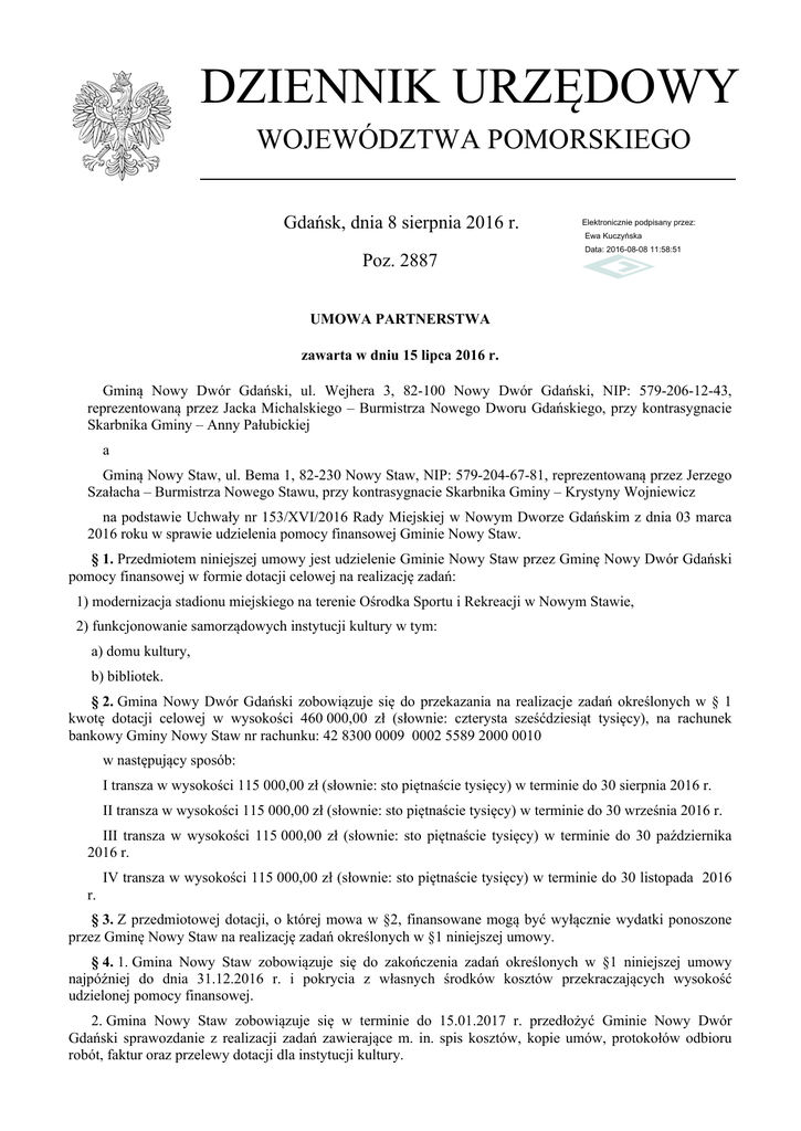 DZIENNIK URZĘDOWY WOJEWÓDZTWA POMORSKIEGO Gdańsk, dnia 8 sierpnia 2016 r. Elektronicznie podpisany przez: Ewa Kuczyńska Poz. 2887 Data: 2016-08-08 11:58:51 UMOWA PARTNERSTWA zawarta w dniu 15 lipca 2016 r. Gminą Nowy Dwór Gdański, ul. Wejhera 3, 82-100 Nowy Dwór Gdański, NIP: 579-206-12-43, reprezentowaną przez Jacka Michalskiego – Burmistrza Nowego Dworu Gdańskiego, przy kontrasygnacie Skarbnika Gminy – Anny Pałubickiej a Gminą Nowy Staw, ul. Bema 1, 82-230 Nowy Staw, NIP: 579-204-67-81, reprezentowaną przez Jerzego Szałacha – Burmistrza Nowego Stawu, przy kontrasygnacie Skarbnika Gminy – Krystyny Wojniewicz na podstawie Uchwały nr 153/XVI/2016 Rady Miejskiej w Nowym Dworze Gdańskim z dnia 03 marca 2016 roku w sprawie udzielenia pomocy finansowej Gminie Nowy Staw. § 1. Przedmiotem niniejszej umowy jest udzielenie Gminie Nowy Staw przez Gminę Nowy Dwór Gdański pomocy finansowej w formie dotacji celowej na realizację zadań: 1) modernizacja stadionu miejskiego na terenie Ośrodka Sportu i Rekreacji w Nowym Stawie, 2) funkcjonowanie samorządowych instytucji kultury w tym: a) domu kultury, b) bibliotek. § 2. Gmina Nowy Dwór Gdański zobowiązuje się do przekazania na realizacje zadań określonych w § 1 kwotę dotacji celowej w wysokości 460 000,00 zł (słownie: czterysta sześćdziesiąt tysięcy), na rachunek bankowy Gminy Nowy Staw nr rachunku: 42 8300 0009 0002 5589 2000 0010 w następujący sposób: I transza w wysokości 115 000,00 zł (słownie: sto piętnaście tysięcy) w terminie do 30 sierpnia 2016 r. II transza w wysokości 115 000,00 zł (słownie: sto piętnaście tysięcy) w terminie do 30 września 2016 r. III transza w wysokości 115 000,00 zł (słownie: sto piętnaście tysięcy) w terminie do 30 października 2016 r. IV transza w wysokości 115 000,00 zł (słownie: sto piętnaście tysięcy) w terminie do 30 listopada 2016 r. § 3. Z przedmiotowej dotacji, o której mowa w §2, finansowane mogą być wyłącznie wydatki ponoszone przez Gminę Nowy Staw na realizację zadań określonych w §1 niniejszej umowy. § 4. 1. Gmina Nowy Staw zobowiązuje się do zakończenia zadań określonych w §1 niniejszej umowy najpóźniej do dnia 31.12.2016 r. i pokrycia z własnych środków kosztów przekraczających wysokość udzielonej pomocy finansowej. 2. Gmina Nowy Staw zobowiązuje się w terminie do 15.01.2017 r. przedłożyć Gminie Nowy Dwór Gdański sprawozdanie z realizacji zadań zawierające m. in. spis kosztów, kopie umów, protokołów odbioru robót, faktur oraz przelewy dotacji dla instytucji kultury. Dziennik Urzędowy Województwa Pomorskiego –2– Poz. 2887 3. Przedmiotem rozliczenia mogą być wydatki poniesione w roku budżetowym 2016 przed datą podpisania porozumienia. § 5. W trakcie obowiązywania porozumienia i po jego wygaśnięciu osoba upoważniona przez Gminę Nowy Dwór Gdański może przeprowadzić kontrolę w zakresie: a) celowości wydatkowania przekazanej pomocy finansowej, b) oceny prawidłowości dokonania rozliczeń finansowych. § 6. Wszelkie zmiany niniejszej umowy wymagają dla swej ważności formy pisemnej. § 7. W sprawach nieuregulowanych niniejszym porozumieniem zastosowanie mają przepisy ustawy o finansach publicznych. § 8. Niniejsze porozumienie zostało sporządzone w czterech jednobrzmiących egzemplarzach po dwa dla każdej strony. Burmistrz Nowego Dworu Gdańskiego Burmistrz Nowego Stawu Jerzy Szałach Jacek Michalski Skarbnik Gminy Skarbnik Gminy Anna Pałubicka Krystyna Wojniewicz