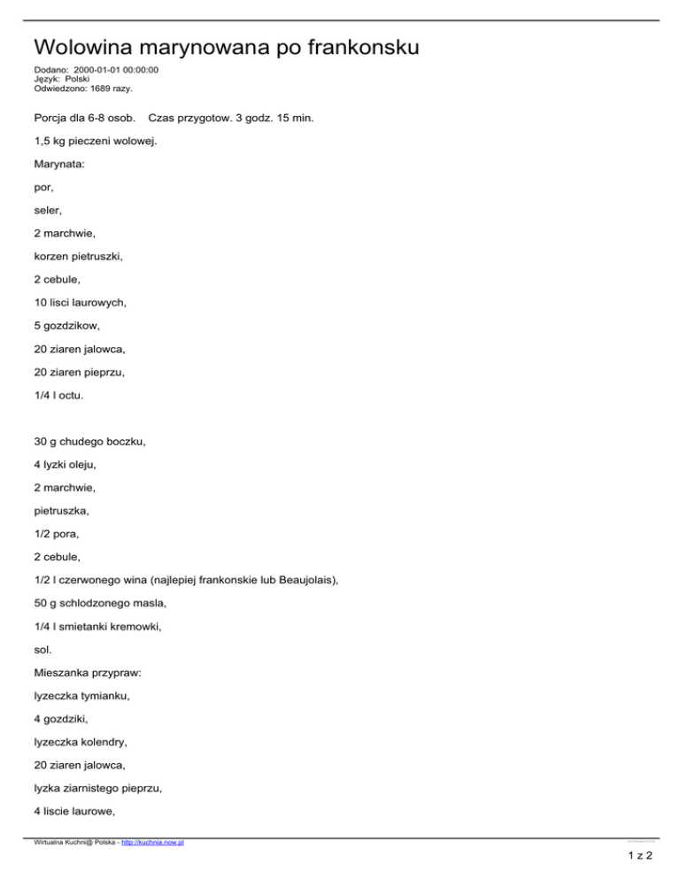 Wolowina marynowana po frankonsku Dodano: 2000-01-01 00:00:00 Język: Polski Odwiedzono: 1689 razy. Porcja dla 6-8 osob. Czas przygotow. 3 godz. 15 min. 1,5 kg pieczeni wolowej. Marynata: por, seler, 2 marchwie, korzen pietruszki, 2 cebule, 10 lisci laurowych, 5 gozdzikow, 20 ziaren jalowca, 20 ziaren pieprzu, 1/4 l octu. 30 g chudego boczku, 4 lyzki oleju, 2 marchwie, pietruszka, 1/2 pora, 2 cebule, 1/2 l czerwonego wina (najlepiej frankonskie lub Beaujolais), 50 g schlodzonego masla, 1/4 l smietanki kremowki, sol. Mieszanka przypraw: lyzeczka tymianku, 4 gozdziki, lyzeczka kolendry, 20 ziaren jalowca, lyzka ziarnistego pieprzu, 4 liscie laurowe, Wirtualna Kuchni@ Polska - http://kuchnia.now.pl przepis nr 6199, plik wygenerowano 2017.03.03 00:02 1z2 skorka z 1/4 cytryny pocieta w cienkie paseczki. 1. Mieso oczyscic z powiezi i zyl. Grubo pokrojone warzywa do marynaty, przyprawy, ocet i 1/2 l wody wlac do duzego naczynia. Wlozyc mieso tak, by bylo przykryte plynem, przykryc i zostawic na 2 dni w chlodnym miejscu. 2. Przed duszeniem mieso dobrze osaczyc, natrzec sola i zrumienic na oleju z dodatkiem kawalka boczku. Jarzyny do duszenia (marchew, pietruszka, por, cebula) nalezy grubo pokroic i zrumienic obok miesa. Dodac 1/4 l marynaty i wino. Mieszanke przypraw zawinac w worek z gazy i obwiazac dlugim sznurkiem. Powiesic w naczyniu do pieczenia tak, by przyprawy byly zanurzone w plynie. Na powierzchni miesa polozyc kawalki masla. Dusic w piecu pod przykryciem ok. 2 godz. w temp. 225żC. 30 min przed koncem dodac smietanke. 3. Mieso, worek i boczek wyjac z garnka. Reszte zmiksowac i przetrzec przez sito. Jezeli sos jest za rzadki - wygotowac. 4. Pokrojona cienko pieczen polac sosem. Podawac z kluskami frankonskimi z ziemniakow. Źródło: Encyklopedia sztuki kulinarnej, tom 7 "Kuchnia niemiecka", strona 44. From: [email protected] (Radku's De Apaczu's) Wirtualna Kuchni@ Polska - http://kuchnia.now.pl przepis nr 6199, plik wygenerowano 2017.03.03 00:02 2z2