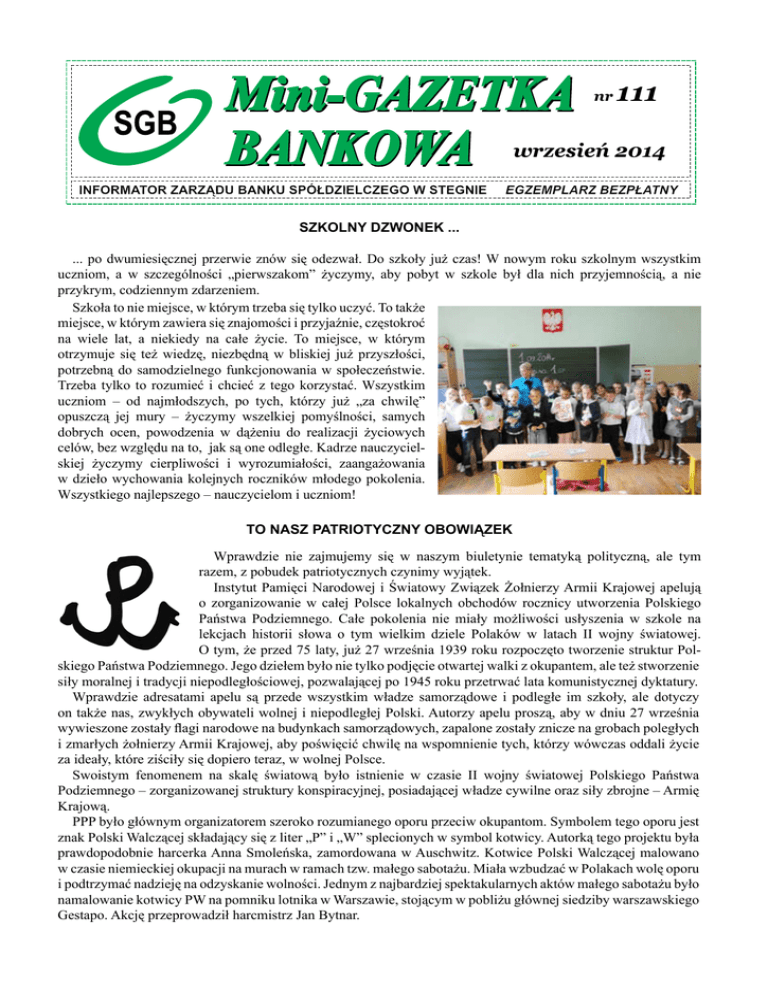 nr 111 wrzesień 2014 SZKOLNY DZWONEK ... ... po dwumiesięcznej przerwie znów się odezwał. Do szkoły już czas! W nowym roku szkolnym wszystkim uczniom, a w szczególności „pierwszakom” życzymy, aby pobyt w szkole był dla nich przyjemnością, a nie przykrym, codziennym zdarzeniem. Szkoła to nie miejsce, w którym trzeba się tylko uczyć. To także miejsce, w którym zawiera się znajomości i przyjaźnie, częstokroć na wiele lat, a niekiedy na całe życie. To miejsce, w którym otrzymuje się też wiedzę, niezbędną w bliskiej już przyszłości, potrzebną do samodzielnego funkcjonowania w społeczeństwie. Trzeba tylko to rozumieć i chcieć z tego korzystać. Wszystkim uczniom – od najmłodszych, po tych, którzy już „za chwilę” opuszczą jej mury – życzymy wszelkiej pomyślności, samych dobrych ocen, powodzenia w dążeniu do realizacji życiowych celów, bez względu na to, jak są one odległe. Kadrze nauczycielskiej życzymy cierpliwości i wyrozumiałości, zaangażowania w dzieło wychowania kolejnych roczników młodego pokolenia. Wszystkiego najlepszego – nauczycielom i uczniom! TO NASZ PATRIOTYCZNY OBOWIĄZEK Wprawdzie nie zajmujemy się w naszym biuletynie tematyką polityczną, ale tym razem, z pobudek patriotycznych czynimy wyjątek. Instytut Pamięci Narodowej i Światowy Związek Żołnierzy Armii Krajowej apelują o zorganizowanie w całej Polsce lokalnych obchodów rocznicy utworzenia Polskiego Państwa Podziemnego. Całe pokolenia nie miały możliwości usłyszenia w szkole na lekcjach historii słowa o tym wielkim dziele Polaków w latach II wojny światowej. O tym, że przed 75 laty, już 27 września 1939 roku rozpoczęto tworzenie struktur Polskiego Państwa Podziemnego. Jego dziełem było nie tylko podjęcie otwartej walki z okupantem, ale też stworzenie siły moralnej i tradycji niepodległościowej, pozwalającej po 1945 roku przetrwać lata komunistycznej dyktatury. Wprawdzie adresatami apelu są przede wszystkim władze samorządowe i podległe im szkoły, ale dotyczy on także nas, zwykłych obywateli wolnej i niepodległej Polski. Autorzy apelu proszą, aby w dniu 27 września wywieszone zostały flagi narodowe na budynkach samorządowych, zapalone zostały znicze na grobach poległych i zmarłych żołnierzy Armii Krajowej, aby poświęcić chwilę na wspomnienie tych, którzy wówczas oddali życie za ideały, które ziściły się dopiero teraz, w wolnej Polsce. Swoistym fenomenem na skalę światową było istnienie w czasie II wojny światowej Polskiego Państwa Podziemnego – zorganizowanej struktury konspiracyjnej, posiadającej władze cywilne oraz siły zbrojne – Armię Krajową. PPP było głównym organizatorem szeroko rozumianego oporu przeciw okupantom. Symbolem tego oporu jest znak Polski Walczącej składający się z liter „P” i „W” splecionych w symbol kotwicy. Autorką tego projektu była prawdopodobnie harcerka Anna Smoleńska, zamordowana w Auschwitz. Kotwice Polski Walczącej malowano w czasie niemieckiej okupacji na murach w ramach tzw. małego sabotażu. Miała wzbudzać w Polakach wolę oporu i podtrzymać nadzieję na odzyskanie wolności. Jednym z najbardziej spektakularnych aktów małego sabotażu było namalowanie kotwicy PW na pomniku lotnika w Warszawie, stojącym w pobliżu głównej siedziby warszawskiego Gestapo. Akcję przeprowadził harcmistrz Jan Bytnar. WESTERN UNION - NIE TAK PRĘDKO W numerze 109 naszej Gazetki zapowiedziane zostało wdrożenie w naszym Banku, w terminie do końca sierpnia, nowej usługi – przekazów pieniężnych w systemie obsługiwanym przez znaną, o światowej renomie, firmę WESTERN UNION. Z przykrością informujemy, że z przyczyn natury formalnej, nie leżących po naszej stronie (u nas wszystko jest przygotowane), termin wprowadzenia tej usługi uległ przesunięciu. Co gorsze – nie wiadomo kiedy usługa będzie wdrożona, ponieważ firma WU, uzupełniając jakieś formalności, nie podaje nowego terminu uruchomienia współpracy. PIENIĄDZE CZEKAJĄ ... ... na decyzje udziałowców – czy należność z tytułu dywidendy za miniony rok dopisać do udziałów (i – w razie potrzeby – zostanie uzupełniona do kolejnego, pełnego udziału), czy ma być wypłacona osobie zainteresowanej. Prosimy o załatwienie sprawy w możliwie szybkim terminie, bo pod koniec roku księgowość ma poważne spiętrzenie zadań i szkoda czasu na absorbowanie sprawą, która już dawno powinna być załatwiona. Zapraszamy, sprawę można załatwić w każdej naszej placówce. I ODJECHAŁ W SINĄ DAL ... ... samochód służbowy, który (o czym pisaliśmy w poprzednim numerze) wystawiony został do sprzedaży w drodze przetargu. Przebieg 240 tys. kilometrów i ośmioletni okres wysługi sprawiły, że nie było tłumu chętnych. Auto eksploatowane było poprawnie, serwisowane w autoryzowanej stacji obsługi, garażowane, ale czasy, kiedy przy takiej okazji zainteresowani licytowali w górę – dawno już minęły. Za pierwotnie proponowaną cenę chętnych nie było, dopiero po dokonanej zgodnie z przepisami obniżce ceny do 6,5 tys. zł znalazła się osoba zainteresowana. Samochód kupiła mieszkanka Elbląga. Nowej właścicielce życzymy satysfakcji z nowego nabytku i bezawaryjnej eksploatacji. POMOGLIŚMY PRZY FESTYNACH W miesiącach letnich, w różnych miejscowościach na terenie działania naszego Banku organizowane były, staraniem miejscowych organizacji społecznych, festyny rodzinne adresowane zarówno do tej młodszej, jak i starszej części społeczności. Jak zwykle w takim przypadku trzeba było poszukać sponsorów, a wiadomo, że nasz Bank tradycyjnie już wspomaga organizatorów takich imprez. Nie obeszło się więc i tym razem bez bankowego sponsoringu. Swój skromny udział miał nasz Bank w dofinansowaniu organizacji takich imprez jak: w Sztutowie – na stadionie w dniu 1 sierpnia, w Żuławkach w dniu 9 sierpnia, a w świąteczny cz