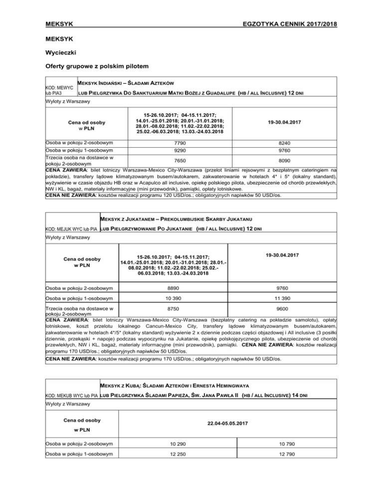 MEKSYK EGZOTYKA CENNIK 2017/2018 MEKSYK Wycieczki Oferty grupowe z polskim pilotem MEKSYK INDIAŃSKI – ŚLADAMI AZTEKÓW KOD: MEWYC LUB PIELGRZYMKA DO SANKTUARIUM MATKI BOŻEJ Z GUADALUPE (HB / ALL INCLUSIVE) 12 DNI lub PIA3 Wyloty z Warszawy 15-26.10.2017; 04-15.11.2017; 14.01.-25.01.2018; 20.01.-31.01.2018; 28.01.-08.02.2018; 11.02.-22.02.2018; 25.02.-06.03.2018; 13.03.-24.03.2018 19-30.04.2017 Osoba w pokoju 2-osobowym 7790 8240 Osoba w pokoju 1-osobowym 9290 Cena od osoby w PLN 9760 Trzecia osoba na dostawce w 7650 8090 pokoju 2-osobowym CENA ZAWIERA: bilet lotniczy Warszawa-Mexico City-Warszawa (przelot liniami rejsowymi z bezpłatnym cateringiem na pokładzie), transfery lądowe klimatyzowanym busem/autokarem, zakwaterowanie w hotelach 4* i 5* (lokalny standard), wyżywienie w czasie objazdu HB oraz w Acapulco all inclusive, opiekę polskiego pilota, ubezpieczenie od chorób przewlekłych, NW i KL, bagaż, materiały informacyjne (mini przewodnik), pamiątki, opłaty lotniskowe. CENA NIE ZAWIERA: kosztów realizacji programu 120 USD/os.; obligatoryjnych napiwków 50 USD/os. MEKSYK Z JUKATANEM – PREKOLUMBIJSKIE SKARBY JUKATANU KOD: MEJUK WYC lub PIA LUB PIELGRZYMOWANIE PO JUKATANIE (HB / ALL INCLUSIVE) 12 DNI Wyloty z Warszawy 15-26.10.2017; 04-15.11.2017; 14.01.-25.01.2018; 20.01.-31.01.2018; 28.01.08.02.2018; 11.02.-22.02.2018; 25.02.06.03.2018; 13.03.-24.03.2018 19-30.04.2017 Osoba w pokoju 2-osobowym 8890 9760 Osoba w pokoju 1-osobowym 10 390 11 390 Cena od osoby w PLN Trzecia osoba na dostawce w 8750 9600 pokoju 2-osobowym CENA ZAWIERA: bilet lotniczy Warszawa-Mexico City-Warszawa (bezpłatny catering na pokładzie samolotu), opłaty lotniskowe, koszt przelotu lokalnego Cancun-Mexico City, transfery lądowe klimatyzowanym busem/autokarem, zakwaterowanie w hotelach 4*/5* (lokalny standard) wyżywienie 2 x dziennie podczas części objazdowej i All inclusive (3 posiłki dziennie, przekąski + napoje) podczas wypoczynku na Jukatanie, opiekę polskojęzycznego pilota, ubezpieczenie od chorób przewlekłych, NW i KL, bagaż, materiały informacyjne (mini przewodnik), pamiątki. CENA NIE ZAWIERA: kosztów realizacji programu 170 USD/os.; obligatoryjnych napiwków 50 USD/os. CENA NIE ZAWIERA: kosztów realizacji programu 170 USD/os.; obligatoryjnych napiwków 50 USD/os. MEKSYK Z KUBĄ: ŚLADAMI AZTEKÓW I ERNESTA HEMINGWAYA KOD: MEKUB WYC lub PIA LUB PIELGRZYMKA ŚLADAMI PAPIEŻA, ŚW. JANA PAWŁA II (HB / ALL INCLUSIVE) 14 DNI Wyloty z Warszawy Cena od osoby 22.04-05.05.2017 w PLN Osoba w pokoju 2-osobowym 10 290 10 790 Osoba w pokoju 1-osobowym 12 250 12 790 MEKSYK EGZOTYKA CENNIK 2017/2018 CENA ZAWIERA: bilet lotniczy Warszawa-Mexico City/Havana-Warszawa (z bezpłatnym cateringiem na pokładzie samolotu) oraz opłaty lotniskowe, koszt wizy kubańskiej, koszt przelotu Mexico City-Hawana, transfery lądowe klimatyzowanym busem/autokarem, zakwaterowanie w hotelach 3*/4*/5* (lokalny standard), wyżywienie 2 x dziennie podczas objazdu i All inclusive w Varadero (3 posiłki dziennie, przekąski + napoje), opiekę polskojęzycznego pilota, ubezpieczenie KL, NW, bagaż, od chorób przewlekłych, materiały informacyjne (mini przewodnik). CENA NIE ZAWIERA: kosztów realizacji programu 400 USD/os obligatoryjnych napiwków 50 USD/os., opłaty wyjazdowej z Kuby 25 USD/os. CENA NIE ZAWIERA: kosztów realizacji programu 460 USD/os.; obligatoryjnych napiwków 50 USD/os., opłaty wylotowej z Kuby 25 USD Oferty indywidualne realizowane od 2 osób KOD: MEGWA MEKSYK Z GWATEMALĄ (ZGODNIA Z PROGRAMEM) 12 DNI Wyloty z Warszawy Cena od osoby 14-25.03.2017 w PLN Osoba w pokoju 2-osobowym 1920 USD Osoba w pokoju 1-osobowym Na zapytanie CENA ZAWIERA:, koszt przelotu lokalnego Cancun-Mexico City, transfery lądowe klimatyzowanym busem/autokarem, zakwaterowanie w hotelach 4* (lokalny standard) wyżywienie 2 x dziennie podczas części objazdowej i All inclusive (3 posiłki dziennie, przekąski + napoje) podczas wypoczynku na Jukatanie, opiekę polskiego przewodnika, ubezpieczenie od NW i KL, chorób przewlekłych, bagaż, materiały informacyjne (mini przewodnik), pamiątki. CENA NIE ZAWIERA: biletu lotniczego Warszawa-Gwatemala City/Cancun-Warszawa, napoi do posiłków, napiwków MEKSYK Z PUERTO VALLARTA – TEQUILA, POR FAVOR! KOD: METPF (ZGODNIA Z PROGRAMEM) 10 DNI Wyloty z Warszawy Cena od osoby w PLN 14-23.03.2017 Osoba w pokoju 2-osobowym 2395 USD Osoba w pokoju 1-osobowym Na zapytanie CENA ZAWIERA: transfery lądowe klimatyzowanym samochodem, zakwaterowanie w hotelach 3* i 4* (lokalny standard) wyżywienie śniadania, opiekę anglojęzycznego przewodnika, ubezpieczenie od chorób przewlekłych, NW i KL, choroby przewlekłe, bagaż, materiały informacyjne CENA NIE ZAWIERA: bilet lotniczy Warszawa-Puerto Vallarta–Warszawa, dodatkowych posiłków, napiwków, wydatków własnych UWAGI: 1. Cena przelotu została podana w najniższej taryfie obowiązującej na przelot w okresie ważności powyższej taryfy. W przypadku niedostępności tej taryfy istnieje możliwość rezerwacji biletu w innej wyższej – za odpowiednią dopłatą. 2. Przy wylotach w okresie „Wysokiego Sezonu” (najczęściej jest to okres Świąt Bożego Narodzenia oraz Świąt Wielkanocnych) obowiązuje dopłata do biletu lotniczego (zgodnie z taryfą linii lotniczej, na której został zarezerwowany przelot). 3. Płatności można dokonać zarówno w walucie PLN jak i USD (na oddzielne konto dolarowe naszego biura). 4. Istnieje możliwość wykupienia dodatkowego ubezpieczenia od kosztów rezygnacji 3,2%. 5. Cena została skalkulowana przy minimum 30 osobach. 6. Cena została skalkulowana wg kursu sprzedaży USD Banku PEKAO SA = 3,8 zł. 7. Za pokój 3-osobowy w Meksyku uważa się pokój z dwoma łóżkami małżeńskimi.