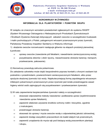 Państw ow y Powiatowy Inspektor Sanitarny w Wieluniu ul. POW 14, 98-300 Wieluń e-mail: w [email protected] telef on: 43 843-40-70, 43 843-39-21, f ax: 43 843-40-35 NOROWIRUSY W ŻYWNOŚCI INFORMACJA DLA PLANTATORÓW I PUNKTÓW SKUPU W związku ze znacznym wzrostem powiadomień zgłaszanych do systemu RASFF (System Wczesnego Ostrzegania o Niebezpiecznych Produktach Żywnościowych i Środkach Żywienia Zwierząt) dotyczących zakażeń owoców w szczególności truskawek i malin pochodzących z Polski, patogennymi wirusami przenoszonymi przez żywność, Państwowy Powiatowy Inspektor Sanitarny w Wieluniu informuje: 1) skażenie owoców norowirusami następuje głównie na etapach produkcji pierwotnej tj.podczas: • uprawy owoców (nawożenie pól fekaliami, nawadnianie zanieczyszczoną wodą), • pozyskiwania zbiorów ( zbiór ręczny, niezachowanie okresów karencji, transport, przetwarzanie, pakowanie). 2) Norowirusy powodują zatrucia pokarmowe. Do zakażenia człowieka może dojść bezpośrednio poprzez kontakt z chorymi osobami lub pośrednio z przedmiotami, powierzchniami zanieczyszczonymi fekaliami, albo przez spożycie skażonej żywności lub wody. Najskuteczniejszą formą zapobiegania wirusowym infekcjom pokarmowym przenoszonym przez żywność jest ścisłe przestrzeganie zasad higieny wśród osób zajmujących się pozyskiwaniem i przetwarzaniem żywności. 3) W celu zapewnienia bezpieczeństwa żywności należy w szczególności: • stosować odpowiednie metody nawożenia i podlewania upraw (wyeliminowanie nawożenia upraw fekaliami), • zapewnić właściwe używanie środków ochrony roślin i biocydów, zgodnie z instrukcjami, • przestrzegać okresów karencji, • stosować do uprawy i mycia owoców wodę o odpowiedniej jakości zdrowotnej, • zapewnić dostęp wszystkim pracownikom do toalet stałych lub przenośnych, • zapewnić urządzenia do mycia rąk pod bieżącą wodą pracownikom plantacji i skupu, • zapewnić czystą odzież przy wykonywaniu pracy, • zapewnić czysty sprzęt i opakowania do zbioru owoców, • wykorzystywać do przewozu owoców transportery i/lub kontenery utrzymane w czystości i dobrej kondycji technicznej, aby chronić środki spożywcze przed zanieczyszczeniem, • respektować zakaz pracy dla osób z objawami takimi jak: biegunka, wymioty, temperatura lub żółtaczka, • zakazać wejścia osób nieupoważnionych w tym dzieci, • przestrzegać stosowania przez pracowników zasad Dobrej Praktyki Higienicznej, Produkcyjnej i Rolniczej (GHP,GMP,GAP), • prowadzić szkolenia pracowników na temat ryzyka zdrowotnego. 4) Rolnicy produkujący lub zbierający produkty roślinne powinni prowadzić dokumentację dotyczącą stosowania środków ochrony roślin i biocydów, występowania szkodników lub chorób, które mogą zagrozić bezpieczeństwu produktów pochodzenia roślinnego. Egzekwowanie zasad higieny podczas zbioru truskawek i malin powinno być wymagane na bieżąco ! Nieprzestrzeganie warunków higienicznych na plantacjach jest kryterium dyskwalifikującym towar w związku z czym nie powinien być on przyjęty do punktu skupu. PRZYPOMNIENIE Podmioty prowadzące produkcję pierwotną pochodzenia roślinnego oraz podmioty prowadzące sprzedaż bezpośrednią tych produktów obowiązane są złożyć wniosek o wpis do Rejestru zakładów podlegających urzędowej kontroli organów Państwowej Inspekcji Sanitarnej zgodnie z art. 61 i art. 63 ust. 2 i 3 ustawy z dnia 25 sierpnia 2006r. o bezpieczeństwie żywności i żywienia (t.j. Dz.U. z 2010r. nr 136 poz. 914 z późn.zm.).