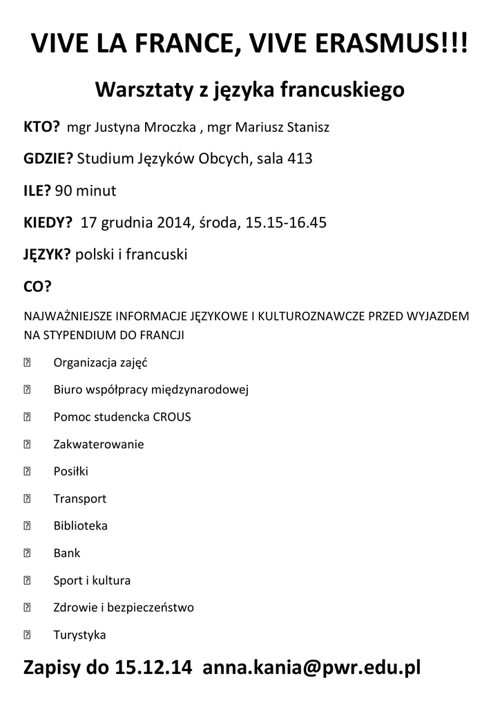 VIVE LA FRANCE, VIVE ERASMUS!!! Warsztaty z języka francuskiego KTO? mgr Justyna Mroczka , mgr Mariusz Stanisz GDZIE? Studium Języków Obcych, sala 413 ILE? 90 minut KIEDY? 17 grudnia 2014, środa, 15.15-16.45 JĘZYK? polski i francuski CO? NAJWAŻNIEJSZE INFORMACJE JĘZYKOWE I KULTUROZNAWCZE PRZED WYJAZDEM NA STYPENDIUM DO FRANCJI Organizacja zajęć Biuro współpracy międzynarodowej Pomoc studencka CROUS Zakwaterowanie Posiłki Transport Biblioteka Bank Sport i kultura Zdrowie i bezpieczeństwo Turystyka Zapisy do 15.12.14 [email protected]