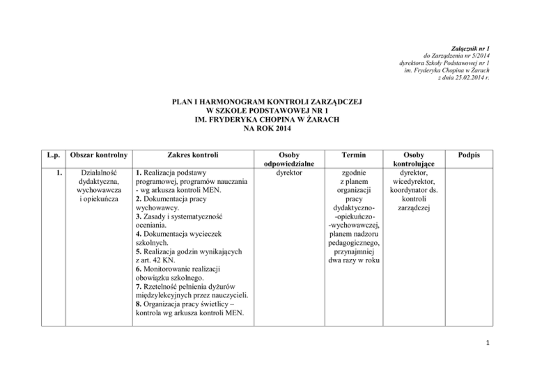 Załącznik nr 1 do Zarządzenia nr 5/2014 dyrektora Szkoły Podstawowej nr 1 im. Fryderyka Chopina w Żarach z dnia 25.02.2014 r. PLAN I HARMONOGRAM KONTROLI ZARZĄDCZEJ W SZKOLE PODSTAWOWEJ NR 1 IM. FRYDERYKA CHOPINA W ŻARACH NA ROK 2014 L.p. 1. Obszar kontrolny Zakres kontroli Działalność dydaktyczna, wychowawcza i opiekuńcza 1. Realizacja podstawy programowej, programów nauczania - wg arkusza kontroli MEN. 2. Dokumentacja pracy wychowawcy. 3. Zasady i systematyczność oceniania. 4. Dokumentacja wycieczek szkolnych. 5. Realizacja godzin wynikających z art. 42 KN. 6. Monitorowanie realizacji obowiązku szkolnego. 7. Rzetelność pełnienia dyżurów międzylekcyjnych przez nauczycieli. 8. Organizacja pracy świetlicy – kontrola wg arkusza kontroli MEN. Osoby odpowiedzialne dyrektor Termin zgodnie z planem organizacji pracy dydaktyczno-opiekuńczo-wychowawczej, planem nadzoru pedagogicznego, przynajmniej dwa razy w roku Osoby kontrolujące dyrektor, wicedyrektor, koordynator ds. kontroli zarządczej Podpis 1 2. Organizacja prawna szkoły 3. Efektywność zarządzania zasobami ludzkimi 1. Zgodność dokumentacji z aktualnymi wymogami i przepisami prawa. 2. Zgodność stanu rzeczywistego szkoły ze stanem wymaganym (ilość oddziałów, zatrudnienie, kadry inne). 3. Prawidłowa realizacja wszystkich zadań przez pracowników zgodnie z ich zakresami czynności. 4. Realizacja uchwał rady pedagogicznej. dyrektor wg potrzeb, nie rzadziej niż dwa razy w roku koordynator ds. kontroli zarządczej, wicedyrektor 1. Rekrutacja i dobór kadry. 2. Realizacja polityki szkoleniowej (szkolenie i doskonalenie zgodnie z potrzebami i planem). 3. Okresowe oceny pracy pracowników, realizacja zadań zgodnie z zakresami czynności. 4. Skuteczność działań motywujących. 5. Dyscyplina pracy. a) Kontrola zapisów w dziennikach i innych dokumentach potwierdzających realizację zajęć dydaktyczno-wychowawczych. b) Kontrola czasu rozpoczynania i kończenia pracy. c) Kontrola zwolnień chorobowych. 6. Realizacja przez pracowników nałożonych na nich zadań dodatkowych. dyrektor wg potrzeb. okresowo, zgodnie z terminarzem i planem nadzoru pedagogicznego koordynator ds. kontroli zarządczej, wicedyrektor, specjalista ds. kadr 2 7. Prowadzenie prawidłowej polityki kadrowej i spraw w zakresie: a) nawiązywania i rozwiązywania stosunku pracy zgodnie z postanowieniami Karty Nauczyciela i ustawy o pracownikach samorządowych i Kodeksu Pracy; b) terminowego składania sprawozdań; c) prawidłowego prowadzenia akt osobowych dokumentacji pracowniczej; d) wykorzystania urlopów wypoczynkowych przez wszystkich pracowników. 4. Bezpieczeństwo, ochrona przed zagrożeniem 1. Aktualne instrukcje - zasady postępowania, plany ewakuacyjne i alarmowe, itp. - zabezpieczenie w sprzęt gaśniczy, ochronny, środki łączności i in. - harmonogramy ćwiczeń, procedury ewakuacyjne i in. 2. Kontrola przed zagrożeniami. 3. Bezpieczeństwo systemów informatycznych. 4. Kontrola stanu technicznego obiektu szkoły. dyrektor wg potrzeb, na bieżąco, zgodnie z terminami ważności i obowiązkowych przeglądów sekretarz szkoły, informatyk-administrator sieci, specjalista BHP 3 5. Gospodarowanie finansami i mieniem z uwzględnieniem ZFŚS 1. Rachunkowość Zakres kontroli opiera się o wymogi zawarte w przyjętej polityce rachunkowości, w szczególności instrukcja obiegu i kontroli dokumentów. 2. Gospodarka finansowa: a) Prawidłowe planowanie (zabezpieczenie potrzeb w stosunku do możliwości finansowych). b) Wydatkowanie środków zgodnie z planem finansowym. c) Celowość, oszczędność i gospodarność. 3. Gospodarka majątkowa: a) Poprawność ewidencji majątkowej. b) Inwentaryzowanie składników majątkowych zgodnie z obowiązującymi przepisami. c) Prawidłowa gospodarka magazynowa. 4. Wynagrodzenie pracowników Zakres kontroli obejmuje zagadnienia związane z zatrudnieniem i płacami w tym dokumentacją kadrową i księgową, przestrzeganie ustawy o ochronie danych osobowych, a także formalną techniczną ochroną dokumentacji kadrowej i płacowej; prawidłowa archiwizacja. dyrektor okresowo, na dyrektor, bieżąco, zgodnie koordynator ds. z planem pracy kontroli szkoły zarządczej, i potrzebami główny księgowy - na zasadzie samokontroli, sekretarz - na zasadzie samokontroli, specjalista ds. kadr – na zasadzie samokontroli 4 5. Zatrudnienie i płace Przestrzeganie ustawy o ochronie danych osobowych: zabezpieczenie informatyki kadrowej - dostęp do sprzętu, kadry, archiwizacja danych, zabezpieczenie nośników; formalna i techniczna ochrona dokumentacji kadrowej i płacowej. 5. Zamówienia publiczne a) Poprawność przeprowadzonych postępowań o udzielanie zamówień. b) Zasady udzielania zamówień poza ustawowych (procedury wewnętrzne). c) Dokumentacja. 6. Zakładowy Fundusz Świadczeń Socjalnych. a) Zgodność regulaminu z ustawą. b) Poprawność w ustalaniu zasad przyznawania świadczeń (kryteria oparte o sytuację materialną). c) Rozliczanie funduszu i obsługa finansowa (w tym zgodność wydatków z preliminarzem, zgodność z przepisami podatkowymi). d) Ochrona danych osobowych. 5