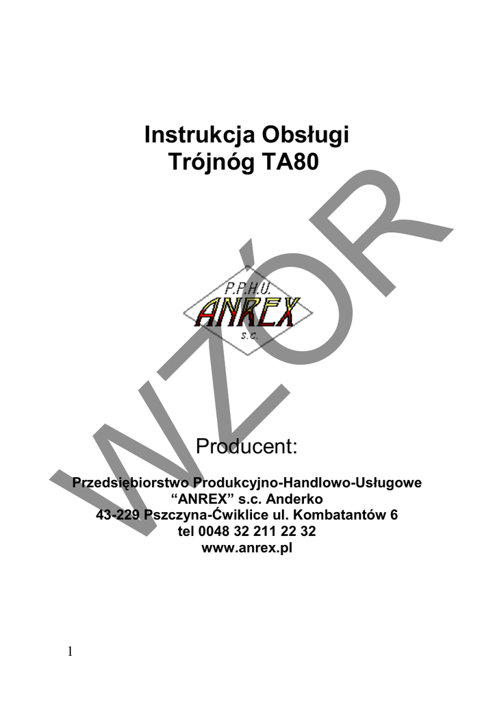 W ZÓ R Instrukcja Obsługi Trójnóg TA80 Producent: Przedsiębiorstwo Produkcyjno-Handlowo-Usługowe “ANREX” s.c. Anderko 43-229 Pszczyna-Ćwiklice ul. Kombatantów 6 tel 0048 32 211 22 32 www.anrex.pl 1 1. Informacja dla użytkownika : R Trójnóg przeznaczony jest do transportu pionowego ładunków w polu działania. Z trójnogiem współpracuje wciągarką ręczna typu AWLIN-R650 produkcji ANREX s.c. dostarczona w komplecie do klienta. Operator i służby techniczne przed przystąpieniem do użytkowania trójnoga mają obowiązek zapoznania się z instrukcją obsługi. Trójnóg może być obsługiwany wyłącznie przez pracowników przeszkolonych w zakresie budowy i obsługi trójnoga. Pracownik winien być zapoznany z ogólnymi przepisami w zakresie prac przeładunkowych i transportowych. Użytkownik ma obowiązek podjęcia wszelkich niezbędnych środków celem zapewnienia bezpiecznego działania wyrobu i zapobiegnięcie wszelkim zagrożeniom dla życia i zdrowia tak użytkownika jak i osób trzecich. 2. Warunki eksploatacji : Maksymalny udźwig podany jest na karcie gwarancyjnej oraz na tabliczce znamionowej. Temperatura otoczenia od -20ºC do +50ºC Atmosfera otoczenia niewymagająca atestu przeciwwybuchowości. Warunki eksploatacji wciągarki ręcznej podane są w instrukcji obsługi wciągarki. ZÓ - - 3. Czynności i obowiązki przed i w czasie pracy trójnoga: Dla zapewnienia bezpiecznych warunków pracy trójnoga przed przystąpieniem do pracy należy dokonać przeglądu konstrukcji. - Zwrócić szczególną uwagę by masa podnoszona nie przekraczała udźwigu maksymalnego. Udźwig umieszczony w karcie gwarancyjnej i na tabliczce znamionowej. - Niedozwolone jest przebywanie osób postronnych w obrębie przenoszonego ładunku. - Niedozwolone jest pozostawienie wiszącego ładunku bez nadzoru. - Podczas pracy trójnoga w temperaturze poniżej 0ºC należy wcześniej sprawdzić, czy hamulec wciągarki nie pokrył się warstwą lodu. - Zabrania się pracy trójnogiem niesprawnym. W razie zauważenia usterek należy powiadomić przełożonego. W - 2 Uwaga: Praca trójnoga w warunkach wykraczających poza wyżej wymienione lub niedotrzymanie wyżej wymienionych obowiązków może stwarzać zagrożenia dla życia i zdrowia użytkownika lub osób trzecich. 4. Charakterystyka techniczna trójnoga : trójnóg wykonuje się w wersji jest ze stali węglowej gat. S235JR, S355J4G3, C45 cynkowanej ogniowo bądź ze stali nierdzewnej kwasoodpornej gat. AISI 1.4301, AISI 1.4541, AISI 1.4404, AISI 1.4571 wg wymagań klienta. Dane umieszczone na tabliczce znamionowej. R 5. Współczynnik obliczeniowy dla prób statycznych : Do obliczeń statycznych zastosowano współczynnik bezpieczeństwa większy bądź równy - 1,5. ZÓ Urządzenie spełnia wymagania stawiane ręcznie obsługiwanym maszynom i osprzętowi do podnoszenia !!! 6. Instrukcja transportu i składowania : W Trójnóg dostarczony jest jako kompletnie zmontowany bez zamocowanej wciągarki. Do transportu elementy trójnoga powinny być zabezpieczone przed uszkodzeniami mechanicznymi, zamocowane na drewnianych równych powierzchniach, bez stykania się ze sobą, Na czas transportu i składowania urządzenie należy chronić przed działaniem czynników atmosferycznych. Składować tylko na drewnie. Przenosić, przewozić w sposób zgodny z wymogami BHP. 7. Opis techniczny : Trójnóg składa się z 3 profili zamkniętych spiętych od góry zamkiem kątowym ograniczającym rozstaw nóg do 1800mm. Nogi urządzenia wykonane są w sposób umożliwiający pracę zarówno na miękkim jak i twardym podłożu. Na dole trójnoga przewidziano łańcuchy zabezpieczające które należy zamontować przed przystąpieniem do pracy trójnoga. Na szczycie znajduje się rolka służąca do przewinięcia linki w ten sposób by ciężar podnoszonego ładunku znajdował cię centralnie na środku urządzenia. 3 ZÓ R Rys poglądowy trójnoga W 8. Naprawy i remonty : Naprawę rewizyjną należy przeprowadzić po 4 letnim okresie eksploatacji. Naprawa wymaga demontażu elementów. Zakres wymiany części uzależniony jest od intensywności oraz warunków eksploatacji trójnoga. Naprawa główna obejmuje wymianę zużytych lub uszkodzonych części. Zabrania się dokonywania jakichkolwiek zmian konstrukcyjnych. Wszystkie odpady powstające w trakcie konserwacji lub remontów należy unieszkodliwić w sposób zgodny z obowiązującymi przepisami z zakresu ochrony środowiska. 4 9. Demontaż i likwidacja : R Przed przystąpieniem do likwidacji urządzenia lub któregoś z podzespołów, należy przeprowadzić jego neutralizację, dokładnie oczyścić, umyć. Po wymontowaniu elementów zużytych lub uszkodzonych należy dokonać segregacji materiałowej: - odpady złomu - odpady tworzyw sztucznych, gumy - czyściwo. Odpady niewykorzystane przez użytkownika należy unieszkodliwić w sposób zgodny z obowiązującymi przepisami z zakresu ochrony środowiska. 10. Przeglądy ZÓ Przeglądy trójnoga muszą być dokonywane przez uprawnionego do tego typu robót pracownika nie rzadziej niż co 90 dni i wpisywane do karty przeglądów znajdującej się na 7 stronie niniejszej dokumentacji. Przeglądowi podlegają : - powłoka cynkowa (jeśli występuje) - elementy złączne trójnoga - elementy łożyskowe i obrotowe W oraz ogólne oględziny wizualne trójnoga ( dotyczące pęknięć profili nośnych, spawów itp.) 5 11. Wzór tabliczki znamionowej W ZÓ R ANREX 6 Podpis W ZÓ R Data przeglądu Tabela przeglądów okresowych Nazwa Wykonane czynności urządzenia obsługowe Nr fabryczny 7 KARTA GWARANCYJNA Nr fabryczny................................. Pieczątka kontroli jakości R Udźwig ( kg )................................. ZÓ Data produkcji................................................. Data sprzedaży................................................ Pieczątka dystrybutora, podpis W 1.W okresie 12-tu miesięcy licząc od daty sprzedaży potwierdzonej
