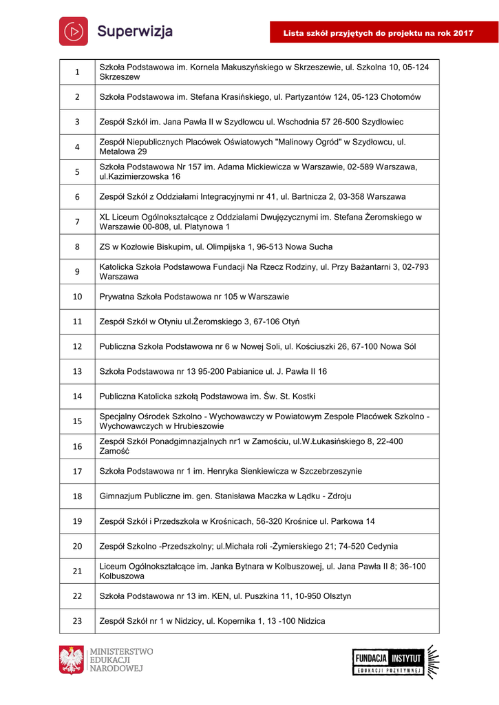 Lista szkół przyjętych do projektu na rok 2017 1 Szkoła Podstawowa im. Kornela Makuszyńskiego w Skrzeszewie, ul. Szkolna 10, 05-124 Skrzeszew 2 Szkoła Podstawowa im. Stefana Krasińskiego, ul. Partyzantów 124, 05-123 Chotomów 3 Zespół Szkół im. Jana Pawła II w Szydłowcu ul. Wschodnia 57 26-500 Szydłowiec 4 Zespół Niepublicznych Placówek Oświatowych "Malinowy Ogród" w Szydłowcu, ul. Metalowa 29 5 Szkoła Podstawowa Nr 157 im. Adama Mickiewicza w Warszawie, 02-589 Warszawa, ul.Kazimierzowska 16 6 Zespół Szkół z Oddziałami Integracyjnymi nr 41, ul. Bartnicza 2, 03-358 Warszawa 7 XL Liceum Ogólnokształcące z Oddzialami Dwujęzycznymi im. Stefana Żeromskiego w Warszawie 00-808, ul. Platynowa 1 8 ZS w Kozłowie Biskupim, ul. Olimpijska 1, 96-513 Nowa Sucha 9 Katolicka Szkoła Podstawowa Fundacji Na Rzecz Rodziny, ul. Przy Bażantarni 3, 02-793 Warszawa 10 Prywatna Szkoła Podstawowa nr 105 w Warszawie 11 Zespół Szkół w Otyniu ul.Żeromskiego 3, 67-106 Otyń 12 Publiczna Szkoła Podstawowa nr 6 w Nowej Soli, ul. Kościuszki 26, 67-100 Nowa Sól 13 Szkoła Podstawowa nr 13 95-200 Pabianice ul. J. Pawła II 16 14 Publiczna Katolicka szkołą Podstawowa im. Św. St. Kostki 15 Specjalny Ośrodek Szkolno - Wychowawczy w Powiatowym Zespole Placówek Szkolno Wychowawczych w Hrubieszowie 16 Zespół Szkół Ponadgimnazjalnych nr1 w Zamościu, ul.W.Łukasińskiego 8, 22-400 Zamość 17 Szkoła Podstawowa nr 1 im. Henryka Sienkiewicza w Szczebrzeszynie 18 Gimnazjum Publiczne im. gen. Stanisława Maczka w Lądku - Zdroju 19 Zespół Szkół i Przedszkola w Krośnicach, 56-320 Krośnice ul. Parkowa 14 20 Zespół Szkolno -Przedszkolny; ul.Michała roli -Żymierskiego 21; 74-520 Cedynia 21 Liceum Ogólnokształcące im. Janka Bytnara w Kolbuszowej, ul. Jana Pawła II 8; 36-100 Kolbuszowa 22 Szkoła Podstawowa nr 13 im. KEN, ul. Puszkina 11, 10-950 Olsztyn 23 Zespół Szkół nr 1 w Nidzicy, ul. Kopernika 1, 13 -100 Nidzica Lista szkół przyjętych do projektu na rok 2017 24 Szkoła Podstawowa nr 2 w Nakle nad Notecią 25 Zespół Szkolno-Przedszkolny nr 9 w Rybniku , ul. Wodzisławska 123 26 Zespół Szkół Sportowych i Ogólnokształcących Gdańsk ul. Subisława 22 27 Zespół Szkół Ponadgimnazjalnych Nr 3, im. Ks. E.Roszczynialskiego, 84-200 Wejherowo, ul. Budowlanych 2 28 Zespół Szkół z Oddziałami Integracyjnymi w Kielnie, ul. Szkolna 4, 84-208 Kielno 29 Szkoła Podstawowa nr 6 im. Jana Pawła II, 84-240 Reda, ul. Gniewowska 33 30 Szkoła Podstawowa nr 3 im. Olimpijczyków Polskich w Lęborku, ul. Kossaka 103 84-300 Lębork