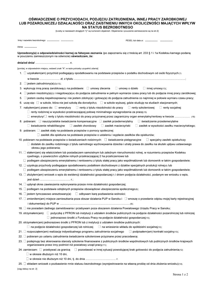 OŚWIADCZENIE O PRZYCHODACH, PODJĘCIU ZATRUDNIENIA, INNEJ PRACY ZAROBKOWEJ LUB POZAROLNICZEJ DZIAŁALNOŚCI ORAZ ZAISTNIENIU INNYCH OKOLICZNOŚCI MAJĄCYCH WPŁYW NA STATUS BEZROBOTNEGO [Liczby w nawiasach okrągłych "()" są numerami objaśnień. Objaśnienia i pouczenie zamieszczone są na str.2] Imię i nazwisko bezrobotnego Adres ................ ................ PESEL lub data ur. ................ ................ ................ Uprzedzony(a) o odpowiedzialności karnej za fałszywe zeznania (po zapoznaniu się z treścią art. 233 § 1 i 1a Kodeksu karnego podaną w pouczeniu zamieszczonym na odwrocie) oświadczam, że: dnia/od dnia/ ............................................ r. [poniżej, w odpowiednim miejscu, wstawić znak "X"; w razie potrzeby uzupełnić zdania] 1. uzyskałem(am) przychód podlegający opodatkowaniu na podstawie przepisów o podatku dochodowym od osób fizycznych (1) 2. jestem zatrudniony(a)(2)(13); w kwocie .......................... zł, z tytułu ................................................................................................................................................; 3. wykonuję inną pracę zarobkową (2) na podstawie: umowy zlecenia umowy o dzieło innej umowy(13); 4. jestem niezdolny(a)(3) i niegotowy(a)(4) do podjęcia zatrudnienia w pełnym wymiarze czasu pracy lub do podjęcia innej pracy zarobkowej; 5. jestem osobą niepełnosprawną i nie jestem zdolny(a) i gotowy(a) do podjęcia zatrudnienia co najmniej w połowie wymiaru czasu pracy; 6. uczę się: w szkole, która nie jest szkołą dla dorosłych(5) 7. nabyłem(am) prawo do: emerytury w szkole wyższej, gdzie studiuję na studiach stacjonarnych; renty z tytułu niezdolności do pracy renty szkoleniowej renty socjalnej renty rodzinnej w wysokości przekraczającej połowę minimalnego wynagrodzenia za pracę (15) emerytury/ 8. pobieram: renty z tytułu niezdolności do pracy przyznanej przez zagraniczny organ emerytalny/rentowy w kwocie .................... nauczycielskie świadczenie kompensacyjne świadczenie rehabilitacyjne 9. pobieram: zasiłek przedemerytalny zasiłek chorobowy zasiłek macierzyński (16) świadczenie przedemerytalne zasiłek w wysokości zasiłku macierzyńskiego; zasiłek stały na podstawie przepisów o pomocy społecznej zasiłek dla opiekuna na podstawie przepisów o ustaleniu i wypłacie zasiłków dla opiekunów; 10. pobieram na podstawie przepisów o świadczeniach rodzinnych: świadczenie pielęgnacyjne specjalny zasiłek opiekuńczy dodatek do zasiłku rodzinnego z tytułu samotnego wychowywania dziecka i utraty prawa do zasiłku na skutek upływu ustawowego okresu jego pobierania; 11. stałem(am) się właścicielem lub posiadaczem samoistnym lub zależnym nieruchomości rolnej, w rozumieniu przepisów Kodeksu cywilnego, o powierzchni użytków rolnych przekraczającej 2 ha przeliczeniowe lub podlegam ubezpieczeniu emerytalnemu i rentowemu z tytułu stałej pracy jako współmałżonek lub domownik w takim gospodarstwie; 12. uzyskuję przychody podlegające opodatkowaniu podatkiem dochodowym z działów specjalnych produkcji rolnej (6) lub 13. złożyłem(am) wniosek o wpis do ewidencji działalności gospodarczej(7) i dniem podjęcia działalności, podanym we wniosku o wpis, 14. upłynął okres zawieszenia wykonywania przeze mnie działalności gospodarczej; 15. podlegam na podstawie odrębnych przepisów obowiązkowi ubezpieczenia społecznego (8); 16. jestem tymczasowo aresztowany(a) 17. zmieniłem(am) miejsce zamieszkania poza obszar działania PUP w Sanoku i podlegam ubezpieczeniu emerytalnemu i rentowemu z tytułu stałej pracy jako współmałżonek lub domownik w takim gospodarstwie; jest dzień ....................................... r.; odbywam karę pozbawienia wolności; wnoszę o przesłanie odpisu mojej karty rejestracyjnej i dokumentacji do PUP w .......................................................................................... (9); 18. nie posiadam żadnego zameldowania i przebywam poza obszarem działania Powiatowego Urzędu Pracy w Sanoku; 19. otrzymałem(am): pożyczkę z PFRON lub instytucji z udziałem środków publicznych na podjęcie działalności pozarolniczej lub rolniczej jednorazowo środki z Funduszu Pracy na podjęcie działalności gospodarczej(10); 20. otrzymałem(am) jednorazowo środki z PFRON lub z instytucji z udziałem środków publicznych: na podjęcie działalności gospodarczej lub rolniczej na wniesienie wkładu do spółdzielni socjalnej(10); 21. rozpocząłem(am) realizację indywidualnego programu zatrudnienia socjalnego 22. pobieram po ustaniu zatrudnienia świadczenie szkoleniowe przyznane przez pracodawcę; 23. podejmuję bez skierowania starosty szkolenie finansowane z publicznych środków wspólnotowych lub publicznych środków krajowych organizowane przez inny podmiot niż powiatowy urząd pracy (11); 24. zamierzam: przebywać za granicą podpisałem(am) kontrakt socjalny(10); pozostawać w innej sytuacji powodującej brak gotowości do podjęcia zatrudnienia(12) w okresie dłuższym niż 10 dni, w okresie nie dłuższym niż 10 dni, tj. do dnia ....................................... r. 25. składam wniosek o pozbawienie mnie statusu bezrobotnego (wyrejestrowanie na własną prośbę od dnia złożenia wniosku) (14). [ciąg dalszy na str. 2] Strona 1 z 2 26. ustanawiam - ze wględu na zamiar pobytu za granicą - pełnomocnika do doręczeń w kraju: [imię, nazwisko i adres pełnomocnika] ................................................................................................................................................................................................................... Ddodatkowe informacje [wpisuje w razie potrzeby bezrobotny] .............................................................................................................................................................................................................................