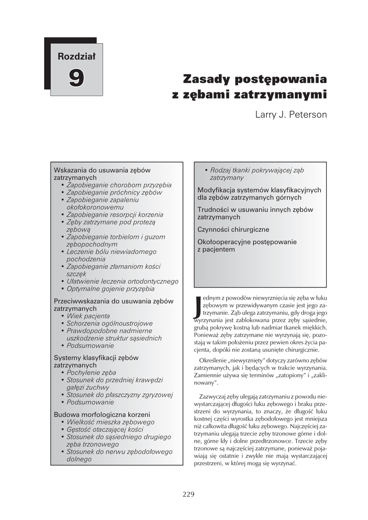 Rozdział 9 Zasady postępowania z zębami zatrzymanymi Larry J. Peterson Wskazania do usuwania zębów zatrzymanych • Zapobieganie chorobom przyzębia • Zapobieganie próchnicy zębów • Zapobieganie zapaleniu okołokoronowemu • Zapobieganie resorpcji korzenia • Zęby zatrzymane pod protezą zębową • Zapobieganie torbielom i guzom zębopochodnym • Leczenie bólu niewiadomego pochodzenia • Zapobieganie złamaniom kości szczęk • Ułatwienie leczenia ortodontycznego • Optymalne gojenie przyzębia Przeciwwskazania do usuwania zębów zatrzymanych • Wiek pacjenta • Schorzenia ogólnoustrojowe • Prawdopodobne nadmierne uszkodzenie struktur sąsiednich • Podsumowanie Systemy klasyfikacji zębów zatrzymanych • Pochylenie zęba • Stosunek do przedniej krawędzi gałęzi żuchwy • Stosunek do płaszczyzny zgryzowej • Podsumowanie Budowa morfologiczna korzeni • Wielkość mieszka zębowego • Gęstość otaczającej kości • Stosunek do sąsiedniego drugiego zęba trzonowego • Stosunek do nerwu zębodołowego dolnego • Rodzaj tkanki pokrywającej ząb zatrzymany Modyfikacja systemów klasyfikacyjnych dla zębów zatrzymanych górnych Trudności w usuwaniu innych zębów zatrzymanych Czynności chirurgiczne Okołooperacyjne postępowanie z pacjentem J ednym z powodów niewyrznięcia się zęba w łuku zębowym w przewidywanym czasie jest jego zatrzymanie. Ząb ulega zatrzymaniu, gdy droga jego wyrzynania jest zablokowana przez zęby sąsiednie, grubą pokrywę kostną lub nadmiar tkanek miękkich. Ponieważ zęby zatrzymane nie wyrzynają się, pozostają w takim położeniu przez pewien okres życia pacjenta, dopóki nie zostaną usunięte chirurgicznie. Określenie „niewyrznięty” dotyczy zarówno zębów zatrzymanych, jak i będących w trakcie wyrzynania. Zamiennie używa się terminów „zatopiony” i „zaklinowany”. Zazwyczaj zęby ulegają zatrzymaniu z powodu niewystarczającej długości łuku zębowego i braku przestrzeni do wyrzynania, to znaczy, że długość łuku kostnej części wyrostka zębodołowego jest mniejsza niż całkowita długość łuku zębowego. Najczęściej zatrzymaniu ulegają trzecie zęby trzonowe górne i dolne, górne kły i dolne przedtrzonowce. Trzecie zęby trzonowe są najczęściej zatrzymane, ponieważ pojawiają się ostatnie i zwykle nie mają wystarczającej przestrzeni, w której mogą się wyrzynać. 229 Dział 2: Zasady usuwania zębów Przednie zęby szczęki też ulegają zatrzymaniu na skutek stłoczenia innych zębów. Kieł górny wyrzyna się zwykle po bocznym siekaczu górnym i pierwszym przedtrzonowcu górnym. Jeżeli przestrzeń pomiędzy nimi jest niewystarczająca do wyrzynania, to kieł ulega zatrzymaniu. W żuchwie w podobnej sytuacji są zęby przedtrzonowe, ponieważ wyrzynają się po pierwszym trzonowcu i kle. Dlatego jeżeli ilość miejsca jest niewystarczająca, jeden z przedtrzonowców, najczęściej drugi, nie wyrzyna się i staje się zębem zatrzymanym. Zgodnie z ogólną zasadą, ząb zatrzymany powinien zostać usunięty, o ile nie istnieją przeciwwskazania. Ekstrakcja powinna być wykonana, gdy tylko stomatolog stwierdzi obecność zęba zatrzymanego. Usuwanie zębów zatrzymanych u osób starszych jest trudniejsze. Dentysta nie powinien zalecać pozostawiania zębów zatrzymanych do momentu, aż pojawią się dolegliwości. Są to najczęściej miejscowe stany zapalne, utrata zębów sąsiednich, uszkodzenia kości oraz innych struktur anatomicznych. Jeśli usunięcie zęba zatrzymanego odracza się aż do wystąpienia dolegliwości, to przeprowadzany wówczas zabieg prawdopodobnie będzie się łączył z większymi powikłaniami w okresie pooperacyjnym. Podstawowa zasada w stomatologii głosi, że należy zapobiegać wszelkim możliwym problemom. Stomatologia prewencyjna nakazuje usuwać zęby zatrzymane, zanim pojawią się powikłania. W rozdziale tym przedstawiono zasady postępowania z zębami zatrzymanymi. Nie omówiono szczegółowo aspektów chirurgicznego usuwania zębów zatrzymanych, a raczej przedstawiono informacje konieczne do właściwego postępowania z zębami zatrzymanymi oraz zwróceno uwagę na różne trudności chirurgiczne. WSKAZANIA DO USUWANIA ZĘBÓW ZATRZYMANYCH Wszystkie zęby zatrzymane powinny być zakwalifikowane do usunięcia zaraz po stwierdzeniu ich obecności. Przeciętny czas wyrzynania się trzeciego zęba trzonowego to 20. rok życia, jakkolwiek u niektórych pacjentów proces ten może trwać do 25. roku życia. Prawidłowo trzeci ząb trzonowy dolny rozpoczyna swój rozwój w położeniu poziomym. Podczas dalszego wzrostu szczęk i rozwoju zęba, jego położenie zmienia się z poziomego na przyśrodkowo-kątowe, a następnie pionowe. Niepowodzenie obrotu z kierunku przyśrodkowo-kątowego na pionowy jest najczęstszą przyczyną zatrzymania zęba. Drugi istotny czynnik stanowi fakt, że przednio-tylny wymiar zęba jest większy niż odległość pomiędzy przednim brzegiem gałęzi żuchwy a dystalną powierzchnią drugiego zęba trzonowego. Nie pozwala to na ustawienie się zatrzymanego zęba w odpowiednim położeniu. Jak zaznaczono wcześniej, niektóre trzecie zęby trzonowe wyrzynają się po 20. roku życia i ustawiają w ostatecznej pozycji około 25. roku życia. Z procesem tym wiąże się wiele problemów. Kiedy występuje późne wyrzynanie się zęba, jest on zwykle pokryty tylko tkanką miękką lub dodatkowo bardzo cienką warstwą kości. Zęby są wówczas prawie zawsze ustawione w pozycji pionowej i ułożone stosunkowo blisko powierzchni zgryzu sąsiedniego drugiego trzonowca. Najważniejsza jest niewystarczająca przestrzeń pomiędzy przednią krawędzią gałęzi żuchwy a drugim zębem trzonowym, co nie pozwala na wyrzynanie się zęba.14, 15 Jeśli ząb nie wyrzyna się po 20. roku życia, najprawdopodobnej jest przykryty kością i zaklinowany. Najczęściej położony jest głębiej w łuku zębowy
