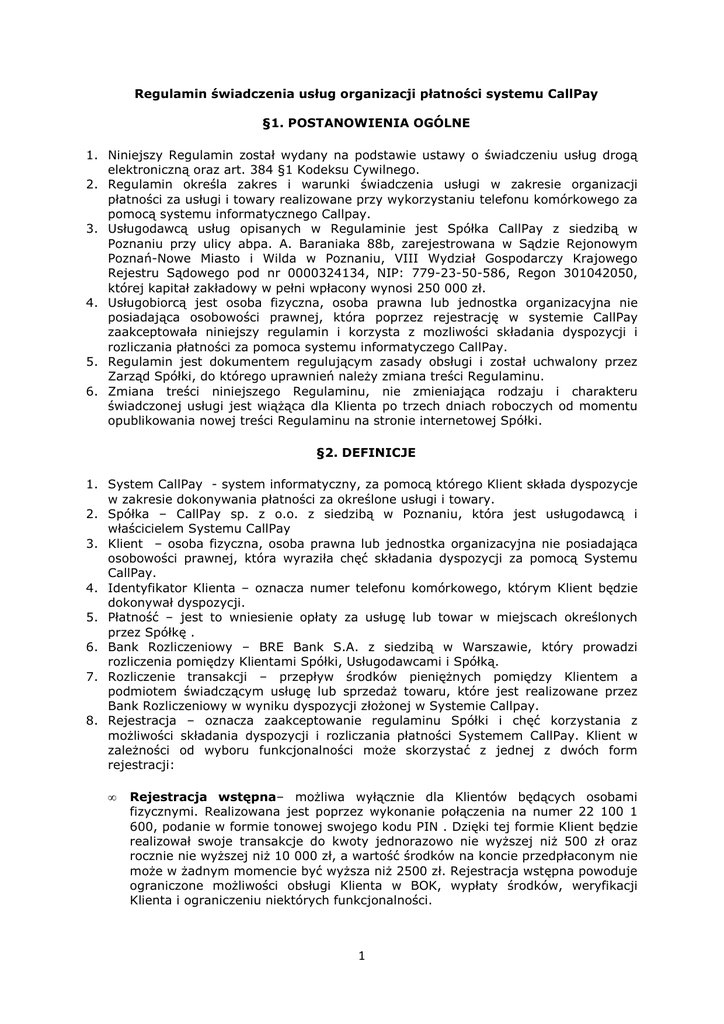 Regulamin świadczenia usług organizacji płatności systemu CallPay §1. POSTANOWIENIA OGÓLNE 1. Niniejszy Regulamin został wydany na podstawie ustawy o świadczeniu usług drogą elektroniczną oraz art. 384 §1 Kodeksu Cywilnego. 2. Regulamin określa zakres i warunki świadczenia usługi w zakresie organizacji płatności za usługi i towary realizowane przy wykorzystaniu telefonu komórkowego za pomocą systemu informatycznego Callpay. 3. Usługodawcą usług opisanych w Regulaminie jest Spółka CallPay z siedzibą w Poznaniu przy ulicy abpa. A. Baraniaka 88b, zarejestrowana w Sądzie Rejonowym Poznań-Nowe Miasto i Wilda w Poznaniu, VIII Wydział Gospodarczy Krajowego Rejestru Sądowego pod nr 0000324134, NIP: 779-23-50-586, Regon 301042050, której kapitał zakładowy w pełni wpłacony wynosi 250 000 zł. 4. Usługobiorcą jest osoba fizyczna, osoba prawna lub jednostka organizacyjna nie posiadająca osobowości prawnej, która poprzez rejestrację w systemie CallPay zaakceptowała niniejszy regulamin i korzysta z mozliwości składania dyspozycji i rozliczania płatności za pomoca systemu informatyczego CallPay. 5. Regulamin jest dokumentem regulującym zasady obsługi i został uchwalony przez Zarząd Spółki, do którego uprawnień naleŜy zmiana treści Regulaminu. 6. Zmiana treści niniejszego Regulaminu, nie zmieniająca rodzaju i charakteru świadczonej usługi jest wiąŜąca dla Klienta po trzech dniach roboczych od momentu opublikowania nowej treści Regulaminu na stronie internetowej Spółki. §2. DEFINICJE 1. System CallPay - system informatyczny, za pomocą którego Klient składa dyspozycje w zakresie dokonywania płatności za określone usługi i towary. 2. Spółka – CallPay sp. z o.o. z siedzibą w Poznaniu, która jest usługodawcą i właścicielem Systemu CallPay 3. Klient – osoba fizyczna, osoba prawna lub jednostka organizacyjna nie posiadająca osobowości prawnej, która wyraziła chęć składania dyspozycji za pomocą Systemu CallPay. 4. Identyfikator Klienta – oznacza numer telefonu komórkowego, którym Klient będzie dokonywał dyspozycji. 5. Płatność – jest to wniesienie opłaty za usługę lub towar w miejscach określonych przez Spółkę . 6. Bank Rozliczeniowy – BRE Bank S.A. z siedzibą w Warszawie, który prowadzi rozliczenia pomiędzy Klientami Spółki, Usługodawcami i Spółką. 7. Rozliczenie transakcji – przepływ środków pienięŜnych pomiędzy Klientem a podmiotem świadczącym usługę lub sprzedaŜ towaru, które jest realizowane przez Bank Rozliczeniowy w wyniku dyspozycji złoŜonej w Systemie Callpay. 8. Rejestracja – oznacza zaakceptowanie regulaminu Spółki i chęć korzystania z moŜliwości składania dyspozycji i rozliczania płatności Systemem CallPay. Klient w zaleŜności od wyboru funkcjonalności moŜe skorzystać z jednej z dwóch form rejestracji: • Rejestracja wstępna– moŜliwa wyłącznie dla Klientów będących osobami fizycznymi. Realizowana jest poprzez wykonanie połączenia na numer 22 100 1 600, podanie w formie tonowej swojego kodu PIN . Dzięki tej formie Klient będzie realizował swoje transakcje do kwoty jednorazowo nie wyŜszej niŜ 500 zł oraz rocznie nie wyŜszej niŜ 10 000 zł, a wartość środków na koncie przedpłaconym nie moŜe w Ŝadnym momencie być wyŜsza niŜ 2500 zł. Rejestracja wstępna powoduje ograniczone moŜliwości obsługi Klienta w BOK, wypłaty środków, weryfikacji Klienta i ograniczeniu niektórych funkcjonalności. 1 • Rejestracja pełna – realizowana na stronie www.callpay.pl i pozwalająca na pełną funkcjonalność korzystania z Systemu CallPay bez limitów kwotowych. 9. Profil Klienta – profil zakładany automatycznie podczas pierwszej rejestracji i wykorzystywany w celu logowania na stronach www.callpay.pl 10. Konto przedpłacone – zakładane jest kaŜdemu Klientowi, który się zrejestrował w Systemie CallPay i przypisane jest do „identyfikatora klienta” czyli numeru telefonu, którym Klient będzie dokonywał płatności. 11. Wspólne konto przedpłacone – konto, które naleŜy do Klienta, który poprzez dokonanie „rejestracji pełnej” upowaŜnił inne numery telefonów komórkowych do dokonywania płatności ze wspólnych środków znajdujących się na koncie przepłaconym Klienta. 12. Środki przedpłacone – wnoszone są przez Klientów w formie zaliczek w walucie Polskiej na późniejsze płatności. Środki nie stanowią pieniądza elektronicznego w rozumieniu ustawy z dnia 12 września 2002 r. o elektronicznych instrumentach płatniczych. Środki te nie podlegają oprocentowaniu i moŜliwe są do wykorzystania poprzez płatności w systemie CallPay. Środki są wpłacane są na rachunek bankowy prowadzony przez Bank Rozliczeniowy na zlecenie Spółki . 13. Zasilenie Konta Przedpłaconego – jest to transakcja finansowa wpłaty zaliczki na rachunek przedpłacony, która odbywa się na jeden ze sposobów określony przez Spółkę tj. poprzez : • stronę www.callpay.pl • przelew z rachunku banku Klienta • przelew w banku lub na poczcie • w wybranych terminalach płatniczych, bankomatach, u integratorów płatniczych, które będą oznaczone logo CallPay. W przypadku występowania prowizji nakładanej przez przyjmującego zaliczkę jako Zasilenie Konta Przedpłaconego, Spółka kaŜdorazowo poinformuje Klienta o tym fakcie, a sama transakcja oznaczać będzie zgodę Klienta na pobranie prowizji. 14. Partner – to przedsiębiorca, który świadczy usługi lub sprzedaje towary na rzecz Klientów oraz przyjmuje płatności od Klientów za pomocą Systemu CallPay. 15. PIN – oznacza czterocyfrowy kod PIN, którym Klient zatwierdza transakcje podczas realizacji płatności. Klient ustanawia kod PIN podczas rejestracji i moŜe go modyfikować wyłącznie w Profilu Klienta po dokonaniu Rejestracji Pełnej. 16. NUC - Numer Usługi Callpay jest to numer telefoniczny przypisany do danego Partnera, na który K