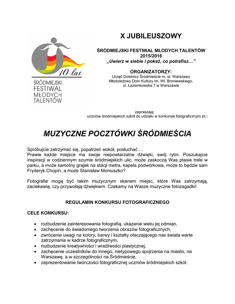 X JUBILEUSZOWY ŚRÓDMIEJSKI FESTIWAL MŁODYCH TALENTÓW 2015/2016 „Uwierz w siebie i pokaż, co potrafisz…” ORGANIZATORZY: Urząd Dzielnicy Śródmieście m. st. Warszawy Młodzieżowy Dom Kultury im. Wł. Broniewskiego, ul. Łazienkowska 7 w Warszawie zapraszają uczniów śródmiejskich szkół do udziału w konkursie fotograficznym pt.: MUZYCZNE POCZTÓWKI ŚRÓDMIEŚCIA Spróbujcie zatrzymać się, popatrzeć wokół, posłuchać … Prawie każde miejsce ma swoje niepowtarzalne dźwięki, swój rytm. Poszukajcie inspiracji w codziennym szumie śródmiejskich ulic, może zaskoczą Was ptasie trele w parku, a może samotny grajek na stacji metra, kapela podwórkowa, może to będzie sam Fryderyk Chopin, a może Stanisław Moniuszko? Fotografie mogą być takim muzycznym skanem miejsc, które Was zatrzymają, zaciekawią, czy przywołają dźwiękiem. Czekamy na Wasze muzyczne fotozagadki! REGULAMIN KONKURSU FOTOGRAFICZNEGO CELE KONKURSU: rozbudzenie zainteresowania fotografią, ukazanie wielu jej odmian, zachęcenie do świadomego tworzenia obrazów fotograficznych, zwrócenie uwagi na kolory, barwy i kształty otaczającego nas świata warte zatrzymania w kadrze fotograficznym, rozbudzenie kreatywności i wrażliwości plastycznej, zachęcenie uczestników do innego, nietypowego spojrzenia na miasto, na Warszawę, a w szczególności na Śródmieście, zaprezentowanie twórczości fotograficznej uczniów śródmiejskich szkół. KATEGORIE WIEKOWE: szkoła podstawowa (klasy IV – VI), gimnazja, szkoły ponadgimnazjalne. WYMAGANIA KONKURSOWE UDZIAŁ W WARSZTATACH I PLENERZE (OBOWIĄZKOWY) 28 listopada 2015 r. (sobota), o godz. 11.00, spotykamy się w Młodzieżowym Domu Kultury przy Łazienkowskiej 7, na wykładzie wprowadzającym w zagadnienia związane z tegorocznym konkursem. Po przybyciu na miejsce należy wpisać swoje imię i nazwisko na liście obecności! Podczas spotkania uczestnicy zapoznają się z tematyką konkursu i z wymaganiami, jakie są stawiane w tegorocznej edycji oraz uzyskają wskazówki dotyczące fotografii. Po wykładzie nastąpi fotografowanie w plenerze. Pod okiem instruktorów fotografów, uczestnicy będą poznawać tajniki efektów uzyskiwanych przy pomocy tradycyjnych aparatów fotograficznych oraz nowoczesnego sprzętu. W przypadku uczestnictwa powyżej 3 uczniów z tej samej szkoły podstawowej lub gimnazjum obowiązkowa jest obecność nauczyciela. Uczniowie nie zorganizowani w grupę z nauczycielem powinni zostać odebrani przez rodziców/opiekunów lub posiadać pisemną zgodę na samodzielny powrót do domu. Przewidywany czas zakończenia pleneru - ok. godziny 14.00 Prowadzący: Zofia Rajska, Tomasz Truszkowski. KONSULTACJE TECHNICZNE (NIEOBOWIĄZKOWE) Wszystkich zainteresowanych zapraszamy na konsultacje w poniedziałki lub środy, w godzinach 15.00-19.00 (do 17 lutego 2016 r.). Podczas konsultacji można będzie zapoznać się z technikami cyfrowej obróbki zdjęć oraz ich przygotowania do druku i ekspozycji. (Prosimy o wcześniejsze zgłoszenie – e-mail: [email protected]) TECHNIKA I FORMA PRAC technika wykonania zdjęć: kolor, na papierze, format fotografii: 20 cm x 30 cm lub większy (prosimy o przestrzeganie minimalnych formatów zdjęć), na odwrocie każdego zdjęcia należy podać: tytuł zdjęcia, imię i nazwisko autora, nazwę szkoły, każdy uczestnik może zgłosić na konkurs do 10 zdjęć, elektroniczna wersja zdjęć na płycie CD lub DVD (na płycie CD lub DVD należy umieścić imię i nazwisko autora, nazwę szkoły), do prac należy dołączyć podpisaną kartę zgłoszenia prac oraz oświadczenie zgody na przetwarzanie danych osobowych. KRYTERIA OCENY PRAC KONKURSOWYCH zgodność pracy z tematem konkursu, jakość techniczna, zgodność z wymogami regulaminu, walory fotograficzne: motyw, światło i kompozycja. TERMINY Zdjęcia i ich wersję elektroniczną wraz z poprawnie wypełnioną KARTĄ ZGŁOSZENIA PRAC KONKURSOWYCH oraz oświadczeniem zgody na przetwarzanie danych osobowych należy składać do 19 lutego 2016 r. bezpośrednio w Młodzieżowym Domu Kultury w Warszawie, ul. Łazienkowska 7, codziennie, w godz. 11.00 – 19.00. Prac nie należy składać, rolować, ani oprawiać! Informacje o laureatach konkursu i terminie otwarcia wystawy podane będą na stronach: www.mdk.waw.pl i www.srodmiescie.edu.pl od 18 marca 2016 r. Prace niezakwalifikowane do wystawy będzie można odebrać w MDK Łazienkowska w poniedziałki i środy (w godzinach 15.00 – 19.00) od maja do czerwca 2016 r. Organizatorzy zastrzegają sobie prawo do bezpłatnej publikacji zgłoszonych prac w celu promocji konkursu oraz MDK Łazienkowska. Udział w konkursie jest równoznaczny z akceptacją regulaminu. KOORDYNATOR KONKURSU: Tomasz Truszkowski, tel./faks 22 629-32-06, tel. 609-366-108, e-mail: [email protected] X JUBILEUSZOWY ŚRÓDMIEJSKI FESTIWAL MŁODYCH TALENTÓW 2015/2016 „Uwierz w siebie i pokaż co potrafisz…” KONKURS FOTOGRAFICZNY Karta zgłoszenia ........................................................................................................................................................... imię i nazwisko ucznia, klasa ........................................................................................................................................................... tel. kontaktowy, e-mail ucznia lub opiekuna ........................................................................................................................................................... ………………………………………………………………………………………………………………………………………….............. nazwa i adres szkoły/placówki, telefon, faks, e-mail ........................................................................................................................................................... imię i nazwisko nauczyciela/opiekuna ................................