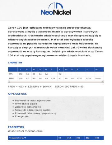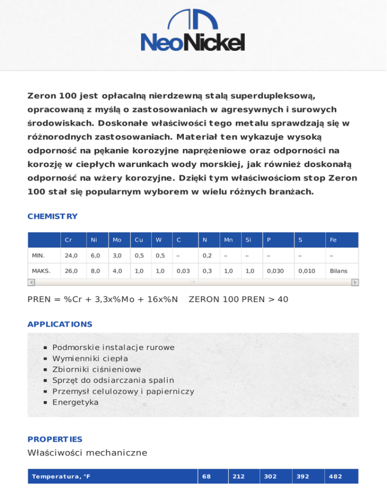 Zeron 100 jest opłacalną nierdzewną st alą superdupleksową, opracowaną z myślą o zast osowaniach w agresywnych i surowych środowiskach. Doskonałe właściwości t ego met alu sprawdzają się w różnorodnych zast osowaniach. Mat eriał t en wykazuje wysoką odporność na pękanie korozyjne naprężeniowe oraz odporności na korozję w ciepłych warunkach wody morskiej, jak również doskonałą odporność na wżery korozyjne. Dzięki t ym właściwościom st op Zeron 100 st ał się popularnym wyborem w wielu różnych branżach. CHEMIST RY Cr Ni Mo Cu W C N Mn Si P S Fe MIN. 24,0 6,0 3,0 0,5 0,5 – 0,2 – – – – – MAKS. 26,0 8,0 4,0 1,0 1,0 0,03 0,3 1,0 1,0 0,030 0,010 Bilans PREN = %Cr + 3,3x%Mo + 16x%N ZERON 100 PREN > 40 APPLICAT IONS Podmorskie instalacje rurowe Wymienniki ciepła Zbiorniki ciśnieniowe Sprzęt do odsiarczania spalin Przemysł celulozowy i papierniczy Energetyka PROPERT IES Właściwości mechaniczne Temperat ura, °F 68 212 302 392 482 Wytrzymałość na rozciąganie, ksi 109 102 99 97 94 0,2% granica plastyczności, ksi 80 68 65 62 58 Obciążenia projekt owe – Zbiorniki ciśnieniowe (ASME) ZERON 100 (UNS S32760) jest omówiony w ramach ASME sekcja VIII, dział 1, konstrukcja wg przypadku kodu 2245 oraz sekcja III, dział 1 wg przypadku N-564-2. Jest on również uwzględniony w klasyfikacji B16.5 (kołnierze rurowe i armatura kołnierzowa), B16.34 (zawory – kołnierzowe, gwintowane oraz spawane), 16.47 (kołnierze stalowe o dużej średnicy: od NPS 26 do NPS 60), B31.3 (rury produkcyjne). 1 Temperatura, °F 100 200 300 400 500 600 Zeron 100 1 31,1 ksi 31,0 ksi 29,4 ksi 29,0 ksi 29,0 ksi 29,0 ksi 22051 25,7 ksi 25,7 ksi 24,8 ksi 23,9 ksi 23,3 ksi 23,1 ksi AL-6XN® 1 27,1 ksi 27,1 ksi 25,7 ksi 24,6 ksi 23,8 ksi 23,3 ksi ZERON 100 2 36,3 ksi 35,9 ksi 34,4 ksi 34,0 ksi 34,0 ksi 34,0 ksi ASME sekcja VIII, dział 1; 2ASME B31.3 Odporność na uderzenia ZERON 100 odznacza się dobrą odpornością na uderzenia. Nie występuje rzeczywiste przejście kruchości, jedynie stopniowy spadek energii udarowej w obniżonej temperaturze. Energia udarowa różni się w zależności od typu produktu oraz ciągu produkcyjnego. Odporność na uderzenia spawanego stopu ZERON 100 jest nieznacznie niższa od metalu rodzimego. Obecne dane sugerują, że 40 J (30 ft.lbs) jest odpowiednim kryterium dopuszczenia dla stali nierdzewnej dupleksowej i ilustracja 1 przedstawia, że wartość 40 J jest osiągana w przypadku wszystkich form produktu ZERON 100 (UNS S32760) aż do bardzo niskich temperatur. Aby uzyskać dobrą wytrzymałość udarową po spawaniu, wymagany jest wyższy poziom wytrzymałości udarowej w materiale rodzimym. Metal bazowy stali nierdzewnej superdupleksowej ZERON 100 z reguły odznacza się wytrzymałością udarową wg Charpy’ego > 70J przy -50°C. CORROSION RESISTANCE ZERON 100 korzystnie wypada w zakresie odporności na wżery korozyjne w porównaniu z droższymi stopami molibdeny 6% i przewyższa stopy 2205 lub 316L. Stop % Mo CCCT, °F CPT, °F PREN 316L 2,1 < 28 68 24 2205 3,1 68 120 35 904L 4,4 75 130 36 ZERON 100 3,5 108 180 41 AL-6XN 6,2 110 172 44 625 9,0 113 - 51 C22 13 - - 64 C-276 15,5 130 > 217 67 PROFIL W&LST ROK;A&SACUT E;CIWO&SACUT E;CI Jedną z najbardziej znamiennych cech stopu Zeron 100 jest jego odporność na uderzenia bez rzeczywistego przejścia kruchości. Stop jedynie wykazuje stopniowy spadek energii udarowej w obniżonej temperaturze, co wyróżnia go spośród innych. Energia udarowa jest zmienna, zależnie od produkcji i typu produktu. Odporność na uderzenia spawanego stopu Zeron 100 jest jedynie nieznacznie niższa niż metalu rodzimego. HIST ORIA ST OPU ZERON 100 Zeron 100 zadebiutował jako materiał odporny na korozję w pompach oleju na Morzu Północnym. Ponieważ były to trudne warunki pracy, w których inne stopy łatwo korodowały, Zeron 100 szybko stał się głównym graczem w tym sektorze. Dzięki wyjątkowym parametrom, które cieszą się dużym uznaniem, stopy te są obecnie używane w wielu różnych sektorach przemysłowych w różnorodnych formach produktu. Zwyczajowe nazwy handlowe stopu Zeron 100 obejmują: Super Duplex, 25Cr Duplex, Super Duplex Stainless, F55 Duplex, UNS S32760 oraz EN 1.4501. CECHY ST OPU ZERON 100 Imponujące parametry stopu Zeron 100 czynią z niego bardzo funkcjonalny materiał. Obejmują one: GWARANTOWANĄ doskonałość w zakresie odporności na korozję, z rewelacyjną odpornością na korozję szczelinową w wodzie morskiej Opłacalność i niezawodność Wyjątkową odporność na pękanie korozyjne naprężeniowe w większości warunków, w tym w chlorkach i kwaśnych substancjach Doskonałą odporność na większość stężeń kwasu siarkowego za sprawą dodatku miedzi Lepszą odporność na zmęczenie korozyjne oraz korozję kawitacyjną niż w przypadku innych stali nierdzewnych W&LST ROK;A&SACUT E;CIWO&SACUT E;CI ST OPU ZERON 100 Z reguły Zeron 100 zawiera 25% chromu, 7% niklu oraz 3,6% molibdenu, jak również miedź i wolfram. Jednak na potrzeby różnych zastosowań jego skład może być modyfikowany. Skont akt uj się z nami, aby kupi&cacut e; ZERON 100 lub uzyska&cacut e; więcej informacji na jego t emat , a wkrót ce skont akt ujemy się z Tobą!