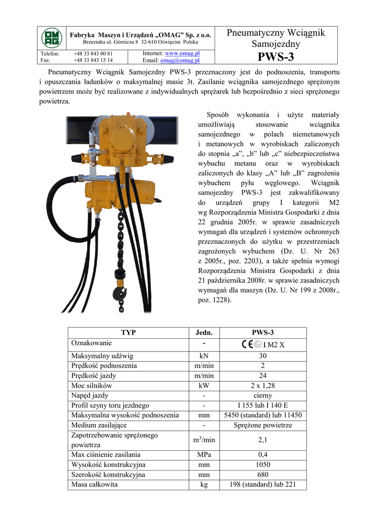 Fabryka Maszyn i Urządzeń „OMAG” Sp. z o.o. Brzezinka ul. Górnicza 8 32-610 Oświęcim Polska Telefon: Fax: Internet: www.omag.pl Email: [email protected] +48 33 843 00 81 +48 33 843 15 14 Pneumatyczny Wciągnik Samojezdny PWS-3 Pneumatyczny Wciągnik Samojezdny PWS-3 przeznaczony jest do podnoszenia, transportu i opuszczania ładunków o maksymalnej masie 3t. Zasilanie wciągnika samojezdnego sprężonym powietrzem może być realizowane z indywidualnych sprężarek lub bezpośrednio z sieci sprężonego powietrza. Sposób wykonania i użyte materiały umożliwiają stosowanie wciągnika samojezdnego w polach niemetanowych i metanowych w wyrobiskach zaliczonych do stopnia „a”, „b” lub „c” niebezpieczeństwa wybuchu metanu oraz w wyrobiskach zaliczonych do klasy „A” lub „B” zagrożenia wybuchem pyłu węglowego. Wciągnik samojezdny PWS-3 jest zakwalifikowany do urządzeń grupy I kategorii M2 wg Rozporządzenia Ministra Gospodarki z dnia 22 grudnia 2005r. w sprawie zasadniczych wymagań dla urządzeń i systemów ochronnych przeznaczonych do użytku w przestrzeniach zagrożonych wybuchem (Dz. U. Nr 263 z 2005r., poz. 2203), a także spełnia wymogi Rozporządzenia Ministra Gospodarki z dnia 21 października 2008r. w sprawie zasadniczych wymagań dla maszyn (Dz. U. Nr 199 z 2008r., poz. 1228). TYP Oznakowanie Maksymalny udźwig Prędkość podnoszenia Prędkość jazdy Moc silników Napęd jazdy Profil szyny toru jezdnego Maksymalna wysokość podnoszenia Medium zasilające Zapotrzebowanie sprężonego powietrza Max ciśnienie zasilania Wysokość konstrukcyjna Szerokość konstrukcyjna Masa całkowita Jedn. - PWS-3 kN m/min m/min kW mm - 30 2 24 2 x 1,28 cierny I 155 lub I 140 E 5450 (standard) lub 11450 Sprężone powietrze m3/min 2,1 MPa mm mm kg 0,4 1050 680 198 (standard) lub 221