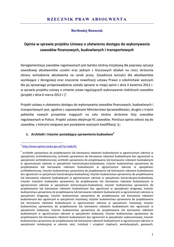 RZECZNIK PRAW ABSOLWENTA Bartłomiej Banaszak Opinia w sprawie projektu Ustawy o ułatwieniu dostępu do wykonywania zawodów finansowych, budowlanych i transportowych Dereglamentacja zawodów regulowanych jest bardzo istotną inicjatywą dla poprawy sytuacji zawodowej absolwentów uczelni oraz jednym z kluczowych działań na rzecz skrócenia okresu wchodzenia absolwenta na rynek pracy. Zasadnicze korzyści dla absolwentów wynikające z deregulacji oraz znaczenie nowelizacji ustawy Prawo o szkolnictwie wyższym dla jej sprawnego przeprowadzenia zostały opisane w mojej opinii z dnia 4 kwietnia 2012 r. w sprawie projektu ustawy o zmianie ustaw regulujących wykonywanie niektórych zawodów (projekt z dnia 6 marca 2012 r.)1. Projekt ustawy o ułatwieniu dostępu do wykonywania zawodów finansowych, budowlanych i transportowych jest, zgodnie z zapowiedziami Ministerstwa Sprawiedliwości, drugim z trzech pakietów nowych przepisów mających na celu istotne skrócenie listy zawodów regulowanych w Polsce. Projekt ustawy obejmuje 91 zawodów. Poniższa opinia odnosi się do zawodów, z którymi związane jest posiadanie wyższych kwalifikacji, tj.: 1. Architekt i inżynier posiadający uprawnienia budowlane2 1 http://www.rgnisw.nauka.gov.pl/?q=node/41 2 architekt uprawniony do projektowania lub kierowania robotami budowlanymi w ograniczonym zakresie w specjalności architektonicznej; architekt uprawniony do kierowania robotami budowlanymi bez ograniczeń w specjalności architektonicznej; architekt uprawniony do projektowania lub kierowania robotami budowlanymi w ograniczonym zakresie w specjalności konstrukcyjno-budowlanej; inżynier budownictwa uprawniony do projektowania lub kierowania robotami budowlanymi w ograniczonym zakresie w specjalności architektonicznej; inżynier budownictwa uprawniony do projektowania lub kierowania robotami budowlanymi bez ograniczeń w specjalności konstrukcyjno-budowlanej; inżynier budownictwa uprawniony do projektowania lub kierowania robotami budowlanymi w ograniczonym zakresie w specjalności konstrukcyjno-budowlanej; inżynier inżynierii środowiska uprawniony do projektowania lub kierowania robotami budowlanymi w ograniczonym zakresie w specjalności konstrukcyjno-budowlanej; inżynier budownictwa uprawniony do projektowania lub kierowania robotami budowlanymi bez ograniczeń w specjalności drogowej; inżynier budownictwa uprawniony do projektowania lub kierowania robotami budowlanymi w ograniczonym zakresie w specjalności drogowej; inżynier budownictwa uprawniony do projektowania lub kierowania robotami budowlanymi bez ograniczeń w specjalności mostowej; inżynier budownictwa uprawniony do projektowania lub kierowania robotami budowlanymi w ograniczonym zakresie w specjalności mostowej; inżynier budownictwa uprawniony do projektowania lub kierowania robotami budowlanymi bez ograniczeń w specjalności kolejowej; inżynier budownictwa uprawniony do projektowania lub kierowania robotami budowlanymi w ograniczonym zakresie w specjalności kolejowej; inżynier budownictwa uprawniony do projektowania lub kierowania robotami budowlanymi bez ograniczeń w specjalności wyburzeniowej; inżynier budownictwa uprawniony do projektowania lub kierowania robotami budowlanymi w ograniczonym zakresie w specjalności instalacyjnej w zakresie sieci, instalacji i urządzeń cieplnych, wentylacyjnych, gazowych, 1 RZECZNIK PRAW ABSOLWENTA Bartłomiej Banaszak 2. 3. 4. 5. 6. 7. 8. 9. Urbanista Rzeczoznawca samochodowy Diagnosta uprawniony do wykonywania badań technicznych pojazdów Biegły rewident Zawód usługowego prowadzenia ksiąg rachunkowych Doradca podatkowy Broker ubezpieczeniowy Agent ubezpieczeniowy wodociągowych i kanalizacyjnych; inżynier górnictwa i geologii w specjalności eksploatacja złóż uprawniony do projektowania lub kierowania robotami budowlanymi bez ograniczeń w specjalności wyburzeniowej; inżynier inżynierii wojskowej uprawniony do projektowania lub kierowania robotami budowlanymi bez ograniczeń w specjalności wyburzeniowej; inżynier telekomunikacji uprawniony do projektowania lub kierowania robotami budowlanymi bez ograniczeń w specjalności telekomunikacyjnej; inżynier telekomunikacji uprawniony do projektowania lub kierowania robotami budowlanymi w ograniczonym zakresie w specjalności telekomunikacyjnej; inżynier elektrotechnik uprawniony do projektowania lub kierowania robotami budowlanymi bez ograniczeń w specjalności telekomunikacyjnej; inżynier elektrotechnik uprawniony do projektowania lub kierowania robotami budowlanymi w ograniczonym zakresie w specjalności telekomunikacyjnej; inżynier inżynierii środowiska uprawniony do projektowania lub kierowania robotami budowlanymi bez ograniczeń w specjalności instalacyjnej w zakresie sieci, instalacji i urządzeń cieplnych, wentylacyjnych, gazowych, wodociągowych i kanalizacyjnych; inżynier inżynierii środowiska uprawniony do projektowania lub kierowania robotami budowlanymi w ograniczonym zakresie w specjalności instalacyjnej w zakresie sieci, instalacji i urządzeń cieplnych, wentylacyjnych, gazowych, wodociągowych i kanalizacyjnych; inżynier energetyk uprawniony do projektowania lub kierowania robotami budowlanymi w ograniczonym zakresie w specjalności instalacyjnej w zakresie sieci, instalacji i urządzeń cieplnych, wentylacyjnych, gazowych, wodociągowych i kanalizacyjnych; inżynier transportu w specjalności sterowanie ruchem w transporcie lub sterowanie ruchem lub zabezpieczenie ruchu pociągów lub automatyka i robotyka uprawniony do projektowania lub kierowania robotami budowlanymi w ograniczonym zakresie w specjalności instalacyjnej w zakresie sieci, instalacji i urządzeń elektrycznych i elektroenergetycznych; inżynier transportu uprawniony do projektowania lub kierowania robotami budowlanymi bez ograniczeń w specjalności kolejowej; inżynier transportu uprawniony do projektowania lub kierowania robotami budowlanymi w ograniczonym za