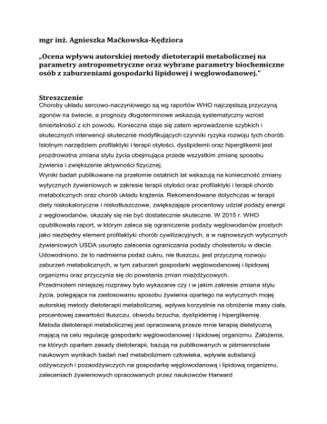 mgr inż. Agnieszka Maćkowska-Kędziora „Ocena wpływu autorskiej metody dietoterapii metabolicznej na parametry antropometryczne oraz wybrane parametry biochemiczne osób z zaburzeniami gospodarki lipidowej i węglowodanowej.” Streszczenie Choroby układu sercowo-naczyniowego są wg raportów WHO najczęstszą przyczyną zgonów na świecie, a prognozy długoterminowe wskazują systematyczny wzrost śmiertelności z ich powodu. Konieczne staje się zatem wprowadzenie szybkich i skutecznych interwencji skutecznie modyfikujących czynniki ryzyka rozwoju tych chorób. Istotnym narzędziem profilaktyki i terapii otyłości, dyslipidemii oraz hiperglikemii jest prozdrowotna zmiana stylu życia obejmująca przede wszystkim zmianę sposobu żywienia i zwiększenie aktywności fizycznej. Wyniki badań publikowane na przełomie ostatnich lat wskazują na konieczność zmiany wytycznych żywieniowych w zakresie terapii otyłości oraz profilaktyki i terapii chorób metabolicznych oraz chorób układu krążenia. Rekomendowane dotychczas w terapii diety niskokaloryczne i niskotłuszczowe, zwiększające procentowy udział podaży energii z węglowodanów, okazały się nie być dostatecznie skuteczne. W 2015 r. WHO opublikowała raport, w którym zaleca się ograniczenie podaży węglowodanów prostych jako niezbędny element profilaktyki chorób cywilizacyjnych, a w najnowszych wytycznych żywieniowych USDA usunięto zalecenia ograniczania podaży cholesterolu w diecie. Udowodniono, że to nadmierna podaż cukru, nie tłuszczu, jest przyczyną rozwoju zaburzeń metabolicznych, w tym zaburzeń gospodarki węglowodanowej i lipidowej organizmu oraz przyczynia się do powstania zmian miażdżycowych. Przedmiotem niniejszej rozprawy było wykazanie czy i w jakim zakresie zmiana stylu życia, polegająca na zastosowaniu sposobu żywienia opartego na wytycznych mojej autorskiej metody dietoterapii metabolicznej, wpływa korzystnie na obniżenie masy ciała, procentowej zawartości tłuszczu, obwodu brzucha, dyslipidemię i hiperglikemię. Metoda dietoterapii metabolicznej jest opracowaną przeze mnie terapią dietetyczną mającą na celu regulację gospodarki węglowodanowej i lipidowej organizmu. Założenia, na których oparłam zasady dietoterapii, bazują na publikowanych w piśmiennictwie naukowym wynikach badań nad metabolizmem człowieka, wpływie substancji odżywczych i pozaodżywczych na gospodarkę węglowodanową i lipidową organizmu, zaleceniach żywieniowych opracowanych przez naukowców Harward University oraz własnych doświadczeniach, zdobytych podczas pracy z pacjentami z nadwagą, otyłością i zaburzeniami metabolicznymi. Jest odmianą diety niskowęglowodanowej, ze zbilansowaną, dobraną indywidualnie podażą białka oraz zbilansowaną wg najnowszych zaleceń podażą tłuszczu oraz znacznym udziałem błonnika. W diecie nie zastosowano ograniczenia kalorycznego spożywanych posiłków oraz podaży cholesterolu. Niniejsza rozprawa stanowi ocenę wpływu dietoterapii krótkoterminowej (30 dniowej; n=200 pacjentów) i długoterminowej (6 miesięcznej; n=76 pacjentów) na parametry antropometryczne (masa ciała, BMI, obwód brzucha, procentowa zawartość tłuszczu) oraz wybrane parametry biochemiczne (stężenie TC, frakcji LDL, frakcji HDL i trójglicerydów oraz glukozy na czczo) u osób z nadwagą, otyłością, zaburzeniami gospodarki lipidowej i/lub węglowodanowej. Ocenę wpływu dietoterapii na parametry antropometryczne i wybrane parametry biochemiczne przeprowadzono dla całej grupy badanej oraz w podgrupach wydzielonych pod względem płci, masy ciała oraz rodzaju stwierdzonych zaburzeń metabolicznych (stężenia TC, LDL-C, HDL-C, TG oraz glukozy na czczo). Po 30 dniach stosowania dietoterapii metabolicznej w całej grupie dietoterapii krótkoterminowej (n=200 pacjentów) odnotowano znaczące zmiany w zakresie monitorowanych parametrów antropometrycznych i biochemicznych. Średnia redukcja masy ciała o 5,4 kg i zawartości tłuszczu o 2,2% powiązana była z równoczesną redukcją obwodu brzucha średnio o 8,9 cm. Uzyskano również redukcję stężenia glukozy na czczo o 15 mg/dl, TC o 43,6 mg/dl, LDL-C o 24,4 mg/dl oraz TG o 92,1 mg/dl, co pozwoliło na uzyskanie wartości prawidłowych w zakresie monitorowanych parametrów biochemicznych. Nie wykazano wpływu płci oraz rodzaju początkowych zaburzeń metabolicznych na efekt dietoterapii. Spośród początkowej grupy 200 osób po 6 miesiącach do ponownej analizy wpływu dietoterapii na monitorowane parametry antropometryczne i biochemiczne wyodrębniono grupę 76 osób dietoterapii długoterminowej. Były to osoby, które nadal kontynuowały dietoterapię i które po 6 miesiącach ponownie udostępniły wyniki badań biochemicznych i pomiarów antropometrycznych. Celem ponownej analizy było sprawdzenie stabilności efektów uzyskanych w pierwszym etapie i weryfikacja dalszych zmian. Przeprowadzona analiza wpływu dietoterapii długoterminowej wykazała systematyczne zmiany w zakresie parametrów antropometrycznych. Po 6 miesiącach uzyskano redukcję masy ciała o 10,1 kg, BMI o 3,5 kg/m 2, zawartości tłuszczu o 3,8% i obwodu brzucha o 15 cm. Analiza wpływu dietoterapii długoterminowej na stężenie cholesterolu całkowitego wykazała, że po początkowej znacznej redukcji nastąpił nieznaczny jego wzrost. Po 6 miesiącach stężenie TC zmniejszyło się średnio o 30 mg/dl osiągając średni poziom 213 mg/dl. Podobne zmiany odnotowano w stężeniach frakcji LDL. Po 6 miesiącach dietoterapii osiągnięto średnią wartość stężenia LDL-C w monitorowanej grupie 132,3 mg/dl, uzyskując wartości referencyjne. W przypadku cholesterolu frakcji HDL, po 30 dniach odnotowano nieznaczną redukcję stężenia, po 6 miesiącach natomiast nastąpił wzrost stężenia, szczególnie wyraźny w podgrupie osób z początkowym niskim stężeniem tej frakcji (o średnio 13%). Najbardziej znaczące efekty uzysk