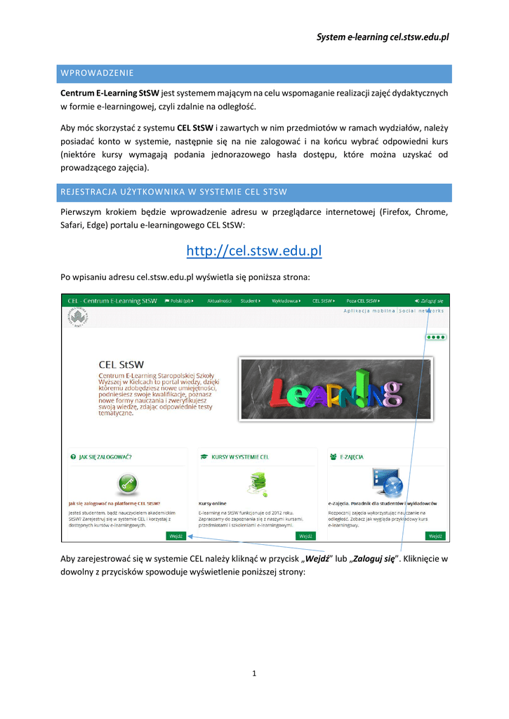 WPROWADZENIE Centrum E-Learning StSW jest systemem mającym na celu wspomaganie realizacji zajęć dydaktycznych w formie e-learningowej, czyli zdalnie na odległość. Aby móc skorzystać z systemu CEL StSW i zawartych w nim przedmiotów w ramach wydziałów, należy posiadać konto w systemie, następnie się na nie zalogować i na końcu wybrać odpowiedni kurs (niektóre kursy wymagają podania jednorazowego hasła dostępu, które można uzyskać od prowadzącego zajęcia). REJESTRACJA UŻYTKOWNIKA W SYSTEMIE CEL STSW Pierwszym krokiem będzie wprowadzenie adresu w przeglądarce internetowej (Firefox, Chrome, Safari, Edge) portalu e-learningowego CEL StSW: http://cel.stsw.edu.pl Po wpisaniu adresu cel.stsw.edu.pl wyświetla się poniższa strona: Aby zarejestrować się w systemie CEL należy kliknąć w przycisk „Wejdź” lub „Zaloguj się”. Kliknięcie w dowolny z przycisków spowoduje wyświetlenie poniższej strony: 1 Z racji, iż nie posiadamy jeszcze konta w systemie, klikamy w przycisk „Utwórz nowe konto!”. Spowoduje to wczytanie formularza rejestracyjnego, w którym należy podać następujące informacje: nazwę użytkownika – tutaj panuje pełna dowolność, np. akowalski, znowak, andrzejk, itp. hasło, które musi składać się co najmniej z ośmiu znaków, zawierając w swej nazwie – litery (duże i małe), minimum jedną cyfrę i minimum jeden znak specjalny (np. !@#). W kolejnej części należy wpisać dane użytkownika takie jak: 2 e-mail użytkownika (na który będą przychodzić później powiadomienia o wydarzeniach, zamieszczonych informacjach przez prowadzącego czy ocenionych zadaniach w kursie e-learningowym), imię i nazwisko użytkownika – dzięki któremu prowadzący Cię poprawnie zidentyfikuje, miasto, kraj. W kolejnej, ostatniej części należy wprowadzić tekst (losowo generowane znaki- - cyfry, litery) wyświetlane w pytaniu zabezpieczającym, po czym zaznaczyć pole regulaminu – zasad użytkowania serwisu. Ostatnią czynnością jest zatwierdzenie wprowadzanych danych poprzez kliknięcie w przycisk „Utwórz moje nowe konto”. Po rejestracji system CEL StSW wysyła na podany wcześniej przez użytkownika adres e-mail wiadomość z potwierdzeniem (i linkiem aktywacyjnym) założenia konta w serwisie. Aby zakończyć aktywację konta, użytkownik powinien kliknąć w link w otrzymanej wiadomości e-mail. LOGOWANIE DO SYSTEMU CEL STSW Mając już konto utworzone w serwisie cel.stsw.edu.pl użytkownik może się w nim zalogować. W tym celu należy kliknąć w przycisk „Zaloguj się” (prawy górny róg okna) i po kliknięciu, na stronie logowania podajemy swój login oraz hasło. 3 Po zalogowaniu system CEL StSW wyświetla dane użytkownika w prawym górnym rogu okna. Zaznaczenie nazwy użytkownika skutkuje wyświetleniem dodatkowych opcji tj. ustawienia profilu, kalendarz, wiadomości, prywatne plik, wpisy forum i dyskusje, a także oceny i odznaki systemowe użytkownika, opcję wyloguj. DOSTĘP DO KURSU E-LEARNINGOWEGO Po zalogowaniu użytkownik może korzystać z kursów e-learningowych. Aby wejść do odpowiedniego kursu, należy kliknąć w przycisk „Wejdź” w polu Kursy w systemie CEL. Po wejściu w dział kursy, wyświetlane są kategorie kursów. 4 Wybierz wydział Kielce, a następnie Pedagogika II stopień, po czym wyświetli się informacja o dostępnych kursach. Aby zapisać się na dany kurs, należy kliknąć w jego nazwę. Przed zapisaniem, system poprosi nas o podanie jednorazowego hasła dostępu: Hasło można otrzymać od prowadzącego, który podaje klucz dostępu do kursu na pierwszych zajęciach stacjonarnych. Można także kontaktować się z prowadzącym klikając w jego imię i nazwisko (znajdujące się pod tytułem przedmiotu). 5 Wyświetlona zostanie strona na której można wybrać przycisk „Wiadomość” – opcja dzięki której możemy napisać do prowadzącego zajęcia. Ostatnią czynnością jest napisanie wiadomości do prowadzącego, np. taką: Po uzyskaniu hasła od prowadzącego i wpisaniu klucza dostępu do kursu – można zacząć naukę i zapoznawanie się z treścią dydaktyczną. OTRZYMANIE HASŁA OD ADMINISTRATORA CEL Możliwe jest również otrzymanie hasła od administratora CEL StSW. Aby to zrobić należy skontaktować się z administratorem poprzez system CEL. W tym celu kliknij w link „Kontakt z administratorem” znajdujący się stopce strony. Pojawi się strona domowa administratora z przyciskiem „Wiadomość” – postępuj identycznie jak w przypadku wysłania wiadomości do prowadzącego zajęcia. 6