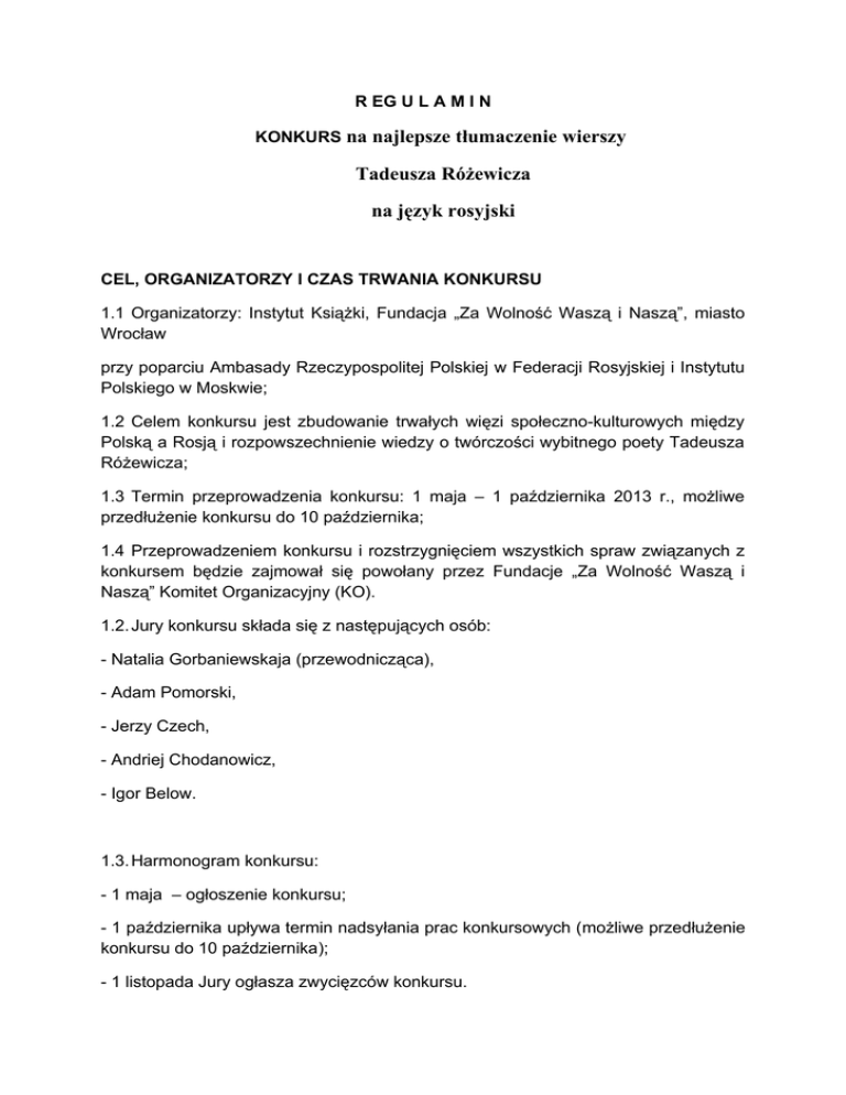 R EG U L A M I N KONKURS na najlepsze tłumaczenie wierszy Tadeusza Różewicza na język rosyjski CEL, ORGANIZATORZY I CZAS TRWANIA KONKURSU 1.1 Organizatorzy: Instytut Książki, Fundacja „Za Wolność Waszą i Naszą”, miasto Wrocław przy poparciu Ambasady Rzeczypospolitej Polskiej w Federacji Rosyjskiej i Instytutu Polskiego w Moskwie; 1.2 Celem konkursu jest zbudowanie trwałych więzi społeczno-kulturowych między Polską a Rosją i rozpowszechnienie wiedzy o twórczości wybitnego poety Tadeusza Różewicza; 1.3 Termin przeprowadzenia konkursu: 1 maja – 1 października 2013 r., możliwe przedłużenie konkursu do 10 października; 1.4 Przeprowadzeniem konkursu i rozstrzygnięciem wszystkich spraw związanych z konkursem będzie zajmował się powołany przez Fundacje „Za Wolność Waszą i Naszą” Komitet Organizacyjny (KO). 1.2. Jury konkursu składa się z następujących osób: - Natalia Gorbaniewskaja (przewodnicząca), - Adam Pomorski, - Jerzy Czech, - Andriej Chodanowicz, - Igor Below. 1.3. Harmonogram konkursu: - 1 maja – ogłoszenie konkursu; - 1 października upływa termin nadsyłania prac konkursowych (możliwe przedłużenie konkursu do 10 października); - 1 listopada Jury ogłasza zwycięzców konkursu. ZASADY KONKURSU 2.1. Do Konkursu mogą być zgłaszane tylko pracy tłumaczone osobiście przez Uczestnika, do którego przysługują Uczestnikowi nieograniczone autorskie prawa osobiste i majątkowe. 2.2. Każdy Uczestnik ma prawo zgłosić minimalne i maksymalnie 7 przetłumaczonych wierszy. 2.3. Praca konkursowa musi spełniać następujące wymagania techniczne: - format zapisu – Word; - minimalna objętość i maksymalna – 7 wierszy; - rozmiar czcionki – 12; - język tłumaczenia – z polskiego na rosyjski. WARUNKI UCZESTNICTWA 3.1. Udział w konkursie mogą brać mieszkańcy całego światu (dalej „Uczestnik”). 3.2. Wszyscy biorące udział w konkursie ponoszą odpowiedzialność za naruszenie, praw autorskich osób trzecich. 3.3. Każdy biorący udział w konkursie wyraża tym samym zgodę na opublikowanie jego prac w publikacji książkowej, która ukaże się w 2014 r. oraz na stronie internetowej Fundacji „Za Wolność Waszą i Naszą”. 3.4. Organizator nie ponosi odpowiedzialności za zgłoszenia, które nie dotarły do niego z przyczyn od niego niezależnych, m.in. wskutek awarii systemu lub łączy internetowych Uczestnika. 3.5. Organizator nie ponosi odpowiedzialności za podanie nieprawdziwych danych lub danych osoby trzeciej przez Uczestników. 3.6. Udział w Konkursie jest bezpłatny. 3.7. Uczestnik, zgłaszając się do konkursu oświadcza, iż przysługują mu wyłączne i nieograniczone prawa autorskie do nadesłanych prac. Ponadto oświadcza, że wyraża zgodę na wielokrotne, nieodpłatne publikowanie konkursowych prac oraz opublikowanie jego imienia, nazwiska oraz miejscowości zamieszkania w materiałach promocyjnych związanych z konkursem, w wydawnictwach oraz na stronach internetowych a także na ich wykorzystywanie w celach promocyjnych i marketingowych, w szczególności na utrwalanie na jakichkolwiek nośnikach, bez ograniczeń co do ilości i wielkości nakładu, oraz rozpowszechnianie poprzez publiczne udostępnianie w taki sposób, aby każdy mógł mieć do nich dostęp w miejscu i w czasie przez siebie wybranym, w szczególności w sieciach komputerowych, Internecie. Nadesłanie prac jest jednoznaczne z akceptacją niniejszego Regulaminu. ROZSTRZYGNIĘCIE KONKURSU I NAGRODY 4.1. Jury wyłania trzech laureatów i przyznaje im następujące nagrody: - pierwsza nagroda – 50 000 ros. rubli; - druga nagroda – 30 000 ros. rubli; - trzecia nagroda – 10 000 ros. rubli. 4.2. 3.2. Uczestnicy konkursu, którzy otrzymają miejsca od 1 do 10-go otrzymują dyplom i będą zaproszeni na Międzynarodowe Warsztaty. 4.3. Wręczenie nagród odbędzie się w grudniu podczas uroczystej ceremonii w Ambasadzie Rzeczypospolitej Polskiej w Federacji Rosyjskiej 4.4. Wyniki konkursu zostaną ogłoszone na stronie internetowej Fundacji „Za Wolność Waszą i Naszą”.