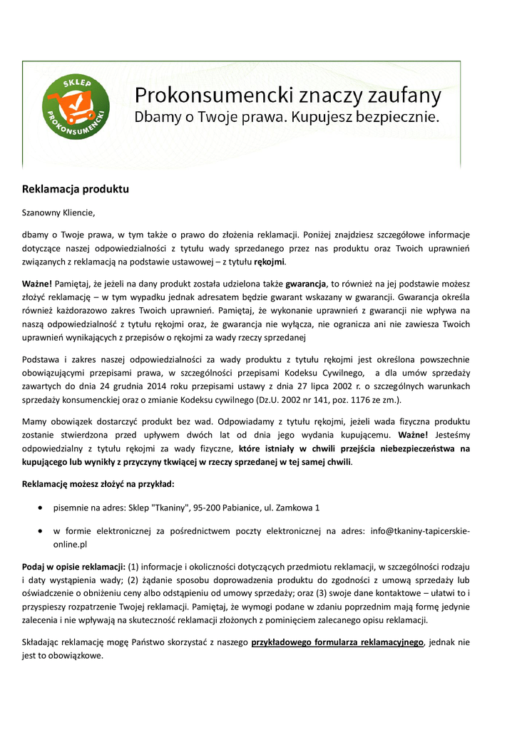 Reklamacja produktu Szanowny Kliencie, dbamy o Twoje prawa, w tym także o prawo do złożenia reklamacji. Poniżej znajdziesz szczegółowe informacje dotyczące naszej odpowiedzialności z tytułu wady sprzedanego przez nas produktu oraz Twoich uprawnień związanych z reklamacją na podstawie ustawowej – z tytułu rękojmi. Ważne! Pamiętaj, że jeżeli na dany produkt została udzielona także gwarancja, to również na jej podstawie możesz złożyć reklamację – w tym wypadku jednak adresatem będzie gwarant wskazany w gwarancji. Gwarancja określa również każdorazowo zakres Twoich uprawnień. Pamiętaj, że wykonanie uprawnień z gwarancji nie wpływa na naszą odpowiedzialność z tytułu rękojmi oraz, że gwarancja nie wyłącza, nie ogranicza ani nie zawiesza Twoich uprawnień wynikających z przepisów o rękojmi za wady rzeczy sprzedanej Podstawa i zakres naszej odpowiedzialności za wady produktu z tytułu rękojmi jest określona powszechnie obowiązującymi przepisami prawa, w szczególności przepisami Kodeksu Cywilnego, a dla umów sprzedaży zawartych do dnia 24 grudnia 2014 roku przepisami ustawy z dnia 27 lipca 2002 r. o szczególnych warunkach sprzedaży konsumenckiej oraz o zmianie Kodeksu cywilnego (Dz.U. 2002 nr 141, poz. 1176 ze zm.). Mamy obowiązek dostarczyć produkt bez wad. Odpowiadamy z tytułu rękojmi, jeżeli wada fizyczna produktu zostanie stwierdzona przed upływem dwóch lat od dnia jego wydania kupującemu. Ważne! Jesteśmy odpowiedzialny z tytułu rękojmi za wady fizyczne, które istniały w chwili przejścia niebezpieczeństwa na kupującego lub wynikły z przyczyny tkwiącej w rzeczy sprzedanej w tej samej chwili. Reklamację możesz złożyć na przykład: · pisemnie na adres: Sklep "Tkaniny", 95-200 Pabianice, ul. Zamkowa 1 · w formie elektronicznej za pośrednictwem poczty elektronicznej na adres: [email protected] Podaj w opisie reklamacji: (1) informacje i okoliczności dotyczących przedmiotu reklamacji, w szczególności rodzaju i daty wystąpienia wady; (2) żądanie sposobu doprowadzenia produktu do zgodności z umową sprzedaży lub oświadczenie o obniżeniu ceny albo odstąpieniu od umowy sprzedaży; oraz (3) swoje dane kontaktowe – ułatwi to i przyspieszy rozpatrzenie Twojej reklamacji. Pamiętaj, że wymogi podane w zdaniu poprzednim mają formę jedynie zalecenia i nie wpływają na skuteczność reklamacji złożonych z pominięciem zalecanego opisu reklamacji. Składając reklamację mogę Państwo skorzystać z naszego przykładowego formularza reklamacyjnego, jednak nie jest to obowiązkowe. Podstawowe uprawnienia kupującego w związku z reklamacją produktu Dla umów sprzedaży zawartych do 24 grudnia 2014 r. · W tym wypadku uprawnienia mają co do zasady charakter dwuetapowy, co oznacza, że masz możliwość przejścia do drugiego etapu uprawnień dopiero po uprzednim wyczerpaniu uprawnień z pierwszego etapu: · Etap: naprawa / wymiana · Jeżeli produkt jest niezgodny z umową, możesz żądać doprowadzenia go do stanu zgodnego z umową przez nieodpłatną naprawę albo wymianę na nowy, chyba że naprawa albo wymiana są niemożliwe lub wymagają nadmiernych kosztów. Przy ocenie nadmierności kosztów uwzględnia się wartość produktu zgodnego z umową oraz rodzaj i stopień stwierdzonej niezgodności, a także bierze się pod uwagę niedogodności, na jakie naraziłby Cię inny sposób zaspokojenia. · Etap: obniżenie ceny /zwrot pieniędzy Dla umów sprzedaży zawartych od 25 grudnia 2014 r. · W tym wypadu uprawnienia mają co do zasady charakter równorzędny, co oznacza, że masz możliwość korzystania od razu zarówno z pierwszej, jak i drugiej grupy uprawnień: · Grupa: obniżenie ceny /zwrot pieniędzy · Jeżeli sprzedany produkt ma wadę, możesz złożyć oświadczenie o obniżeniu ceny albo odstąpieniu od umowy, chyba że niezwłocznie i bez nadmiernych niedogodności dla Ciebie wymienimy wadliwy Produkt na wolny od wad albo wadę usuniemy. · Ważne! Ograniczenie to nie ma zastosowania, jeżeli produkt był już przez nas wymieniony lub naprawiany albo jeżeli nie uczyniliśmy zadość obowiązkowi wymiany produktu na wolny od wad lub usunięcia wady. · Jeżeli z przyczyn określonych powyżej, nie możesz żądać naprawy ani wymiany albo jeżeli nie zdołamy uczynić zadość takiemu żądaniu w odpowiednim czasie lub gdy naprawa albo wymiana narażałaby Cię na znaczne niedogodności, to masz prawo domagać się stosownego obniżenia ceny albo odstąpić od umowy. Ważne! Od umowy nie możesz odstąpić, gdy niezgodność produktu z umową jest nieistotna. Jeżeli Klientem jest konsument, może zamiast zaproponowanego przez nas zgodnie z postanowieniami powyżej usunięcia wady żądać wymiany produktu na wolny od wad albo zamiast wymiany produktu żądać usunięcia wady, chyba że doprowadzenie produktu do zgodności z umową sprzedaży w sposób wybrany przez Ciebie jest niemożliwe albo wymagałoby nadmiernych kosztów w porównaniu ze sposobem proponowanym przez nas. · Ważne! Klient nie może odstąpić od umowy, jeżeli wada jest nieistotna. · Grupa: naprawa/wymiana Jeżeli sprzedany produkt ma wadę, możesz żądać wymiany produktu na wolny od wad albo usunięcia wady. Możemy jednak odmówić zadośćuczynienia Twojemu żądaniu, jeżeli doprowadzenie do zgodności z umową produktu wadliwego w sposób wybrany przez Ciebie jest niemożliwe albo w porównaniu z drugim możliwym sposobem doprowadzenia do zgodności z umową wymagałoby nadmiernych kosztów. · Pamiętaj, że klient, który wykonuje uprawnienia z tytułu rękojmi, jest obowiązany na nasz koszt dostarczyć produkt wadliwy na adres: : Sklep "Tkaniny", 95-200 Pabianice, ul. Zamkowa 1. Jeżeli jednak ze względu na rodzaj produktu lub sposób jego zamontowania jego dostarczenie byłoby nadmiernie utrudnione, Klient obowiązany jest nam udostępnić produkt w miejscu, w którym produkt się znajduje. Ust