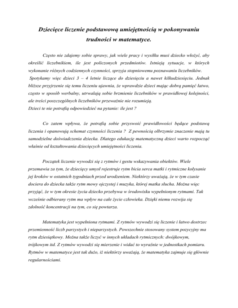 Dziecięce liczenie podstawową umiejętnością w pokonywaniu trudności w matematyce. Często nie zdajemy sobie sprawy, jak wiele pracy i wysiłku musi dziecko włożyć, aby określić liczebnikiem, ile jest policzonych przedmiotów. Istnieją sytuacje, w których wykonanie różnych codziennych czynności, sprzyja stopniowemu poznawaniu liczebników. Spotykamy więc dzieci 3 – 4 letnie liczące do dziesięciu a nawet kilkudziesięciu. Jednak bliższe przyjrzenie się temu liczeniu ujawnia, że wprawdzie dzieci mając dobrą pamięć łatwo, często w sposób werbalny, utrwalają sobie brzmienie liczebników w prawidłowej kolejności, ale treści poszczególnych liczebników przeważnie nie rozumieją. Dzieci te nie potrafią odpowiedzieć na pytanie: ile jest ? Co zatem wpływa, że potrafią sobie przyswoić prawidłowości będące podstawą liczenia i opanowują schemat czynności liczenia ? Z pewnością olbrzymie znaczenie mają tu samodzielne doświadczenia dziecka. Dlatego edukację matematyczną dzieci warto rozpocząć właśnie od kształtowania dziecięcych umiejętności liczenia. Początek liczenie wywodzi się z rytmów i gestu wskazywania obiektów. Wiele przemawia za tym, że dziecięcy umysł rejestruje rytm bicia serca matki i rytmiczne kołysanie jej kroków w ostatnich tygodniach przed urodzeniem. Niektórzy uważają, że w tym czasie dociera do dziecka także rytm mowy ojczystej i muzyka, której matka słucha. Można więc przyjąć, że w tym okresie życia dziecko przebywa w środowisku wypełnionym rytmami. Tak wcześnie odbierany rytm ma wpływ na całe życie człowieka. Dzięki niemu rozwija się zdolność koncentracji na tym, co się powtarza. Matematyka jest wypełniona rytmami. Z rytmów wywodzi się liczenie i łatwo dostrzec przemienność liczb parzystych i nieparzystych. Powszechnie stosowany system pozycyjny ma rytm dziesiątkowy. Można także liczyć w innych układach rytmicznych: dwójkowym, trójkowym itd. Z rytmów wywodzi się mierzenie i widać to wyraźnie w jednostkach pomiaru. Rytmów w matematyce jest tak dużo, iż niektórzy uważają, że matematyka zajmuje się głównie regularnościami. Początek kształtowania się umiejętności liczenia rozpoczyna się już w pierwszym roku życia dziecka np. gdy zaczyna ono wyciągać rękę wskazując dorosłemu to, co wzbudziło jego ciekawość. Dorośli doskonale pamiętają, z jaką natarczywością dziecko to czyni: tak długo pokazuje przedmiot, aż dorosły na niego spojrzy i coś powie. Dorośli na całym świecie zachowują się tutaj podobnie. Spoglądają tam, gdzie pokazuje dziecko i pytają: To?, Ten?, Ta? Upewniwszy się, podają nazwę obiektu. Jeżeli w miejscu wskazanym przez dziecko znajduje się więcej niż jeden przedmiot, używają także liczebników i traktują je tak, jak zastępcze nazwy przedmiotów. Mówią na przykład: To jabłko i to jabłko...Jeden, dwa. Dwa jabłka. Taki jest początek liczenia. Trzeba jednak sześciu lat intensywnych ćwiczeń, aby w umyśle dziecka ukształtowały się następujące umiejętności: · sprawne liczenie przedmiotów z przestrzeganiem pewnych prawidłowości, co pozwala dziecku rozróżniać prawidłowe liczenie od błędnego, · wyznaczanie wyniku dodawania i odejmowania: najpierw w trakcie osobistej manipulacji konkretnymi przedmiotami (po dodaniu lub zabraniu kilku), potem licząc na palcach i wreszcie rachując w pamięci, już na poziomie symbolicznym, · ustalanie, czy w porównywanych zbiorach jest tyle samo elementów, a także w którym jest ich więcej lub mniej. Żeby nie pomylić tych umiejętności z tym, czego dziecko będzie się uczyło w szkole, nazywa się je dziecięcym liczeniem . Rozwija się ono w umyśle w podobny sposób, jak dziecko uczy się mówić i opanowuje gramatykę języka ojczystego. W obu przypadkach istotną rolę odgrywa zdolność do wychwytywania prawidłowości. Dzięki niej dziecko koncentruje się na tym, co istotne i pomija to, co w danym przypadku jest nieważne. Pamiętając o mnogości działań wchodzących w zakres dziecięcego liczenia miejmy świadomość, że kształtowanie umiejętności liczenia trwa kilka lat. Tak więc rozwijając u dzieci umiejętność liczenia pamiętajmy o paru bardzo ważnych zasadach: Trzeba zachęcać dziecko do liczenia, pokazywać, jak się liczy, liczyć razem z nim. Jeśli chcemy, aby dziecko opanowało umiejętność liczenia, to ono musi być maksymalnie aktywne, ono ma manipulować przedmiotami i dostrzegać prawidłowości. My mamy mu w tym tylko pomóc i czuwać, aby proces uczenia przebiegał prawidłowo. Nie stosujmy ograniczeń w liczeniu. Dziecko ma liczyć dokąd chce i jak długo potrafi. Niezwykle ważne jest podpowiadanie zapomnianych liczebników. Umożliwia to dziecku liczenie w coraz większym zakresie, uczy wypowiadać liczebniki we właściwej kolejności. Pozwala dziecku usłyszeć regularności w brzmieniu liczebników. Początkowo liczenie powinno dobywać się na przedmiotach jednorodnych. Po nabraniu wprawy i doskonaleniu czynności liczenia można liczyć przedmioty niejednorodne, które znajdują się na wspólnym terytorium lub są w jakiś sposób powiązane. Doskonalenie umiejętności liczenia przedmiotów realizowane musi być równocześnie z ustalaniem, gdzie jest więcej, a gdzie mniej przedmiotów oraz z kształtowaniem się umiejętności dodawania i odejmowania, gdyż wszystkie te czynności zaliczane są do dziecięcego liczenia. Kształtowanie dziecięcego liczenia powinno być wtopione w codzienne zajęcia, dosłownie w każdą sytuację. Oprócz wykorzystywania naturalnych sytuacji życiowych trzeba formułować specjalne zadania i ćwiczenia, a także organizować gry i zabawy, które będą wyraźnie nastawione na kształtowanie dziecięcych umiejętności. Przy organizowaniu tego typu ćwiczeń i zabaw bardzo ważne jest dostosowanie ich do rzeczywistych możliwości dziecka. Dlatego trzeba pamięta