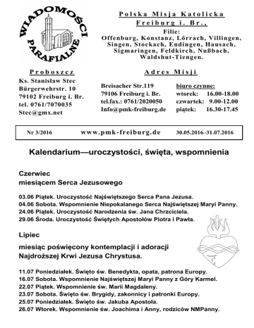 Polska Misja Katolicka Freiburg i. Br., Filie: Offenburg, Konstanz, Lörrach, Villingen, Singen, Stockach, Endingen, Hausach, Sigmaringen, Feldkirch, Nußbach, Waldshut-Tiengen. Proboszcz Adres Misji Ks. Stanisław Stec Bürgerwehrstr. 10 79102 Freiburg i. Br. tel. 0761/7070035 [email protected] Nr 3/2016 Breisacher Str.119 79106 Freiburg i. Br. tel.fax.: 0761/2020050 [email protected] www.pmk-freiburg.de biuro czynne: wtorek: 16.00-18.00 czwartek: 9.00-12.00 piątek: 16.30-17.45 30.05.2016–31.07.2016 Kalendarium—uroczystości, święta, wspomnienia Czerwiec miesiącem Serca Jezusowego 03.06 Piątek. Uroczystość Najświętszego Serca Pana Jezusa. 04.06 Sobota. Wspomnienie Niepokalanego Serca Najświętszej Maryi Panny. 24.06 Piątek. Uroczystość Narodzenia św. Jana Chrzciciela. 29.06 Środa. Uroczystość Świętych Apostołów Piotra i Pawła. Lipiec miesiąc poświęcony kontemplacji i adoracji Najdroższej Krwi Jezusa Chrystusa. 11.07 Poniedziałek. Święto św. Benedykta, opata, patrona Europy. 16.07 Sobota. Wspomnienie Najświętszej Maryi Panny z Góry Karmel. 22.07 Piątek. Wspomnienie św. Marii Magdaleny. 23.07 Sobota. Święto św. Brygidy, zakonnicy i patronki Europy. 25.07 Poniedziałek. Święto św. Jakuba Apostoła. 26.07 Wtorek. Wspomnienie św. Joachima i Anny, rodziców NMPanny. Freiburg _ Kościół św. Józefa _ Breisacher Str.119 30.05.16 poniedziałek godz. 10.00 Msza św. 31.05.16 wtorek godz. 18.30 Msza św. z naboż. majowym 03.06.16 piątek Najśw. Serca Pana Jezusa godz. 18.00 Adoracja Najśw. Sakramentu godz. 18.30 Msza św. 04.06.16 sobota Niepokalanego Serca Maryi godz. 17.30 Msza św. (w języku niemieckim) z okazji złotego jubileuszu kapłaństwa (50-lecia) ks. Józefa Haag 05.06.16 X Niedziela zwykła godz. 11.00 Msza św. 06.06.16 poniedziałek godz. 10.00 Msza św. 07.06.16 wtorek godz. 18.30 Msza św. z adoracją Najśw. Sakramentu i nabożeństwem modlitewnym 10.06.16 piątek godz. 18.00 Adoracja Najśw. Sakramentu godz. 18.30 Msza św. 12.06.16 XI Niedziela zwykła godz. 11.00 Msza św. w int. Barbary i Łukasza z racji 10-tej rocznicy ślubu, dziękczynna z prośbą o błogosł. Boże dla całej rodziny 13.06.16 poniedziałek godz. 10.00 Msza św. 14.06.16 wtorek godz. 18.30 Msza św. 17.06.16 piątek godz. 18.00 Adoracja Najśw. Sakramentu godz. 18.30 Msza św. 19.06.16 XII Niedziela zwykła godz. 11.00 Msza św. z racji 1-szej rocznicy urodzin w int. Vivien Piechaczek, o Boże błogosł. dla całej rodziny 20.06.16 poniedziałek godz. 10.00 Msza św. 21.06.16 wtorek godz. 18.30 Msza św. 24.06.16 piątek Narodzenie św. Jana Chrzciciela godz. 18.00 Adoracja Najśw. Sakramentu godz. 18.30 Msza św. 26.06.16 XIII Niedziela zwykła godz. 11.00 Msza św. 27.06.16 poniedziałek godz. 10.00 Msza św. 28.06.16 wtorek godz. 18.30 Msza św. w int. Bogusława z racji urodzin, dziękczynna z prośbą o dary Ducha św. przez wstawiennictwo Matki Przenajświętszej 01.07.16 piątek godz. 18.00 Adoracja Najśw. Sakramentu godz. 18.30 Msza św. 03.07.16 XIV Niedziela zwykła godz. 11.00 Msza św. w int. rodziny Skrzypiec 04.07.16 poniedziałek godz. 10.00 Msza św. 05.07.16 wtorek godz. 18.30 Msza św. z adoracją Najśw. Sakramentu i nabożeństwem modlitewnym 08.07.16 piątek godz. 18.00 Adoracja Najśw. Sakramentu godz. 18.30 Msza św. 10.07.16 XV Niedziela zwykła godz. 11.00 Msza św. za zm.+ Bernarda Brychcy 11.07.16 poniedziałek godz. 10.00 Msza św. 12.07.16 wtorek godz. 18.30 Msza św. 15.07.16 piątek godz. 18.00 Adoracja Najśw. Sakramentu godz. 18.30 Msza św. 17.07.16 XVI Niedziela zwykła godz. 11.00 Msza św. w int. Grażyny z racji urodzin, dziękczynna z prośbą o potrzebne łaski na dalsze lata 18.07.16 poniedziałek godz. 10.00 Msza św. 19.07.16 wtorek godz. 18.30 Msza św. 22.07.16 piątek godz. 18.00 Adoracja Najśw. Sakramentu godz. 18.30 Msza św. 24.07.16 XVII Niedziela zwykła godz. 11.00 Msza św. za zm.+ Władysława Kawik (15 rocz.) oraz za zm. ++ siostry, braci i rodziców 25.07.16 poniedziałek godz. 10.00 Msza św. 26.07.16 wtorek godz. 18.30 Msza św. 29.07.16 piątek godz. 18.00 Adoracja Najśw. Sakramentu godz. 18.30 Msza św. 31.07.16 XVIII Niedziela zwykła godz. 11.00 Msza św. w int. Łukasza z racji ur., dziękcz. z prośbą o dalszą pomoc Bożą dla niego i całej rodziny Endingen Kościół św. Marcina Marktplatz 14.06.16 wtorek godz. 18.30 Spowiedź św. godz. 19.00 Msza św. (niem-polska) 12.07.16 wtorek godz. 18.30 Spowiedź św. godz. 19.00 Msza św. (niem-polska) 09.08.16 wtorek godz. 18.30 Spowiedź św. godz. 19.00 Msza św. (niem-polska) Hausach Kościół św. Maurycego Klosterstr.21 11.06.16 sobota godz. 18.30 Msza św. (niem-polska) 16.07.16 sobota godz. 18.30 Msza św. (niem-polska) 20.08.16 sobota godz. 18.30 Msza św. (niem-polska) Offenburg _ Kościół św. Krzyża _ Pfarrstr.4 05.06.16 X Niedziela zwykła godz. 16.00 Msza św. za zm.+ Janusza Zimmermann i za zm.+ Zofię Strachalską 03.07.16 XIV Niedziela zwykła godz. 16.00 Msza św. za zm.+ Siegfrieda Schary (3 rocz.) 07.08.16 XIX Niedziela zwykła godz. 16.00 Msza św. za zm.++ Irenę, Józefa i Annę Smoczok w rocznicę śmierci Konstanz Kościół Bruder Klaus _ Markgrafenstr. 34 12.06.16 XI Niedziela zwykła godz. 16.00 Msza św. 10.07.16 XV Niedziela zwykła godz. 16.00 Msza św. za zm.++ Barbarę i Konrada Liebek 14.08.16 XX Niedziela zwykła godz. 16.00 Msza św. Lörrach-Brombach Kościół św. Józefa _ Lörracher Str. 37 19.06.16 XII Niedziela zwykła godz. 14.00 Msza św. za zm.++ Helenę, Jana i Stefana Pazera 17.07.16 XVI Niedziela zwykła godz. 14.00 Msza św. 21.08.16 XXI Niedziela zwykła godz. 14.00 Msza św. Villingen _ Kościół św. Krzyża __ Hochstr. 34 26.06.16 XIII Niedziela zwykła godz. 14.00 Msza św. za zm.+ Orfeusza Gonerę (8 rocz.) i zm.+ Piotra Tkaczuk 31.07.16 XVIII Niedziela zwykła godz. 14.00 Msza św. za zm.+ Georga Białas Singen Kościół św. Elżbiety Überlinger Str.1 26.06.16 XIII Niedziela 