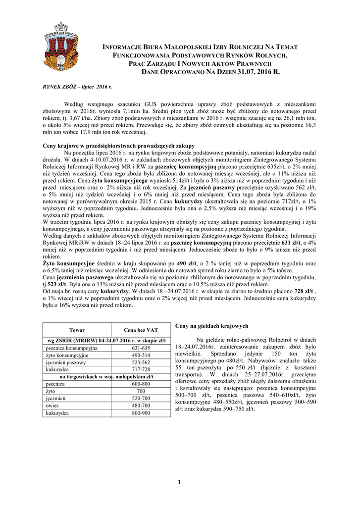 INFORMACJE BIURA MAŁOPOLSKIEJ IZBY ROLNICZEJ NA TEMAT FUNKCJONOWANIA PODSTAWOWYCH RYNKÓW ROLNYCH, PRAC ZARZĄDU I NOWYCH AKTÓW PRAWNYCH DANE OPRACOWANO NA DZIEŃ 31.07. 2016 R. RYNEK ZBÓŻ – lipiec 2016 r. Według wstępnego szacunku GUS powierzchnia uprawy zbóż podstawowych z mieszankami zbożowymi w 2016r. wyniosła 7,1mln ha. Średni plon tych zbóż może być zbliżony do notowanego przed rokiem, tj. 3,67 t/ha. Zbiory zbóż podstawowych z mieszankami w 2016 r. wstępnie szacuje się na 26,1 mln ton, o około 5% więcej niż przed rokiem. Przewiduje się, że zbiory zbóż ozimych ukształtują się na poziomie 16,3 mln ton wobec 17,9 mln ton rok wcześniej. Ceny krajowe w przedsiębiorstwach prowadzących zakupy Na początku lipca 2016 r. na rynku krajowym zboża podstawowe potaniały, natomiast kukurydza nadal drożała. W dniach 4-10.07.2016 r. w zakładach zbożowych objętych monitoringiem Zintegrowanego Systemu Rolniczej Informacji Rynkowej MR i RW za pszenicę konsumpcyjną płacono przeciętnie 635zł/t, o 2% mniej niż tydzień wcześniej. Cena tego zboża była zbliżona do notowanej miesiąc wcześniej, ale o 11% niższa niż przed rokiem. Cena żyta konsumpcyjnego wyniosła 514zł/t i była o 3% niższa niż w poprzednim tygodniu i niż przed miesiącem oraz o 2% niższa niż rok wcześniej. Za jęczmień paszowy przeciętnie uzyskiwano 562 zł/t, o 5% mniej niż tydzień wcześniej i o 6% mniej niż przed miesiącem. Cena tego zboża była zbliżona do notowanej w porównywalnym okresie 2015 r. Cena kukurydzy ukształtowała się na poziomie 717zł/t, o 1% wyższym niż w poprzednim tygodniu. Jednocześnie była ona o 2,5% wyższa niż miesiąc wcześniej i o 19% wyższa niż przed rokiem. W trzecim tygodniu lipca 2016 r. na rynku krajowym obniżyły się ceny zakupu pszenicy konsumpcyjnej i żyta konsumpcyjnego, a ceny jęczmienia paszowego utrzymały się na poziomie z poprzedniego tygodnia. Według danych z zakładów zbożowych objętych monitoringiem Zintegrowanego Systemu Rolniczej Informacji Rynkowej MRiRW w dniach 18–24 lipca 2016 r. za pszenicę konsumpcyjną płacono przeciętnie 631 zł/t, o 4% mniej niż w poprzednim tygodniu i niż przed miesiącem. Jednocześnie zboże to było o 9% tańsze niż przed rokiem. Żyto konsumpcyjne średnio w kraju skupowano po 490 zł/t, o 2 % taniej niż w poprzednim tygodniu oraz o 6,5% taniej niż miesiąc wcześniej. W odniesieniu do notowań sprzed roku ziarno to było o 5% tańsze. Cena jęczmienia paszowego ukształtowała się na poziomie zbliżonym do notowanego w poprzednim tygodniu, tj.523 zł/t. Była ona o 13% niższa niż przed miesiącem oraz o 10,5% niższa niż przed rokiem. Od maja br. rosną ceny kukurydzy. W dniach 18 –24.07.2016 r. w skupie za ziarno to średnio płacono 728 zł/t , o 1% więcej niż w poprzednim tygodniu oraz o 2% więcej niż przed miesiącem. Jednocześnie cena kukurydzy była o 16% wyższa niż przed rokiem. Towar Cena bez VAT wg ZSRIR (MRIRW) 04-24.07.2016 r. w skupie zł/t pszenica konsumpcyjna 631-635 żyto konsumpcyjne 490-514 jęczmień paszowy 523-562 kukurydza 717-728 na targowiskach w woj. małopolskim zł/t pszenica 600-800 żyto 700 jęczmień 520-700 owies 480-700 kukurydza 800-900 Ceny na giełdach krajowych Na giełdzie rolno-paliwowej Rolpetrol w dniach 18–24.07.2016r. zainteresowanie zakupem zbóż było niewielkie. Sprzedano jedynie 150 ton żyta konsumpcyjnego po 480zł/t. Nabywców znalazło także 55 ton pszenżyta po 550 zł/t (łącznie z kosztami transportu). W dniach 25–27.07.2016r. przeciętne ofertowe ceny sprzedaży zbóż uległy dalszemu obniżeniu i kształtowały się następująco: pszenica konsumpcyjna 500–700 zł/t, pszenica paszowa 540–610zł/t, żyto konsumpcyjne 480–550zł/t, jęczmień paszowy 500–590 zł/t oraz kukurydza 590–750 zł/t. 1 RYNEK TRZODY CHLEWNEJ I ŻYWCA WOŁOWEGO Utrzymująca się od wielu tygodni wysoka cena skupu świń z jednej strony jest pozytywnym zjawiskiem, bo przecież hodowcy, którzy przetrwali najgorsze miesiące mogą w końcu odrabiać straty. Trzoda chlewna Ceny zakupu żywca W dniach 4–10.07.2016 r. średnia krajowa cena zakupu żywca wieprzowego w zakładach mięsnych monitorowanych przez Zintegrowany System Rolniczej Informacji Rynkowej MRiRW ukształtowała się na poziomie 5,35 zł/kg , o 2% wyższym niż tydzień wcześniej i o 9% wyższym niż przed miesiącem. W odniesieniu do notowań sprzed roku cena tego żywca była o 22% wyższa. W przedostatnim tygodniu lipca br. ceny zakupu trzody chlewnej ulegały niewielkim zmianom zarówno w kraju, jak i na rynku unijnym. W dniach 18–24.07.2016 r. zakłady mięsne objęte monitoringiem Zintegrowanego Systemu Rolniczej Informacji Rynkowej MRiRW kupowały żywiec wieprzowy średnio po 5,39zł/kg wobec 5,41 zł/kg w poprzednim tygodniu. Żywiec ten był jednak o 6% droższy niż miesiąc wcześniej oraz o 23% droższy niż przed rokiem. Krajowe ceny zbytu mięsa W dniach 18–24.07.2016 r. zakłady mięsne zbywały półtusze wieprzowe średnio po 7,67zł/kg, nieco (o 2 gr/kg) drożej niż w poprzednim tygodniu i o 6%drożej niż przed miesiącem. W ciągu roku półtusze wieprzowe podrożały o 22%. Towar Cena VAT bez Zmiana tyg. Wg ZSRJR (MRiRW) 18-24.07.2016 r. w skupie zł/kg żywiec wieprzowy 5,39  żywiec wołowy 5,99  kurczęta typu brojler 3,55  indyki 5,00  w zbycie zł/kg półtusze wieprzowe 7,67  ćwierćtusze wołowe 12,74  Tuszki kurcząt 65%” 5,77  tuszki indyków 8,10  na targowiskach zł/szt. prosięta 158,27  Klasa półtusz wieprzowych wg SEUROP CENA [zł/tonę] [MPS] 03.07. 2016 24.07. 2016 [MPC] 03.07. 2016 24.07. 2016 POLSKA klasa S 7016 7 221 6 878 7 080 klasa E 6 922 7 124 6 786 6 985 klasa U 6 526 6 697 6 398 6 566 klasa R 6 062 6 241 5 943 6 118 klasa O 5 393 5 700 5 287 5 588 klasa P 4 278 5 382 4 194 5 276 m mpc – masa poubojowa ciepła, mps – masa poubojowa schłodzona Ceny prosiąt W przedostatnim tygodni