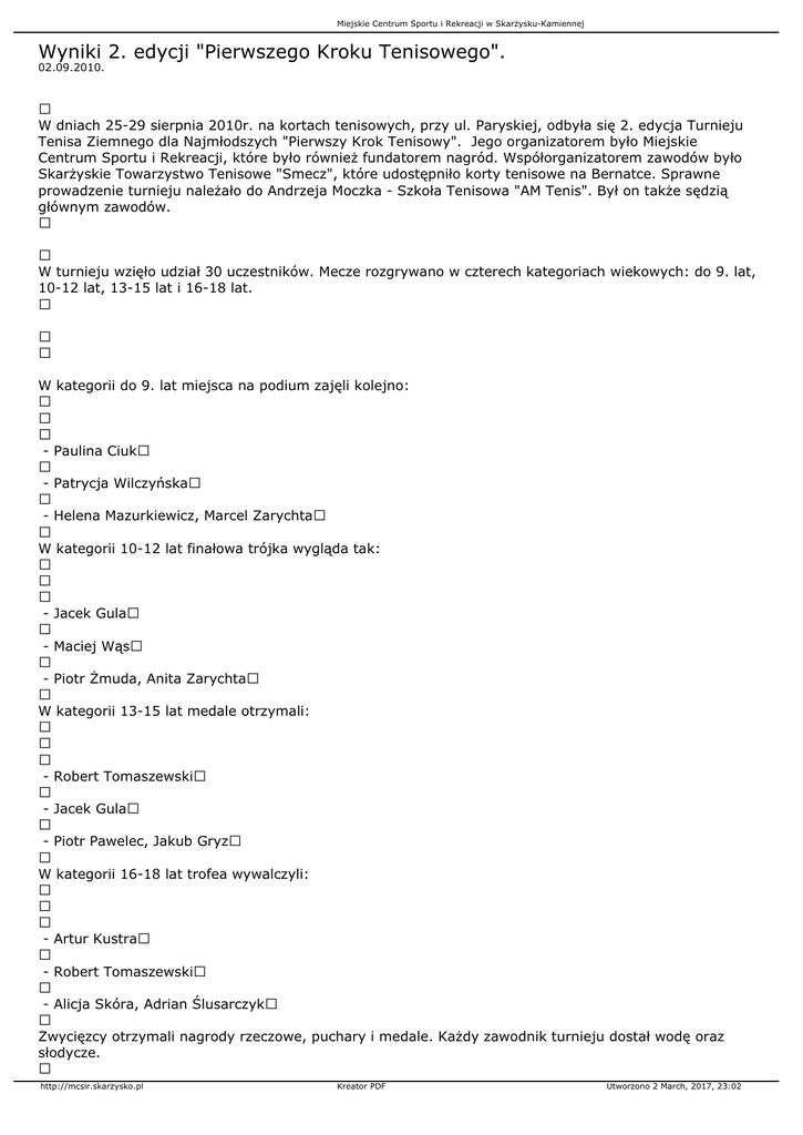 Miejskie Centrum Sportu i Rekreacji w Skarżysku-Kamiennej Wyniki 2. edycji "Pierwszego Kroku Tenisowego". 02.09.2010. W dniach 25-29 sierpnia 2010r. na kortach tenisowych, przy ul. Paryskiej, odbyła się 2. edycja Turnieju Tenisa Ziemnego dla Najmłodszych "Pierwszy Krok Tenisowy". Jego organizatorem było Miejskie Centrum Sportu i Rekreacji, które było również fundatorem nagród. Współorganizatorem zawodów było Skarżyskie Towarzystwo Tenisowe "Smecz", które udostępniło korty tenisowe na Bernatce. Sprawne prowadzenie turnieju należało do Andrzeja Moczka - Szkoła Tenisowa "AM Tenis". Był on także sędzią głównym zawodów. W turnieju wzięło udział 30 uczestników. Mecze rozgrywano w czterech kategoriach wiekowych: do 9. lat, 10-12 lat, 13-15 lat i 16-18 lat. W kategorii do 9. lat miejsca na podium zajęli kolejno: - Paulina Ciuk - Patrycja Wilczyńska - Helena Mazurkiewicz, Marcel Zarychta W kategorii 10-12 lat finałowa trójka wygląda tak: - Jacek Gula - Maciej Wąs - Piotr Żmuda, Anita Zarychta W kategorii 13-15 lat medale otrzymali: - Robert Tomaszewski - Jacek Gula - Piotr Pawelec, Jakub Gryz W kategorii 16-18 lat trofea wywalczyli: - Artur Kustra - Robert Tomaszewski - Alicja Skóra, Adrian Ślusarczyk Zwycięzcy otrzymali nagrody rzeczowe, puchary i medale. Każdy zawodnik turnieju dostał wodę oraz słodycze. http://mcsir.skarzysko.pl Kreator PDF Utworzono 2 March, 2017, 23:02 Miejskie Centrum Sportu i Rekreacji w Skarżysku-Kamiennej Rywalizacja przebiegała w atmosferze fair play i uczestnicy turnieju zadeklarowali swój udział w następnych zawodach. http://mcsir.skarzysko.pl Kreator PDF Utworzono 2 March, 2017, 23:02