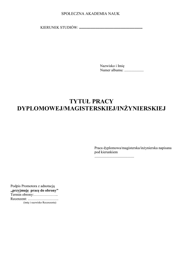 SPOŁECZNA AKADEMIA NAUK KIERUNEK STUDIÓW: ....................................................... Nazwisko i Imię Numer albumu: ..................... TYTUŁ PRACY DYPLOMOWEJ/MAGISTERSKIEJ/INŻYNIERSKIEJ Praca dyplomowa/magisterska/inżynierska napisana pod kierunkiem ........................................... Podpis Promotora z adnotacją „przyjmuję pracę do obrony” Termin obrony:……………….. Recenzent: ……………………. (imię i nazwisko Recenzenta) Społeczna Akademia Nauk w Łodzi FORMA PRACY DYPLOMOWEJ/MAGISTERSKIEJ I ZASADY EGZAMINU DYPLOMOWEGO/MAGISTERSKIEGO/INŻYNIERSKIEGO Strona tytułowa – w załączeniu. Tytuł pracy dużymi (drukowanymi) literami wypośrodkowany. Strony tytułowej nie numerujemy, ale uwzględniamy ją przy numeracji dalszych stron. 2. Kolejność stron pracy: a) Spis treści; b) Wstęp; c) Część podstawowa pracy podzielona na rozdziały. Każdy rozdział rozpoczynamy od nowej strony, natomiast wewnątrz rozdziałów nie zostawiamy pustych miejsc (nie dopisanych do końca stron); d) Podsumowanie (zakończenie, wnioski) – rozpoczynamy na nowej stronie; e) Bibliografia (rozpoczynamy na nowej stronie) w następującej kolejności: • Pozycje książkowe; • Artykuły z czasopism; • Akty prawne (jeżeli były wykorzystywane); • Inne źródła (np.: materiały statystyczne, raporty, sprawozdania, adresy internetowe itp.). f) Spis tabel, spis wykresów, spis rysunków, spis załączników –spis tabel rozpoczynamy na nowej stronie, pozostałe piszemy w sposób ciągły; g) Załączniki; h) Oświadczenie, że praca została napisana samodzielnie – wzór w załączeniu. 3. Zasady normalizacji tekstu: - Tekst podstawowy: Czcionka Times New Roman, Standardowy 12 pt., odstępy między wierszami 1,5. - Słowo Rozdział I (II, III) oraz TYTUŁ ROZDZIAŁU piszemy czcionką pogrubioną 18 pt., wyśrodkując je (bez podkreśleń). - Tytuły podrozdziałów piszemy czcionką 15pt. i numerujemy je kolejno (np.: 1, 2, ...). Tytuły punktów i ewentualnie podpunktów piszemy czcionką 13pt. i numerujemy je (np.: 1.1., 1.2., 1.3., ... ewentualnie 1.1.1., 1.1.2., ...). W obu przypadkach nie stosujemy podkreśleń. - W zależności od potrzeb w tekście podstawowym stosować można podkreślenia, pogrubienia, kursywę – celu podkreślenia znaczenia określonych pojęć, klasyfikacji itp. - Tytuł tabel, rysunków, wykresów, piszemy tekstem pogrubionym 13 pt. – obowiązuje ich numeracja ciągła dla całej pracy. Pod tabelą, rysunkiem, wykresem umieszczamy źródło (czcionka 11 pt.). - Przypisy i odnośniki umieszczamy na dole każdej strony – obowiązuje numeracja ciągła dla całej pracy. - Marginesy: lewy 3 cm, prawy 2 cm, górny 2,5 cm, dolny 2,5 cm. - Numeracja stron w prawym dolnym rogu. 4. Przypisy: Zarówno dosłowne cytowanie, jak też powoływanie się na cudze myśli własnymi słowami musi być udokumentowane – w przeciwnym przypadku mamy do czynienia z plagiatem. Nie można dosłownie przepisywać całych partii cytowanych publikacji, należy pisać własnymi słowami starając się korzystać z kilku pozycji traktujących o tym samym problemie. W przypadku powołania się po raz pierwszy na określoną publikację w odnośniku podajemy pełny jej opis bibliograficzny wraz z numerem strony, przy kolejnych powołaniach się na ta publikację obowiązuje forma skrócona. 5. UWAGA!!!!! Prace magisterskie/licencjackie/inżynierskie należy składać w dziekanacie 4 tygodnie przed wyznaczonym terminem obrony. Pracy nie należy oprawiać, kartki z pracą należy przedziurkować i przewiązać sznurkiem naturalnym (do pobrania w dziekanacie), spakować w teczkę. Praca musi być podpisana przez promotora na stronie tytułowej oraz drukowana dwustronnie: 2 strony na arkusz (plik/drukuj/2 strony na arkusz) Składamy również: • indeks • Oświadczenie o samodzielności pisania pracy (należy dołączyć jako ostatnia strona w pracy + jedno luzem ) • zdjęcia 5 szt. podpisane na odwrocie imię, nazwisko i numer albumu (format 4,5 x 6,5 cm) • płytę z wersją pracy w formacie Word i w Pdf opisaną imieniem, nazwiskiem, numerem albumu i tytułem pracy oraz umieszczoną w papierowej kopercie • kartę obiegową • legitymację podpisaną przez studenta • zaświadczenie o odbytych praktykach 6. Egzamin dyplomowy odbywa się przed Komisją a warunkiem przystąpienia do niego jest zaliczenie ostatniej sesji, złożenie pracy dyplomowej/magisterskiej i uregulowanie wszystkich spraw formalnych wynikających z regulaminu studiów (wniesienie opłat, rozliczenie z biblioteką). 7. Ocena na dyplomie wystawiana jest na podstawie średniej ważonej określanej jako suma: 1. [średnia ocen ze studiów x 0,6] +[ocena z pracy dyplomowej wystawionej przez promotora x 0,10]+ [ ocena z pracy dyplomowej wystawionej przez recenzenta x 0,10] + [ocena z egzaminu dyplomowego x 0,20] Wynik wyrównuje się do pełnej oceny zgodnie z zasadą: a) do 3,50 – dostateczny b) od 3,51 do 4,50 – dobry c) od 4,51 do 5,00 – bardzo dobry 9. Warunkiem wpisania na dyplomie oceny dobrej jest uzyskanie z toku studiów średniej ocen nie niższej niż 3,25 10. W wyjątkowych przypadkach Komisja Egzaminacyjna może podwyższyć ocenę o jeden stopień jeżeli w ostatnim roku studiów student osiągnął średnią ocen nie niższą niż 4,80, oraz uzyskał ocenę bardzo dobre od promotora i recenzenta z pracy, a także z egzaminu dyplomowego. 8. TEKST PRACY TEKST PRACY TEKST PRACY TEKST PRACY TEKST PRACY TEKST PRACY TEKST PRACY TEKST PRACY TEKST PRACY TEKST PRACY TEKST PRACY TEKST PRACY TEKST PRACY TEKST PRACY TEKST PRACY TEKST PRACY TEKST PRACY TEKST PRACY TEKST PRACY TEKST PRACY TEKST PRACY TEKST PRACY TEKST PRACY TEKST PRACY TEKST PRACY TEKST PRACY TEKST PRACY TEKST PRACY TEKST PRACY TEKST PRACY TEKST PRACY TEKST PRACY TEKST PRACY TEKST PRACY TEKST PRACY TEKST PRACY TEKST PRACY TEKST PRACY TEKST PRACY TEKST PRACY TEKST PRACY TEKST PRACY TEKST PRACY TE
