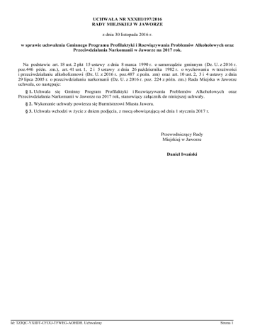 UCHWAŁA NR XXXIII/197/2016 RADY MIEJSKIEJ W JAWORZE z dnia 30 listopada 2016 r. w sprawie uchwalenia Gminnego Programu Profilaktyki i Rozwiązywania Problemów Alkoholowych oraz Przeciwdziałania Narkomanii w Jaworze na 2017 rok. Na podstawie art. 18 ust. 2 pkt 15 ustawy z dnia 8 marca 1990 r. o samorządzie gminnym (Dz. U. z 2016 r. poz.446 późn. zm.), art. 41 ust. 1, 2 i 5 ustawy z dnia 26 października 1982 r. o wychowaniu w trzeźwości i przeciwdziałaniu alkoholizmowi (Dz. U. z 2016 r. poz.487 z poźn. zm) oraz art. 10 ust. 2, 3 i 4 ustawy z dnia 29 lipca 2005 r. o przeciwdziałaniu narkomanii (Dz. U. z 2016 r. poz. 224 z późn. zm.) Rada Miejska w Jaworze uchwala, co następuje: § 1. Uchwala się Gminny Program Profilaktyki i Rozwiązywania Problemów Alkoholowych oraz Przeciwdziałania Narkomanii w Jaworze na 2017 rok, stanowiący załącznik do niniejszej uchwały. § 2. Wykonanie uchwały powierza się Burmistrzowi Miasta Jawora. § 3. Uchwała wchodzi w życie z dniem podjęcia, z mocą obowiązującą od dnia 1 stycznia 2017 r. Przewodniczący Rady Miejskiej w Jaworze Daniel Iwański Id: TZJQC-YXIDT-CFJXJ-TFWEG-AOHDH. Uchwalony Strona 1 Gminny Program Profilaktyki i Rozwiązywania Problemów Alkoholowych oraz Przeciwdziałania Narkomanii w Jaworze na 2017 rok. GMINNY PROGRAM PROFILAKTYKI I ROZWIĄZYWANIA PROBLEMÓW ALKOHOLOWYCH ORAZ PRZECIWDZIAŁANIA NARKOMANII W JAWORZE NA 2017 ROK Jawor 2016 Id: TZJQC-YXIDT-CFJXJ-TFWEG-AOHDH. Uchwalony Strona 1 Gminny Program Profilaktyki i Rozwiązywania Problemów Alkoholowych oraz Przeciwdziałania Narkomanii w Jaworze na 2017 rok. Rozdział I Wstęp Gminny Program Profilaktyki i Rozwiązywania Problemów Alkoholowych oraz Przeciwdziałania Narkomanii na 2017 rok (zwany dalej Gminnym Programem) określa lokalną strategię w zakresie profilaktyki oraz minimalizacji szkód społecznych i indywidualnych wynikających z używania alkoholu i narkotyków. Gminny program jest kontynuacją szeregu działań, zainicjowanych w latach ubiegłych zgodnych z kierunkami zawartymi w aktach prawnych: Narodowy Program Zdrowia na lata 2016-2020 (Dz. U. z 2016 r. poz. 1492) ustawa z dnia 26 października 1982 r. o wychowaniu w trzeźwości i przeciwdziałaniu alkoholizmowi (Dz. U. z 2016 r. poz. 487 z późn. zm.); ustawa z dnia 29 lipca 2005 r. o przeciwdziałaniu narkomanii (Dz. U. z 2016 r., poz.224 z późn. zm.); ustawa z dnia 29 lipca 2005 r. o przeciwdziałaniu przemocy w rodzinie (Dz. U. z 2015 r. poz. 1390); Gminna Strategia Rozwiązywania Problemów Społecznych Miasta Jawora na lata 20162020 przyjęta uchwałą Nr XVI/80/2015 Rady Miejskiej w Jaworze z dnia 28 października 2015 r.; Gminny Program Przeciwdziałania Przemocy w Rodzinie oraz Ochrony Ofiar Przemocy w Rodzinie Miasta Jawora na lata 2016-2020 przyjęty uchwałą Nr XVI/81/2015 Rady Miejskiej w Jaworze z dnia 28 października 2015 r.; Gminny Program Wspierania Rodziny w Jaworze na lata 2015-2017 przyjęty uchwałą nr VII/36/2015 Rady Miejskiej w Jaworze z dnia 29 kwietnia 2015 r. Program winien być realizowany przy współpracy różnych podmiotów, począwszy od pomocy społecznej, poprzez placówki oświatowe, służbę zdrowia, instytucje strzegące porządek publiczny i przestrzeganie prawa, organizacje pozarządowe oraz instytucje kościelne, które poprzez swoje doświadczenia stanowią nieodłączną część systemu profilaktyki i rozwiązywania problemów uzależnień. 1. Diagnoza sytuacji w zakresie problemów uzależnień na terenie miasta Jawora. 1.1. Lokalna dostępność alkoholu. Uchwała nr XX/133/03 Rady Miejskiej w Jaworze z dnia 26 listopada 2013 r. w sprawie ustalenia liczby punktów sprzedaży napojów zawierających powyżej 4,5% alkoholu (z wyjątkiem piwa), przeznaczonych do spożycia poza miejscem sprzedaży jak i w miejscu sprzedaży oraz zasad usytuowania miejsc sprzedaży i podawania napojów alkoholowych na terenie Gminy Jawor, zmieniona uchwała nr XXV/153/04 z dnia 28 lutego 2014 r. ustaliła limit w wysokości 125 punktów (detal - 85, gastronomia - 40). Na koniec grudnia 2015 r. w Jaworze działały 33 sklepy oraz 21 lokali gastronomicznych. Na jeden punkt sprzedaży napojów alkoholowych przypadało 331 osób. Id: TZJQC-YXIDT-CFJXJ-TFWEG-AOHDH. Uchwalony Strona 2 Gminny Program Profilaktyki i Rozwiązywania Problemów Alkoholowych oraz Przeciwdziałania Narkomanii w Jaworze na 2017 rok. 1.2. Zagrożenia w środowisku dzieci i młodzieży. Raport z badań ankietowych zrealizowanych w województwie dolnośląskim w 2015 r. w ramach Europejskiego Programu Badań Szkolnych na Temat Alkoholu i Innych Narkotyków – ESPAD ( Katarzyna Charzyńska, Janusz Sierosławski). •Wyniki badania w Województwie Dolnośląskim na tle wyników w całym kraju skłaniają do sformułowania kilku wniosków, a w ślad za nimi kilku rekomendacji. • Młodzież z Województwa Dolnośląskiego wedle wyników badania zrealizowanego w 2015 r. jawi się jako podobnie zagrożona przez legalne substancje psychoaktywne, jak ma to miejsce na terenie całego kraju. Jedynie w przypadku silnego upicia się więcej dziewcząt w badanym województwie deklarowało takie zachowanie. Palenie tytoniu w obu kohortach jest nieco mniej rozpowszechnione w analizowanym województwie, jednak należy zwrócić uwagę, że odwrotnie niż w kraju ogółem, częste palenie jest w Województwie Dolnośląskim częściej deklarowane przez dziewczęta, niż przez chłopców. • Porównanie wyników uzyskanych w Województwie Dolnośląskim i w całym kraju wskazuje na znacznie większe rozpowszechnienie używania marihuany w Województwie Dolnośląskim, niż w całym kraju. Ta prawidłowość dotyczy obu poziomów nauczania i wszystkich analizowanych okresów czasowych. Tym zachowaniom towarzyszą wyższe odsetki badanych w obu kohortach, które zgłaszały symptomy problemowego używania marihuany, takie jak palenie przedpołudniem, problemy z pamięcią po paleniu i bezowocne próby ograni