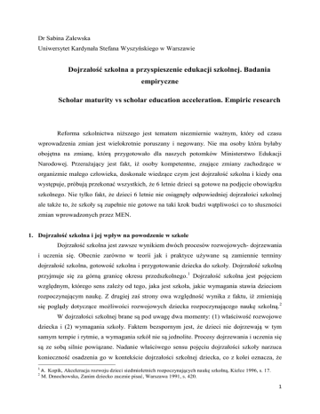 Dr Sabina Zalewska Uniwersytet Kardynała Stefana Wyszyńskiego w Warszawie Dojrzałość szkolna a przyspieszenie edukacji szkolnej. Badania empiryczne Scholar maturity vs scholar education acceleration. Empiric research Reforma szkolnictwa niższego jest tematem niezmiernie ważnym, który od czasu wprowadzenia zmian jest wielokrotnie poruszany i negowany. Nie ma osoby która byłaby obojętna na zmianę, którą przygotowało dla naszych potomków Ministerstwo Edukacji Narodowej. Przerażający jest fakt, iż osoby kompetentne, znające zmiany zachodzące w organizmie małego człowieka, doskonale wiedzące czym jest dojrzałość szkolna i kiedy ona występuje, próbują przekonać wszystkich, że 6 letnie dzieci są gotowe na podjęcie obowiązku szkolnego. Nie tylko fakt, że dzieci 6 letnie nie osiągnęły odpowiedniej dojrzałości szkolnej ale także to, że szkoły są zupełnie nie gotowe na taki krok budzi wątpliwości co to słuszności zmian wprowadzonych przez MEN. 1. Dojrzałość szkolna i jej wpływ na powodzenie w szkole Dojrzałość szkolna jest zawsze wynikiem dwóch procesów rozwojowych- dojrzewania i uczenia się. Obecnie zarówno w teorii jak i praktyce używane są zamiennie terminy dojrzałość szkolna, gotowość szkolna i przygotowanie dziecka do szkoły. Dojrzałość szkolną przyjmuje się za górną granicę okresu przedszkolnego.1 Dojrzałość szkolna jest pojęciem względnym, którego sens zależy od tego, jaka jest szkoła, jakie wymagania stawia dzieciom rozpoczynającym naukę. Z drugiej zaś strony owa względność wynika z faktu, iż zmieniają się poglądy dotyczące możliwości rozwojowych dziecka rozpoczynającego naukę szkolną.2 W dojrzałości szkolnej brane są pod uwagę dwa momenty: (1) właściwość rozwojowe dziecka i (2) wymagania szkoły. Faktem bezspornym jest, że dzieci nie dojrzewają w tym samym tempie i rytmie, a wymagania szkół nie są jednolite. Procesy dojrzewania i uczenia się są ze sobą silnie powiązane. Nadanie właściwego sensu pojęciu dojrzałości szkoły narzuca konieczność osadzenia go w kontekście dojrzałości szkolnej dziecka, co z kolei oznacza, że 1 2 A. Kopik, Akceleracja rozwoju dzieci siedmioletnich rozpoczynających naukę szkolną, Kielce 1996, s. 17. M. Dmochowska, Zanim dziecko zacznie pisać, Warszawa 1991, s. 420. 1 wymagania szkoły muszą odpowiadać na indywidualne i bardzo zróżnicowane potrzeby, możliwości oraz ograniczenia rozwojowe dziecka. Zatem gotowość dziecka do wejścia w rolę ucznia determinowana jest stopniem rozwoju jego kompetencji i funkcji, od dobrze opanowanych do dopiero dojrzewających. Wobec tego dziecko dojrzałe do szkoły to dziecko gotowe do przekroczenia własnych możliwości.”3 Stanowisko S. Szumana, który przez pojęcie dojrzałości szkolnej rozumiał: „osiągnięcie takiego poziomu rozwoju fizycznego, społecznego i psychicznego, który czyni je wrażliwymi i podatnymi na systematyczne nauczanie i wychowanie szkoły podstawowej”4 stało się niezwykle ważne dla rozwoju myśli o dojrzałości szkolnej dziecka. Szuman wrażliwością określił zainteresowanie ucznia nauką, natomiast podatność to umiejętność zrozumienia przez dziecko przekazywanych mu treści oraz chęć podporządkowania się wymaganiom szkoły i zgodne współdziałanie w grupie rówieśniczej.5 Przejście dziecka z jednego etapu edukacji do następnego jest procesem dynamicznym, złożonym i nie dokonuje się w sposób gwałtowny ani skokowy. Każdy kolejny etap uwarunkowany jest osiągnięciami nabytymi w okresie poprzednim poprzez zachodzące w nim zmiany rozwojowe, i to we wszystkich sferach osobowości dziecka. Zmiany te jednak nie zachodzą samorzutnie, lecz uwarunkowane są własną aktywnością dziecka, zróżnicowanymi warunkami jego życia i jakością edukacyjnych doświadczeń. Holistyczne podejście do problemu dojrzałości szkolnej , zarówno do jego rozumienia, jak i uwarunkowań, prezentuje A. Brzezińska która dokonując modyfikacji poglądów S. Szumana, wskazuje na trzy główne etapy w procesie kształtowania dojrzałości szkolnej. W pierwszym etapie podstawowe znaczenie mają początkowe uzdolnienia dziecka oraz oddziaływania środowiskowe i wychowawcze, które wpływają na kształtowanie się przedsiębiorczości i własnej aktywności dziecka w różnych dziedzinach. W kolejnym stadium wszystkie te czynniki oddziałują na rozwój fizyczny, umysłowy i społeczny dziecka. W ostatnim zaś etapie poziom rozwoju na tych trzech płaszczyznach wyznacza zakres wrażliwości i podatności dziecka na nauczanie typu szkolnego. Autorka zauważa, że takie szerokie rozumienie dojrzałości szkolnej , ujmowanej jako wrażliwość na naukę szkolną, obejmuje „pewien dostateczny stopień zainteresowania dziecka nauką i wiedzą w tym zakresie i w tej postaci , w jakiej się ją podaje w szkole”, natomiast podatność na nauczanie typu szkolnego 3 R. Michalak , E. Misiorna, Konteksty gotowości szkolnej (w:) Doradca nauczyciela sześciolatków. Materiały metodyczne dla nauczycieli, Warszawa 2006, s. 5. 4 S. Szuman, O dojrzałości szkolnej dzieci siedmioletnich, Nowa Szkoła 1962, nr 6, s. 24. 5 Por. M. Przetacznik-Gierowska, Makiełło-Jarża G. , Psychologia rozwojowa i wychowawcza wieku dziecięcego, Warszawa 1985, s. 365. 2 wiąże sie z „posiadaniem pewnej umiejętności podporządkowywania się wymaganiom szkoły w zakresie skupiania uwagi na zajęciach ,wykonywania powierzonych zadań oraz zgodnego i harmonijnego współżycia z kolegami. Materiał, jaki dziecko ma opanować u progu swej szkolnej edukacji, powinien być przystępny. tzn. dziecko powinno móc go zrozumieć, móc zapamiętać oraz móc go opanować umiejętnościowo”.6 Na dojrzałość szkolną mają wpływ pewne czynniki, do których należą m. in.: 7 1. Czynniki indywidualne- są to przekazane drogą genetyczną lub wrodzone właściwości organizmu. Należą tu rów
