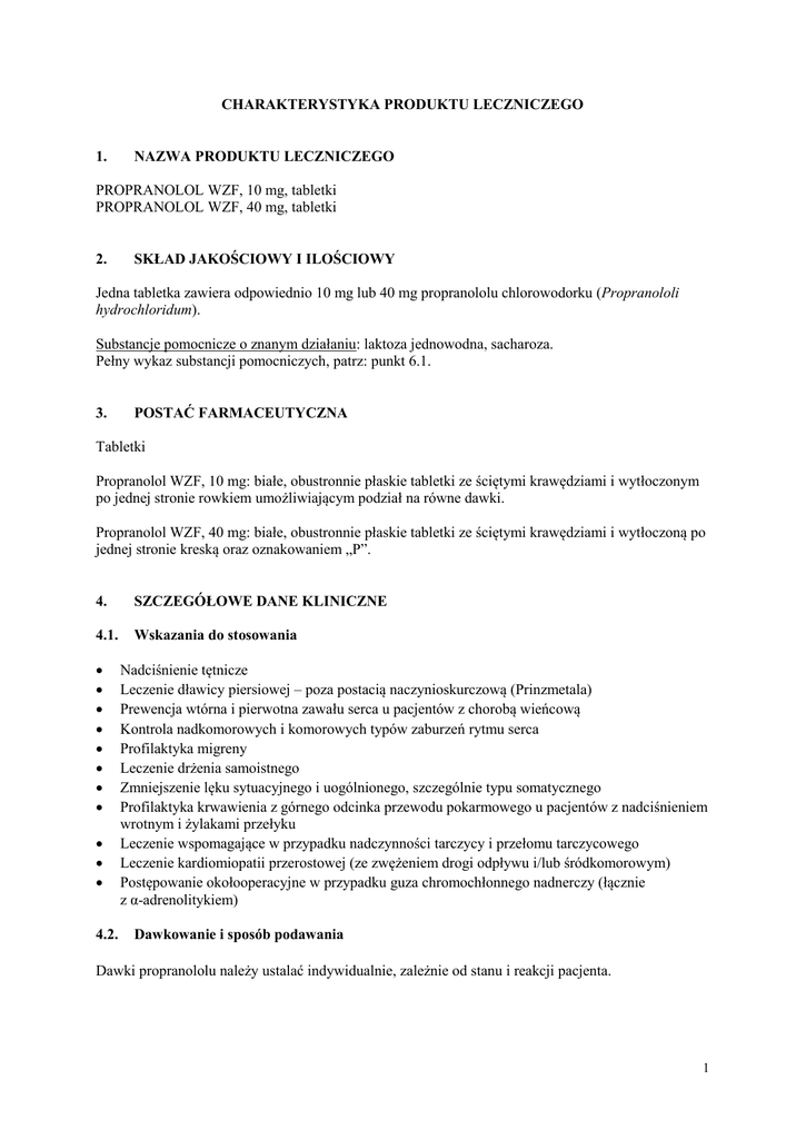CHARAKTERYSTYKA PRODUKTU LECZNICZEGO 1. NAZWA PRODUKTU LECZNICZEGO PROPRANOLOL WZF, 10 mg, tabletki PROPRANOLOL WZF, 40 mg, tabletki 2. SKŁAD JAKOŚCIOWY I ILOŚCIOWY Jedna tabletka zawiera odpowiednio 10 mg lub 40 mg propranololu chlorowodorku (Propranololi hydrochloridum). Substancje pomocnicze o znanym działaniu: laktoza jednowodna, sacharoza. Pełny wykaz substancji pomocniczych, patrz: punkt 6.1. 3. POSTAĆ FARMACEUTYCZNA Tabletki Propranolol WZF, 10 mg: białe, obustronnie płaskie tabletki ze ściętymi krawędziami i wytłoczonym po jednej stronie rowkiem umożliwiającym podział na równe dawki. Propranolol WZF, 40 mg: białe, obustronnie płaskie tabletki ze ściętymi krawędziami i wytłoczoną po jednej stronie kreską oraz oznakowaniem „P”. 4. SZCZEGÓŁOWE DANE KLINICZNE 4.1. Wskazania do stosowania 4.2. Nadciśnienie tętnicze Leczenie dławicy piersiowej – poza postacią naczynioskurczową (Prinzmetala) Prewencja wtórna i pierwotna zawału serca u pacjentów z chorobą wieńcową Kontrola nadkomorowych i komorowych typów zaburzeń rytmu serca Profilaktyka migreny Leczenie drżenia samoistnego Zmniejszenie lęku sytuacyjnego i uogólnionego, szczególnie typu somatycznego Profilaktyka krwawienia z górnego odcinka przewodu pokarmowego u pacjentów z nadciśnieniem wrotnym i żylakami przełyku Leczenie wspomagające w przypadku nadczynności tarczycy i przełomu tarczycowego Leczenie kardiomiopatii przerostowej (ze zwężeniem drogi odpływu i/lub śródkomorowym) Postępowanie okołooperacyjne w przypadku guza chromochłonnego nadnerczy (łącznie z α-adrenolitykiem) Dawkowanie i sposób podawania Dawki propranololu należy ustalać indywidualnie, zależnie od stanu i reakcji pacjenta. 1 DOROŚLI Nadciśnienie tętnicze Dawka początkowa wynosi 80 mg dwa razy na dobę i może być zwiększana w odstępach tygodniowych, w zależności od reakcji pacjenta na produkt. Zazwyczaj stosuje się od 160 mg do 320 mg na dobę. Jeżeli konieczne jest dalsze zmniejszenie ciśnienia tętniczego, należy zastosować dodatkowo lek moczopędny lub inny lek przeciwnadciśnieniowy. Leczenie dławicy piersiowej – poza postacią naczynioskurczową (Prinzmetala), profilaktyka migreny, leczenie drżenia samoistnego Dawka początkowa wynosi 40 mg dwa lub trzy razy na dobę i może być zwiększana o taką samą dawkę w odstępach tygodniowych, w zależności od reakcji pacjenta na produkt. Zazwyczaj stosuje się: - w migrenie i drżeniu samoistnym: od 80 mg do 160 mg na dobę; - w dławicy piersiowej: od 120 mg do 240 mg na dobę. Zmniejszenie lęku sytuacyjnego i uogólnionego, szczególnie typu somatycznego Ostry lęk sytuacyjny: 40 mg na dobę; Lęk uogólniony, wymagający przewlekłego leczenia: zazwyczaj 40 mg dwa razy na dobę. Dawkę można zwiększyć do 40 mg trzy razy na dobę. Leczenie powinno być kontynuowane w zależności od reakcji pacjenta na produkt. Po 6-12 miesiącach stosowania produktu należy przeprowadzić kontrolę stanu pacjenta. Kontrola nadkomorowych i komorowych zaburzeń rytmu serca, leczenie kardiomiopatii przerostowej (ze zwężeniem drogi odpływu i/lub śródkomorowym), leczenie wspomagające w przypadku nadczynności tarczycy i przełomu tarczycowego Od 10 mg do 40 mg trzy razy na dobę. Prewencja wtórna i pierwotna zawału serca u pacjentów z chorobą wieńcową Leczenie należy rozpocząć między 5. a 21. dniem od wystąpienia zawału serca. Dawka początkowa wynosi 40 mg cztery razy na dobę przez 2 do 3 dni. W celu zwiększenia prawdopodobieństwa, że pacjent będzie przyjmował produkt, całkowitą dawkę dobową można podzielić na dwa razy na dobę po 80 mg. Profilaktyka krwawienia z górnego odcinka przewodu pokarmowego u pacjentów z nadciśnieniem wrotnym i żylakami przełyku Dawkę należy ustalić tak, aby uzyskać obniżenie częstości rytmu serca o około 25%. Początkowo 40 mg dwa razy na dobę, następnie zwiększyć dawkę do 80 mg dwa razy na dobę, w zależności od uzyskanego zwolnienia częstości rytmu serca. Dawka maksymalna wynosi 160 mg dwa razy na dobę. Postępowanie okołooperacyjne w przypadku guza chromochłonnego nadnerczy (łącznie z α-adrenolitykiem) Propranolol stosować tylko łącznie z α-adrenolitykiem. - Przed zabiegiem chirurgicznym: 60 mg na dobę przez 3 dni. - Nieoperacyjne, złośliwe guzy: 30 mg na dobę. Pacjenci w podeszłym wieku Podczas podawania propranololu pacjentom w podeszłym wieku należy zachować ostrożność. Leczenie rozpoczynać od najmniejszej dawki; dawkę ustalać indywidualnie, w zależności od reakcji pacjenta na produkt. 2 DZIECI I MŁODZIEŻ Zaburzenia rytmu serca Dawkowanie należy określić indywidualnie dla każdego pacjenta, podane poniżej ma charakter orientacyjny: 0,25–0,5 mg/kg mc. 3-4 razy na dobę, w zależności od reakcji pacjenta na produkt. Maksymalnie 1 mg/kg mc. 4 razy na dobę; całkowita dawka dobowa nie może być większa niż 160 mg. 4.3. Przeciwwskazania Astma oskrzelowa i stany skurczowe oskrzeli W przypadku wystąpienia skurczu oskrzeli, można podać agonistę receptora β2, takiego jak salbutamol. W celu przeciwdziałania skurczowi oskrzeli wywołanemu przez propranolol, zazwyczaj podaje się duże dawki salbutamolu do momentu osiągnięcia poprawy stanu pacjenta. Należy rozważyć podanie dożylne lub inhalacje salbutamolu. Można również podać dożylnie aminofilinę albo ipratropium (za pomocą nebulizatora). Skuteczny jest również glukagon podany dożylnie w dawce 1 mg do 2 mg. W ciężkich przypadkach można podać tlen lub zastosować oddech wspomagany. Stwierdzona nadwrażliwość na propranolol lub inne składniki produktu Bradykardia Wstrząs kardiogenny Niekontrolowana niewydolność serca Niedociśnienie tętnicze Kwasica metaboliczna Długotrwałe głodzenie Ciężkie zaburzenia krążenia obwodowego Blok serca stopnia II lub III Dławica Prinzmetala Zespół chorego węzła zatokowego Nieleczony guz chromochłonny Produ