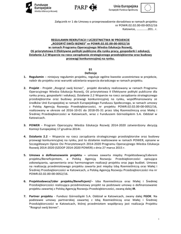 Załącznik nr 1 do Umowy o przeprowadzenie doradztwa w ramach projektu nr POWR.02.02.00-00-0052/16 Katowice, ……….....201.. r. REGULAMIN REKRUTACJI I UCZESTNICTWA W PROJEKCIE „ROZGRYŹ SWÓJ BIZNES” nr POWR.02.02.00-00-0052/16 w ramach Programu Operacyjnego Wiedza Edukacja Rozwój, Oś priorytetowa II Efektywne polityki publiczne dla rynku pracy, gospodarki i edukacji, Działanie 2.2 Wsparcie na rzecz zarządzania strategicznego przedsiębiorstw oraz budowy przewagi konkurencyjnej na rynku. §1 Definicje 1. Regulamin – niniejszy regulamin projektu, reguluje ogólne kwestie uczestnictwa w projekcie, nabór do projektu oraz warunki udzielania wsparcia doradczego w ramach projektu. 2. Projekt - Projekt „Rozgryź swój biznes”, projekt doradczy realizowany w ramach Programu Operacyjnego Wiedza Edukacja Rozwój, Oś priorytetowa II Efektywne polityki publiczne dla rynku pracy, gospodarki i edukacji, Działanie 2.2 Wsparcie na rzecz zarządzania strategicznego przedsiębiorstw oraz budowy przewagi konkurencyjnej na rynku, współfinansowany ze środków Unii Europejskiej w ramach Europejskiego Funduszu Społecznego, w ramach umowy z Polską Agencją Rozwoju Przedsiębiorczości, nr projektu POWR.02.02.00-00-0052/16, realizowany w okresie od 2016-10-01 do 2018-05-31 przez Izbę Rzemieślniczą oraz Małej i Średniej Przedsiębiorczości w Katowicach, wraz z Funduszem Górnośląskim S.A. Oddział w Katowicach. 3. POWER - Program Operacyjny Wiedza Edukacja Rozwój 2014-2020 zatwierdzony decyzją Komisji Europejskiej 17 grudnia 2014r. 4. Działanie 2.2 – Wsparcie na rzecz zarządzania strategicznego przedsiębiorstw oraz budowy przewagi konkurencyjnej na rynku, jest to działanie realizowane w ramach POWER, opisane w Szczegółowym Opisie Osi Priorytetowych 2014-2020 Programu Operacyjnego Wiedza Edukacja Rozwój 2014-2020 (SZOOP 2014-2020 POWER) z dnia 27 marca 2015 r. 5. Umowa o dofinansowanie projektu – umowa zawarta między Projektodawcą/Liderem projektu/Beneficjentem, a Polską Agencją Rozwoju Przedsiębiorczości opisująca zobowiązania, uprawnienia oraz harmonogram realizacji projektu oraz jego budżet. Umowa na realizację przedmiotowego projektu zawarta jest między Izbą Rzemieślniczą oraz Małej i Średniej Przedsiębiorczości w Katowicach, a Polską Agencją Rozwoju Przedsiębiorczości ma nr POWR.02.02.00-00-0052/16. 6. Projektodawca/Lider projektu/Beneficjent/– Izba Rzemieślnicza oraz Małej i Średniej Przedsiębiorczości realizująca przedmiotowy projekt na podstawie umowy o dofinansowanie projektu zawartej z Polską Agencją Rozwoju Przedsiębiorczości, zwaną dalej IR. 7. Partner projektu - Fundusz Górnośląski S.A. Oddział w Katowicach, zwany dalej FGOK. Na podstawie umowy partnerskiej zawartej z Izbą Rzemieślniczą oraz Małej i Średniej Przedsiębiorczości w Katowicach, której przedmiotem współpracy jest realizacja Projektu ”Rozgryź swój biznes”. 1 8. Biuro Projektu – miejsce realizacji projektu: Projektodawca/Lider projektu/Beneficjent/. 9. Katowice, Plac Wolności 12 - Personel projektu – osoby wyznaczone przez Projektodawcę/Lidera projektu/Beneficjenta oraz Partnera do realizacji działań projektowych i organizacji wsparcia projektowego. 10. Pracownik przedsiębiorstwa/uczestnik projektu – osoba zgodnie z art. 3 ust. 3 ustawy z dnia 9 listopada 2000 r. o utworzeniu Polskiej Agencji Rozwoju Przedsiębiorczości (Dz.U. 2000 Nr 109, poz. 1158) wykonująca pracę na rzecz mikro, małego przedsiębiorstwa, oddelegowana przez przedsiębiorstwo do udziału w przedmiotowym projekcie, która zaakceptowała warunki udziału w projekcie oraz aktywnie w nim uczestniczy. 11. Beneficjent Pomocy - przedsiębiorstwo uczestniczące w projekcie. 12. PARP – Polska Agencja Rozwoju Przedsiębiorczości, Instytucja Pośrednicząca. 13. Pomoc de minimis – pomoc udzielana Beneficjentowi na podstawie rozporządzenia 1407, zgodnie z Rozporządzeniem Ministra Infrastruktury i Rozwoju z dnia 9 listopada 2015 r. w sprawie udzielania przez Polską Agencję Rozwoju Przedsiębiorczości pomocy finansowej w ramach Programu Operacyjnego Wiedza Edukacja Rozwój 2014-2020 (Dz. U. poz. 2026). 14. MMŚP - sektor mikro, małych i średnich przedsiębiorstw, zgodnie z Art. 104, 105 i 106 ustawy z dnia 2 lipca 2004 r. o swobodzie działalności gospodarczej (Dz. U. z 2010 r., Nr 220, poz. 1447 ze zm.), spełniających kryteria określone w Załączniku I Rozporządzenia Komisji Europejskiej Nr 651/2014 z dnia 17 czerwca 2014 r. uznające niektóre rodzaje pomocy za zgodne ze wspólnym rynkiem w zastosowaniu art. 107 i 108 Traktatu, z wyłączeniem dużych przedsiębiorstw. Kwalifikacja przedsiębiorstwa jako mikro, małego lub średniego zależy od następujących zmiennych: a) liczba zatrudnionych osób, b) wielkość rocznego obrotu lub całkowitego rocznego bilansu, c) powiązań kapitałowych/niezależności. 15. Mikroprzedsiębiorstwo – przedsiębiorstwo zatrudniające do 9 pracowników, którego roczny obrót oraz/lub całkowity bilans roczny nie przekracza 2 milionów euro, przy czym średnioroczne zatrudnienie i roczny obrót oraz/lub bilans musi być wyliczony z uwzględnieniem powiązań kapitałowych/niezależności. Przedsiębiorstwo spełnia kryteria określone w kwalifikatorze dostępnym na stronie Polskiej Agencji Rozwoju Przedsiębiorczości: http://kwalifikator.een.org.pl/. 16. Małe przedsiębiorstwo - przedsiębiorstwo zatrudniające od 10 do 49 pracowników, którego roczny obrót oraz/lub całkowity bilans roczny nie przekracza 10 milionów euro, przy czym średnioroczne zatrudnienie i roczny obrót oraz/lub bilans musi być wyliczony z uwzględnieniem powiązań kapitałowych/niezależności. Przedsiębiorstwo spełnia kryteria określone w kwalifikatorze dostępnym na stronie Polskiej Agencji Rozwoju Przedsiębiorczości: http://kwalifikator.een.org.pl/. 17. Próg zatrudnienia – liczba „rocznych jednostek roboczych” (RJR) 