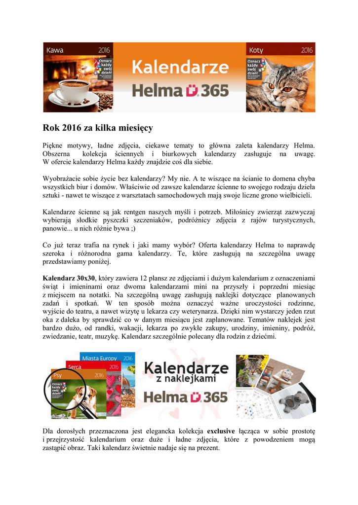 Rok 2016 za kilka miesięcy Piękne motywy, ładne zdjęcia, ciekawe tematy to główna zaleta kalendarzy Helma. Obszerna kolekcja ściennych i biurkowych kalendarzy zasługuje na uwagę. W ofercie kalendarzy Helma każdy znajdzie coś dla siebie. Wyobrażacie sobie życie bez kalendarzy? My nie. A te wiszące na ścianie to domena chyba wszystkich biur i domów. Właściwie od zawsze kalendarze ścienne to swojego rodzaju dzieła sztuki - nawet te wiszące z warsztatach samochodowych mają swoje liczne grono wielbicieli. Kalendarze ścienne są jak rentgen naszych myśli i potrzeb. Miłośnicy zwierząt zazwyczaj wybierają słodkie pyszczki szczeniaków, podróżnicy zdjęcia z rajów turystycznych, panowie... u nich różnie bywa ;) Co już teraz trafia na rynek i jaki mamy wybór? Oferta kalendarzy Helma to naprawdę szeroka i różnorodna gama kalendarzy. Te, które zasługują na szczególna uwagę przedstawiamy poniżej. Kalendarz 30x30, który zawiera 12 plansz ze zdjęciami i dużym kalendarium z oznaczeniami świąt i imieninami oraz dwoma kalendarzami mini na przyszły i poprzedni miesiąc z miejscem na notatki. Na szczególną uwagę zasługują naklejki dotyczące planowanych zadań i spotkań. W ten sposób można oznaczyć ważne uroczystości rodzinne, wyjście do teatru, a nawet wizytę u lekarza czy weterynarza. Dzięki nim wystarczy jeden rzut oka z daleka by sprawdzić co w danym miesiącu jest zaplanowane. Tematów naklejek jest bardzo dużo, od randki, wakacji, lekarza po zwykłe zakupy, urodziny, imieniny, podróż, zwiedzanie, teatr, muzykę. Kalendarz szczególnie polecany dla rodzin z dziećmi. Dla dorosłych przeznaczona jest elegancka kolekcja exclusive łącząca w sobie prostotę i przejrzystość kalendarium oraz duże i ładne zdjęcia, które z powodzeniem mogą zastąpić obraz. Taki kalendarz świetnie nadaje się na prezent. Specjalnie na zamówienie Sztuki Rodzinnej stworzona została kolekcja z polskimi zdjęciami gór, rzek, zamków oraz krajobrazów. Polska kolekcja kalendarzy obejmuje produkty o doskonałej zawartości oraz estetyce. Osobom którym nie odpowiada wieszanie kalendarza na ścianie z dużym obrazkiem proponujemy kalendarz trójdzielny Helma. Składa się on z 3 miesięcy umieszonych na jednej stronie oraz praktycznej główki dostępnej w 5 wzorach. Atutem kalendarza trójdzielnego Helmy jest możliwość przesuwania przejrzystej linijki wraz czerwonym znacznikiem wyróżniającym kolejne dni. Z boku umieszczona jest numeracja tygodni. Wszystkie oznaczenia dni są duże i widoczne z daleka. Innym ciekawym rozwiązaniem są podłużne kalendarze planery w układzie horyzontalnym. Zawierają przy każdym dniu dodatkowe miejsce, żeby wynotować wszystkie zaplanowane wcześniej spotkania, wizyty, wyjścia i wyjazdy. Kalendarze mini biurkowe świetnie sprawdzają się podczas pracy. Są niezwykle popularne ze względu na fakt, że pozwalają natychmiast zorientować się w wolnych terminach oraz szybko zapisać przyszłe. Są ozdobą na biurku. Na każdy miesiąc przeznaczona jest jedna z dwunastu kart z ładnym obrazkiem. Bardzo przydatny na biurku będzie również kalendarz notatnikowy. Wyposażony jest w kalendarium o układzie tygodniowym z numeracją godzinną danego dnia. Dzięki temu doskonale sprawdza się podczas dokładnego planowania wydarzeń co do godziny. W kalendarzu notatnikowym zaznaczone są zmiany czasowe z letniego na zimowy. W prawym dolnym rogu znajduje się mini kalendarz miesięczny z podkreślonym aktualnym tygodniem. Bardzo przydatny do pracy w biurze. Popularnością cieszą się również praktyczne kalendarze kieszonkowe Napoli i Torino z polskim kalendarium miesięcznym. W środku znajdują się 32 strony, które wprowadzają porządek i harmonię w życie codzienne. Ten rodzaj kalendarza zmieści się w każdej torebce i teczce. Jego wymiary to 7,7x17,8 cm. Dostawca kalendarzy: http://www.scanner.com.pl/papier/aktualnosci/580-przygotuj-sie-na-nowy-rok
