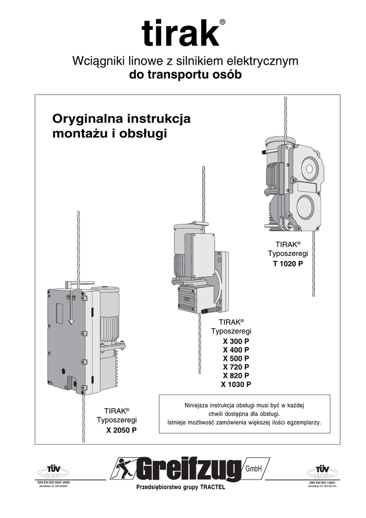 tirak ® Wciàgniki linowe z silnikiem elektrycznym do transportu osób Oryginalna instrukcja monta˝u i obs∏ugi TIRAK® Typoszeregi T 1020 P TIRAK® Typoszeregi X 300 P X 400 P X 500 P X 720 P X 820 P X 1030 P TIRAK® Typoszeregi X 2050 P Niniejsza instrukcja obs∏ugi musi byç w ka˝dej chwili dost´pna dla obs∏ugi. Istnieje mo˝liwoÊç zamówienia wi´kszej iloÊci egzemplarzy. GmbH DIN EN ISO 9001:2000 Zertifikat: 01 100 020037 DIN EN ISO 14001 Przedsi´biorstwo grupy TRACTEL Zertifikat: 01 104 021411 1 Spis treÊci Strona Strona Dane dotyczàce niniejszej instrukcji 2 Wskazówki dotyczàce producenta Êrodków do asekuracji osób na wysokoÊci 3 ObjaÊnienie u˝ytych symboli 3 1. Wskazówki dotyczàce bezpieczeƒstwa 4 2. Wykluczenie zastosowania niezgodnego z przeznaczeniem 5 3. Opis urzàdzeƒ 3.1 Przeznaczenie 3.2 Sposób pracy 3.3 Przepisowa lina TIRAK® 3.4 Emisja ha∏asu 3.5 Elementy konstrukcyjne i elementy obs∏ugi 3.6 Dane techniczne 3.6.1 Wciàgniki TIRAK® 3.6.2 BLOCSTOP®Urzàdzenia samozaciskowe 3.7 Typowe zastosowania 3.8 Urzàdzenia asekuracyjne 3.8.1 Hamulec roboczy 3.8.2 WY¸.AWAR. 3.8.3 Przekaênik kolejnoÊci faz 3.8.4 Ogranicznik si∏y podnoszenia 3.8.5 Tryb obs∏ugi r´cznej 3.8.6 Urzàdzenia asekuracyjne 3.8.7 Wy∏àcznik kraƒcowy PODNOSZENIE 3.9 Pozosta∏e ryzyka 5 5 5 5 6 7 7 8 9 9 9 9 10 10 11 11 4. Rozruch 4.1 Ogólne informacje 12 4.2 Wymagane wyposa˝enie 12 4.3 Mocowanie urzàdzeƒ TIRAK® 4.3.1 Ârodki do monta˝u i wymiary monta˝owe 12-13 14 4.3.2 Mocowanie wciàgnika TIRAK® 4.4 Monta˝ urzàdzeƒ samozaciskowych 4.4.1 Dowód udêwigu 15 4.4.2 Wymiary monta˝owe urzàdzeƒ BSA 15 4.4.3 Monta˝ urzàdzeƒ samozaciskowych 16 17 4.4.4 Pod∏àczanie do sterowania TIRAK® 4.4.5 Wymiary monta˝owe urzàdzeƒ BSO 18 4.5 Luêny koniec liny 4.5.1 Zwisajàce liny 18 4.5.2 Zastosowanie wciàgarki linowej 18 4.6 Zasilanie elektryczne 4.7 Sterowanie 4.7.1 Dzia∏anie/w∏àczanie urzàdzenia 4.7.2 Przyk∏ad centralnego sterowania 4.8 Instalacja liny 4.8.1 Przygotowanie liny 4.8.2 Instalacja liny noÊnej 4.8.3 Instalacja liny asekuracyjnej 5. Eksploatacja 5.1 Kontrola przed pierwszym uruchomieniem 5.2 Codzienne kontrole 5.3 Cotygodniowa kontrola lin i kabli 5.4 Tryb jazdy 5.4.1 Zatrzymanie / ZATRZYMANIE AWARYJNE 5.4.2 Normalny tryb jazdy 5.5 Tryb obs∏ugi r´cznej 5.5.1 Opuszczanie ewakuacyjne 5.5.2 Przejazd w gór´ 5.6 Zachowanie w razie zadzia∏ania urzàdzenia samozaciskowego 6. Usuwanie usterek 7. Wy∏àczenie 8. Utrzymanie stanu urzàdzenia 8.1 Piel´gnacja i konserwacja 8.1.1 Mechanizm linowy 8.1.2 Liny 8.1.3 Silnik, hamulec, przek∏adnia 8.1.4 Urzàdzenia samozaciskowe BLOCSTOP® 8.2 Kontrole 8.2.1 Bie˝àce kontrole 8.2.2 Kontrola bezpieczeƒstwa 8.3 Naprawa 2 wydanie: luty 2004 Prawa autorskie Prawo autorskie do niniejszej instrukcji monta˝u i obs∏ugi zachowuje producent. 2 20 20 20 21 22 22 23 24 24 25 25 25 26-28 28 29 29 29 29 30 31 31 9. Zamawianie cz´Êci zamiennych 9.1 9.2 9.3 9.4 Mechanizm linowy Silnik i hamulec Sterowanie elektryczne Urzàdzenia samozaciskowe BLOCSTOP® 9.5 Tabliczki znamionowe i ze wskazówkami Informacje dotyczàce monta˝u i instrukcji obs∏ugi Data wydania 19 Adres producenta: GREIFZUG Hebezeugbau GmbH Scheidtbachstraße 19-21 51469 Bergisch Gladbach Telefon: 0 22 02 / 10 04-0 Telefax: 0 22 02 / 10 04-50 lub -70 Email: [email protected] 32 32 32 32 32-33 Wskazówki dotyczàce producenta wiszàcych urzàdzeƒ do transportu osób Wa˝ne! Producent „podnoszonego urzàdzenia do transportu osób (PAM)” (pomost roboczy, kosz, siedzenie itp.), w którym jest wbudowany wciàgnik TIRAK® wraz z urzàdzeniem samozaciskowym BLOCSTOP ® , musi umieÊciç wszystkie niezb´dne do bezpiecznej eksploatacji wskazówki niniejszej obs∏ugi w odpowiednich miejscach instrukcji, którà stworzy on do konstruowanego przez siebie urzàdzenia! Zaw pom osty iesia i robo cze Oryg inaln ai mon nstrukcj ta a i obs ˝u ∏ugi Zwyczajne do∏àczenie niniejszej instrukcji nie wystarcza dla spe∏niania wymogów dyrektywy maszynowej UE oraz obowiàzujàcych z nià norm! U˝ytkownicy podnoszonych urzàdzeƒ do transportu osób produkcji GREIFZUG GmbH lub innej firmy grupy TRACTEL otrzymujà do danego urzàdzenia kompletne instrukcje obs∏ugi. GmbH ObjaÊnienie u˝ytych symboli Wskazówki dotyczàce bezpieczeƒstwa Symbol STOP S∏owo sygnalizacyjne Znaczenie Mo˝liwoÊç wystàpienia szkód w razie nieprzestrzegania NIEBEZPIECZE¡STWO POÂREDNIE ZAGRO˚ENIE lub mo˝liwie gro˝àce NIEBEZPIECZE¡STWO: Âmierç lub najci´˝sze obra˝enia! NIEBEZPIECZE¡STWO POÂREDNIE zagro˝enie lub mo˝liwie gro˝àce niebezpieczeƒstwo ze strony napi´cia elektrycznego: Âmierç lub najci´˝sze obra˝enia! OSTRO˚NIE Mo˝liwaniebezpieczna sytuacja: Lekkie obra˝enia lub szkody materialne. Inne wskazówki Nakazy Uwaga Mo˝liwa niebezpieczna sytuacja: Uszkodzenie urzàdzenia lub jego otoczenia Wa˝ne Praktyczne rady dotyczàce optymalnej pracy Brak (bez s∏owa sygnalizacyjnego) Wskazówka do pisemnej dokumentacji 3 1. Wskazówki dotyczàce bezpieczeƒstwa Unikaç obra˝eƒ, post´pujàc zgodnie ze wszelkimi instrukcjami. a) Urzàdzenia TIRAK® do transportu osób z urzàdzeniem samozaciskowym BLOCSTOP ® -sà przewidziane do zabudowy w „Podnoszony urzàdzeƒ do transportu osób (PAM)”. b) Urzàdzenia TIRAK® oraz elektryczne elementy dodatkowe z seryjnym wyposa˝eniem elektrycznym nie mogà byç u˝ywane w otoczeniu gro˝àcym wybuchem1). c) Monta˝em i konserwacjà wciàgników TIRAK® i urzàdzeƒ samozaciskowych® powinny zajmowaç si´ wy∏àcznie osoby, które otrzyma∏y takie zlecenie. Muszà one otrzymaç od przedsi´biorstwa polecenie monta˝u i konserwacji wciàgnika. d) Obs∏ugujàcy powinien byç przeszkolony w zakresie znajomoÊci aktualnych przepisów BHP, np. „Wciàgniki, urzàdzenia do podnoszenia i przeciàgania (VBG 8)”, „Urzàdzenia do podnoszenia ci´˝arów (VBG 9a)”, „Wymogi bezpieczeƒstwa dla wiszàcych