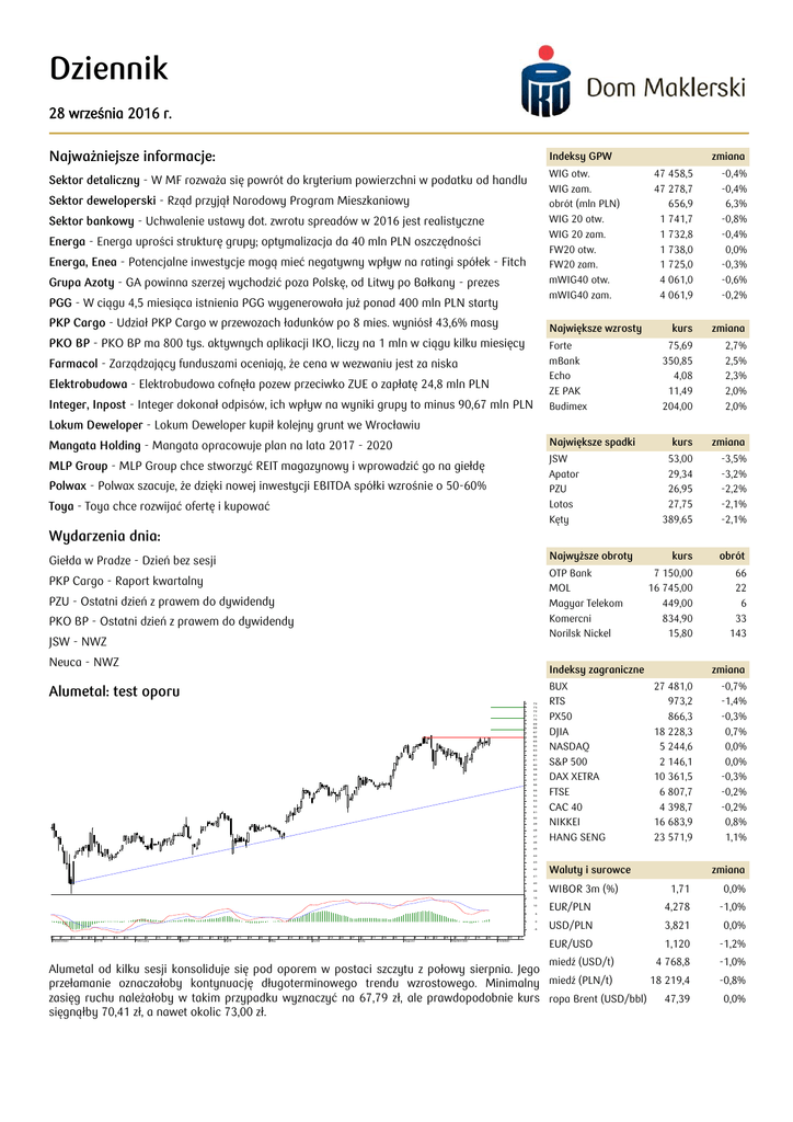Dziennik 28 września 2016 r. Najważniejsze informacje: Indeksy GPW WIG otw. WIG zam. obrót (mln PLN) WIG 20 otw. WIG 20 zam. FW20 otw. FW20 zam. mWIG40 otw. mWIG40 zam. Sektor detaliczny - W MF rozważa się powrót do kryterium powierzchni w podatku od handlu Sektor deweloperski - Rząd przyjął Narodowy Program Mieszkaniowy Sektor bankowy - Uchwalenie ustawy dot. zwrotu spreadów w 2016 jest realistyczne Energa - Energa uprości strukturę grupy; optymalizacja da 40 mln PLN oszczędności Energa, Enea - Potencjalne inwestycje mogą mieć negatywny wpływ na ratingi spółek - Fitch Grupa Azoty - GA powinna szerzej wychodzić poza Polskę, od Litwy po Bałkany - prezes PGG - W ciągu 4,5 miesiąca istnienia PGG wygenerowała już ponad 400 mln PLN starty PKP Cargo - Udział PKP Cargo w przewozach ładunków po 8 mies. wyniósł 43,6% masy Największe wzrosty PKO BP - PKO BP ma 800 tys. aktywnych aplikacji IKO, liczy na 1 mln w ciągu kilku miesięcy Forte mBank Echo ZE PAK Budimex Farmacol - Zarządzający funduszami oceniają, że cena w wezwaniu jest za niska Elektrobudowa - Elektrobudowa cofnęła pozew przeciwko ZUE o zapłatę 24,8 mln PLN Integer, Inpost - Integer dokonał odpisów, ich wpływ na wyniki grupy to minus 90,67 mln PLN zmiana 47 458,5 47 278,7 656,9 1 741,7 1 732,8 1 738,0 1 725,0 4 061,0 4 061,9 -0,4% -0,4% 6,3% -0,8% -0,4% 0,0% -0,3% -0,6% -0,2% kurs zmiana 75,69 350,85 4,08 11,49 204,00 2,7% 2,5% 2,3% 2,0% 2,0% Lokum Deweloper - Lokum Deweloper kupił kolejny grunt we Wrocławiu Największe spadki Mangata Holding - Mangata opracowuje plan na lata 2017 - 2020 JSW Apator PZU Lotos Kęty MLP Group - MLP Group chce stworzyć REIT magazynowy i wprowadzić go na giełdę Polwax - Polwax szacuje, że dzięki nowej inwestycji EBITDA spółki wzrośnie o 50-60% Toya - Toya chce rozwijać ofertę i kupować , kurs zmiana 53,00 29,34 26,95 27,75 389,65 -3,5% -3,2% -2,2% -2,1% -2,1% kurs obrót 7 150,00 16 745,00 449,00 834,90 15,80 66 22 6 33 143 Wydarzenia dnia: Najwyższe obroty Giełda w Pradze - Dzień bez sesji OTP Bank MOL Magyar Telekom Komercni Norilsk Nickel PKP Cargo - Raport kwartalny PZU - Ostatni dzień z prawem do dywidendy PKO BP - Ostatni dzień z prawem do dywidendy JSW - NWZ Neuca - NWZ Indeksy zagraniczne Alumetal: test oporu 74 73 72 71 70 69 68 67 66 65 64 63 62 61 60 59 58 57 56 55 54 53 52 51 50 49 48 47 46 BUX RTS PX50 DJIA NASDAQ S&P 500 DAX XETRA FTSE CAC 40 NIKKEI HANG SENG zmiana 27 481,0 973,2 866,3 18 228,3 5 244,6 2 146,1 10 361,5 6 807,7 4 398,7 16 683,9 23 571,9 -0,7% -1,4% -0,3% 0,7% 0,0% 0,0% -0,3% -0,2% -0,2% 0,8% 1,1% 45 44 43 42 41 40 39 Waluty i surowce WIBOR 3m (%) zmiana 1,71 0,0% EUR/PLN 4,278 -1,0% USD/PLN 3,821 0,0% EUR/USD 1,120 -1,2% 4 768,8 -1,0% 15 10 5 0 -5 30 7 Decem ber 14 21 28 4 11 2016 18 25 1 8 February 15 22 29 7 March 14 21 29 4 April 11 18 25 2 9 May 16 23 30 6 June 13 20 27 4 July 11 18 25 1 8 Augus t 16 22 29 5 12 Septem ber 19 26 3 10 October 17 miedź (USD/t) Alumetal od kilku sesji konsoliduje się pod oporem w postaci szczytu z połowy sierpnia. Jego 18 219,4 przełamanie oznaczałoby kontynuację długoterminowego trendu wzrostowego. Minimalny miedź (PLN/t) zasięg ruchu należałoby w takim przypadku wyznaczyć na 67,79 zł, ale prawdopodobnie kurs ropa Brent (USD/bbl) 47,39 sięgnąłby 70,41 zł, a nawet okolic 73,00 zł. -0,8% 0,0% Dziennik 28 września 2016 r. Najważniejsze informacje: Sektor detaliczny W MF rozważa się powrót do kryterium powierzchni w podatku od handlu Ministerstwo Finansów rozważa powrót do koncepcji powierzchni jako kryterium podatku od sprzedaży detalicznej po tym, jak Komisja Europejska zakwestionowała obecną ustawę. W MF rozważa się wprowadzenie podatku nawiązującego do rozwiązań francuskich. (PAP) Sektor deweloperski Rząd przyjął Narodowy Program Mieszkaniowy Rząd przyjął Narodowy Program Mieszkaniowy. Program będzie wdrażany od IV kwartału 2016 r. Celem programu jest zwiększenie dostępu do mieszkań dla osób o dochodach uniemożliwiających ich nabycie lub wynajęcie po cenach komercyjnych przez zwiększenie podaży mieszkań o niskim czynszu, obniżenie kosztów budowy mieszkań, w szczególności przez wykorzystanie gruntów publicznych pod budownictwo mieszkaniowe, zachęcanie do systematycznego oszczędzania na cele mieszkaniowe oraz ułatwienie podmiotom instytucjonalnym inwestowania na rynku mieszkań na wynajem. Ponadto, celem programu jest również m.in. zwiększenie liczby mieszkań przypadających na 1000 mieszkańców – do 2030 r. liczba mieszkań przypadająca na 1 tys. mieszkańców powinna osiągnąć średnią Unii Europejskiej, co oznacza wzrost z 363 do 435 mieszkań na 1000 osób. (PAP) Sektor bankowy Uchwalenie ustawy dot. zwrotu spreadów w 2016 jest realistyczne Kancelaria Prezydenta ocenia, że uchwalenie do końca 2016 roku przez Sejm ustawy dotyczącej zwrotu spreadów pozostaje terminem realistycznym. (PAP) Energa Energa uprości strukturę grupy; optymalizacja da 40 mln PLN oszczędności Energa uprości strukturę grupy i wzmocni nadzór właścicielski. Docelowo liczba firm zależnych spadnie do około 13 z 44 obecnie. Optymalizacja struktury ma przynieść 40 mln PLN oszczędności. Zmniejszenie liczby spółek ma nastąpić w ciągu trzech lat. W ramach nowej struktury spółki będą podlegać bezpośrednio Enerdze. Zamiast podziału na autonomicznie zarządzane segmenty powstaną linie biznesowe, koncentrujące się na swojej podstawowej działalności operacyjnej, czyli wytwarzaniu, OZE, dystrybucji i sprzedaży, inwestycjach i usługach wewnętrznych. (PAP) Energa, Enea Potencjalne inwestycje Energi i Enei mogą mieć negatywny wpływ na ich ratingi - Fitch Potencjalne inwestycje Energi i Enei mogą mieć negatywny wpływ na ratingi obu firm, o ile nie będą one powiązane z rynkiem mocy, czyli mechanizmem wsparcia dla inwestycji w wytwarzanie - uważają analitycy agencji Fitch. Obecne ratingi Energi i Enei to