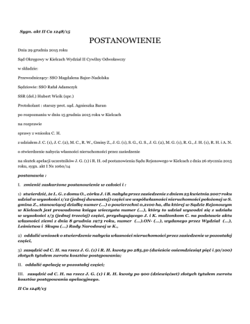Sygn. akt II Ca 1248/15 POSTANOWIENIE Dnia 29 grudnia 2015 roku Sąd Okręgowy w Kielcach Wydział II Cywilny Odwoławczy w składzie: Przewodniczący: SSO Magdalena Bajor-Nadolska Sędziowie: SSO Rafał Adamczyk SSR (del.) Hubert Wicik (spr.) Protokolant : starszy prot. sąd. Agnieszka Baran po rozpoznaniu w dniu 15 grudnia 2015 roku w Kielcach na rozprawie sprawy z wniosku C. H. z udziałem J. C. (1), J. C. (2), M. C., R. W., Gminy Z., J. G. (1), S. G., G. S., J. G. (2), M. G. (1), R. G., J. H. (1), R. H. i A. N. o stwierdzenie nabycia własności nieruchomości przez zasiedzenie na skutek apelacji uczestników J. G. (1) i R. H. od postanowienia Sądu Rejonowego w Kielcach z dnia 26 stycznia 2015 roku, sygn. akt I Ns 1060/14 postanawia : I. zmienić zaskarżone postanowienie w całości i : 1) stwierdzić, że L. G. z domu O., córka J. i B. nabyła przez zasiedzenie z dniem 25 kwietnia 2007 roku udział w wysokości 1/12 (jednej dwunastej) części we współwłasności nieruchomości położonej w S. gmina Z., stanowiącej działkę numer (...) o powierzchni 0,2100 ha, dla której w Sądzie Rejonowym w Kielcach jest prowadzona księga wieczysta numer (...), który to udział wywodzi się z udziału w wysokości 1/3 (jednej trzeciej) części, przysługującego J. i K. małżonkom C. na podstawie aktu własności ziemi z dnia 8 grudnia 1973 roku, numer (...).ON- (...), wydanego przez Wydział (...), Leśnictwa i Skupu (...) Rady Narodowej w K., 2) oddalić wniosek o stwierdzenie nabycia własności nieruchomości przez zasiedzenie w pozostałej części, 3) zasądzić od C. H. na rzecz J. G. (1) i R. H. kwoty po 285,50 (dwieście osiemdziesiąt pięć i 50/100) złotych tytułem zwrotu kosztów postępowania; II. oddalić apelację w pozostałej części; III. zasądzić od C. H. na rzecz J. G. (1) i R. H. kwoty po 900 (dziewięćset) złotych tytułem zwrotu kosztów postępowania apelacyjnego. II Ca 1248/15 UZASADNIENIE We wniosku z dnia 3 lipca 2013 C. H. wniosła o stwierdzenie, że je matka L. G. nabyła z dniem 24 kwietnia 2007 roku przez zasiedzenie udział K. i J. małżonków C. w wysokości 1/3 we współwłasności nieruchomości oznaczonej numerem (...) położonej w S., dla której prowadzona jest księga wieczysta numer (...). Powoływała się na posiadanie samoistne tej nieruchomości przez J. G. (3) od 24 kwietnia 1977 roku, a po jego śmierci przez L. G., która od śmierci męża użytkuje jego udział. Odwołała się do przebiegu postępowań w sprawie I C 574/12 Sądu Rejonowego w Kielcach, I Ns 488/10 Sądu Rejonowego w Kielcach i I Ns 555/06 Sądu Rejonowego w Kielcach. Uczestnicy J. G. (1) i R. H. wnieśli o oddalenie wniosku i zasądzenie od wnioskodawczyni kosztów postępowania. Nie kwestionując, że J. G. (3) był posiadaczem samoistnym tej nieruchomości w zakresie udziału wynoszącego 1/3 części, wskazywali, że po jego śmierci nikt z jego spadkobierców nie kontynuował tego posiadania, w szczególności nie władała tą działką L. G., co ich zdaniem potwierdził Sąd Okręgowy w Kielcach w sprawie II Ca 1233/12. Uczestnicy będący spadkobiercami J. i K. małżonków C. oponowali wnioskowi, wskazując, że J. G. (3) korzystał z nieruchomości na zasadzie użyczenia i miał ją dopiero kupić, powoływali się na zamiar kupna od nich udziałów w tej nieruchomości przez L. G., niektórzy kwestionowali, że umowie z dnia 24.04.1977 roku towarzyszyło przekazanie ich matce przez J. G. (3) uzgodnionej wówczas ceny sprzedaży. Postanowieniem z dnia 26 stycznia 2015 roku, wydanym w sprawie I Ns 1060/14, Sąd Rejonowy w Kielcach stwierdził, że L. G. nabyła przez zasiedzenie z dniem 24 kwietnia 2007 roku udział w wysokości 1/3 części w nieruchomości położonej w S., gmina Z. stanowiącej działkę numer (...) o powierzchni 0,2100 ha, dla której w Sądzie Rejonowym w Kielcach jest prowadzona księga wieczysta numer (...), który to udział stanowił własność J. i K. małżonków C., następnie nabyty w drodze spadkobrania przez R. W., J. C. (1), J. C. (2), M. C. i sprzedany umową z dnia 1 września 2010 roku rep. A 5843/2010 przed notariuszem M. K. dla J. G. (1) i R. H.. Sąd orzekł, że wnioskodawczyni i uczestnicy ponieśli koszty postępowania związane ze swym udziałem w sprawie. Sąd Rejonowy ustalił, że nieruchomość objęta wnioskiem w przeszłości stanowiła część gospodarstwa rolnego (...), a po śmierci T. C. gospodarstwo zostało podzielone na trójkę jego dzieci : J. C. (2), E. i J. małżonków C. i M. G. (2), po której udział objęła J. G. (1) z mężem M.. Odnoście nieruchomości zostały wydane trzy akty własności ziemi, w których stwierdzono, że współwłaścicielami działki (...) stali się po 1/3 części J. i K. małżonkowie C., J. G. (1) i J. H. (2). Obecnie dla nieruchomości prowadzona jest księga wieczysta (...), w której jako współwłaściciele wpisani są R. H. i J. G. (1). Po śmierci J. C. (2), w dniu 24 kwietnia 1977 roku jego żona K. zawarła z J. G. (3) pisemną umowę sprzedaży wynoszącego 1/3 część udziału we współwłasności tej nieruchomości, a świadkami tej umowy byli jej syn M. C. i mąż J. G. (1) M. G. (3). Pozostałą część nieruchomości małżonkowie C. już wcześniej przekazali na rzecz Skarbu Państwa w zamian za rentę i działkę (...) w dniu 13.01.1978 roku kupił J. G. (3). W dniu 21 listopada 1979 roku J. H. (2) przekazała należące do niej gospodarstwo wraz z udziałem w działce (...) synowi R. H.. K. C. zmarła a jej spadkobiercy swoje udziały w spadku po ojcu przekazali na rzecz R. H. i J. G. (1). W dniu 23 listopada 2000 roku zmarł J. G. (3), po którym została żona L. G. i dzieci C. H., G. S., R. G. i W. G., który zmarł pozostawiając dzieci M. G. (1) i S. G.. Na nieruchomości tej znajduje się budynek mieszkalny oraz budynki gospodarcze. Do budynku mieszkalnego prowadzą trzy odrębne wejścia, jego współwłaściciele dokonali podz