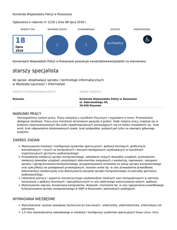 Komenda Wojewódzka Policji w Rzeszowie Ogłoszenie o naborze nr 1218 z dnia 08 lipca 2016 r. OFERTY DO WYMIAR ETATU STANOWISKA 1 1 18 lipca 2016 STATUS DODATKOWE archiwalny Komendant Wojewódzki Policji w Rzeszowie poszukuje kandydatów\kandydatek na stanowisko: starszy specjalista do spraw: eksploatacji sprzętu i technologii informatycznych w Wydziale Łączności i Informatyki MIEJSCE WYKONYWANIA PRACY: ADRES URZĘDU: Rzeszów Komenda Wojewódzka Policji w Rzeszowie ul. Dąbrowskiego 30, 35-036 Rzeszów WARUNKI PRACY Ośmiogodzinny system pracy. Praca związana z wysiłkiem fizycznym i wyjazdami w teren. Przewidziane delegacje służbowe. Praca przy monitorze ekranowym powyżej 4 godzin. Stałe miejsce pracy znajduje się w budynku nieprzystosowanym dla osób niepełnosprawnych poruszających się na wózku inwalidzkim np.: brak wind, brak odpowiednio dostosowanych toalet, brak podjazdów, podjazd jest tylko na zewnątrz głównego budynku. ZAKRES ZADAŃ Wykonywanie instalacji i konfiguracji systemów operacyjnych, aplikacji biurowych, graficznych, bazodanowych i innych na komputerach i stacjach dostępowych użytkowanych w komórkach organizacyjnych garnizonu podkarpackiego; Prowadzenie ewidencji sprzętu komputerowego, zakładanie nowych dowodów urządzeń, prowadzenie ewidencji dowodów urządzeń, pozostałych dokumentów związanych z ewidencją, naprawami, zakupami sprzętu i oprogramowania komputerowego, przygotowywanie wniosków na zakup sprzętu komputerowego oraz specyfikacji do postępowań przetargowych, wzorów umów itp. w celu prowadzenia prawidłowej dokumentacji ewidencyjnej oraz dokonywania zakupów sprzętu komputerowego na potrzeby garnizonu podkarpackiego; Udzielanie pomocy i wsparcia merytorycznego użytkownikom lokalnych sieci komputerowych w zakresie korzystania z aplikacji biurowych i specjalistycznych w celu właściwego wykorzystania w/wym. aplikacji; Wykonywanie napraw, konserwacji komputerów, drukarek, monitorów itp. w celu zapewnienia prawidłowego funkcjonowania sprzętu komputerowego w KWP w Rzeszowie i jednostkach podległych. WYMAGANIA NIEZBĘDNE Wykształcenie: wyższe zawodowe techniczne po kierunkach : elektronika, elektrotechnika, informatyka lub pokrewne 1,5 roku doświadczenia zawodowego w instalacji i konfiguracji systemów operacyjnych klasy Linux, Unix, Windows Znajomość języka angielskiego w stopniu komunikatywnym Znajomość budowy i funkcjonowania urządzeń komputerowych Znajomość instalacji i konfiguracji systemów operacyjnych klasy Linux, Unix, Windows Posiadanie obywatelstwa polskiego Korzystanie z pełni praw publicznych Nieskazanie prawomocnym wyrokiem za umyślne przestępstwo lub umyślne przestępstwo skarbowe WYMAGANIA DODATKOWE Wykształcenie: wyższe zawodowe magisterskie techniczne po kierunkach : elektronika, elektrotechnika, informatyka lub pokrewne Znajomość przepisów Ustawy o Zamówieniach Publicznych Znajomość zasad konfiguracji, eksploatacji urządzeń sieciowych Poświadczenie bezpieczeństwa o klauzuli poufne Świadectwo kwalifikacyjne upoważniające do eksploatacji i naprawy urządzeń do 1kV DOKUMENTY I OŚWIADCZENIA NIEZBĘDNE Życiorys/CV i list motywacyjny Kopie dokumentów potwierdzających spełnienie wymagania niezbędnego w zakresie wykształcenia Kopie dokumentów potwierdzających spełnienie wymagania niezbędnego w zakresie doświadczenia zawodowego/stażu pracy np. : kopie świadectw pracy, zaświadczenia o zatrudnieniu, referencje, kopie dokumentów o wykonaniu zlecenia/dzieła, potwierdzające długość i rodzaj doświadczenia Oświadczenie o posiadaniu obywatelstwa polskiego albo kopia dokumentu potwierdzającego posiadanie polskiego obywatelstwa Oświadczenie o wyrażeniu zgody na przetwarzanie danych osobowych do celów naboru Oświadczenie o korzystaniu z pełni praw publicznych Oświadczenie o nieskazaniu prawomocnym wyrokiem za umyślne przestępstwo lub umyślne przestępstwo skarbowe DOKUMENTY I OŚWIADCZENIA DODATKOWE kopia dokumentu potwierdzającego niepełnosprawność - w przypadku kandydatek/kandydatów, zamierzających skorzystać z pierwszeństwa w zatrudnieniu w przypadku, gdy znajdą się w gronie najlepszych kandydatek/kandydatów Kopie dokumentów potwierdzających spełnienie wymagania dodatkowego w zakresie wykształcenia Kopia poświadczenia bezpieczeństwa uprawniającego do dostępu do informacji niejawnych oznaczonych klauzulą poufne lub oświadczenie o wyrażeniu zgody na przeprowadzenie postępowania sprawdzającego Kopia dokumentu uprawniającego do eksploatacji i naprawy urządzeń do 1 kV TERMINY I MIEJSCE SKŁADANIA DOKUMENTÓW Dokumenty należy złożyć do: 18 lipca 2016 r. Decyduje data: stempla pocztowego / osobistego dostarczenia oferty do urzędu Miejsce składania dokumentów: Komenda Wojewódzka Policji ul. Dąbrowskiego 30 35-036 Rzeszów Wydział Kadr i Szkolenia budynek A, pokój 203 INNE INFORMACJE: W miesiącu poprzedzającym datę upublicznienia ogłoszenia wskaźnik zatrudnienia osób niepełnosprawnych w urzędzie, w rozumieniu przepisów o rehabilitacji zawodowej i społecznej oraz zatrudnianiu osób niepełnosprawnych, nie wynosi co najmniej 6%. Nasz urząd jest pracodawcą równych szans i wszystkie aplikacje są rozważane z równą uwagą bez względu na płeć, wiek, niepełnosprawność, rasę, narodowość, przekonania polityczne, przynależność związkową, pochodzenie etniczne, wyznanie, orientacje seksualną czy też jakąkolwiek inną cechę prawnie chronioną. Techniki i metody selekcji: - weryfikacja ofert pod kątem spełniania wymagań formalnych, - test wiedzy, - rozmowa kwalifikacyjna. W dokumentach aplikacyjnych należy podać numer ogłoszenia. List motywacyjny, oświadczenia należy opatrzyć datą i własnoręcznym podpisem. Każde oświadczenie powinno być zgodne z treścią ujętą w ogłoszeniu. Oferty niekompletne lub złożone po terminie wskazanym w ogłoszeniu nie będą rozpatrywane. Oferty odrzucone zosta