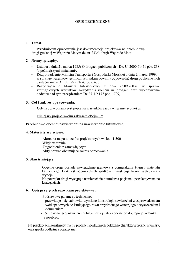 OPIS TECHNICZNY 1. Temat. Przedmiotem opracowania jest dokumentacja projektowa na przebudowę drogi gminnej w Wądrożu Małym dz. nr 233/1 obręb Wądroże Małe 2. Normy i przepisy. - Ustawa z dnia 21 marca 1985r O drogach publicznych - Dz. U. 2000 Nr 71 póz. 838 /z późniejszymi zmianami/, Rozporządzenie Ministra Transportu i Gospodarki Morskiej z dnia 2 marca 1999r w sprawie warunków technicznych, jakim powinny odpowiadać drogi publiczne i ich usytuowanie - Dz. U. 1999 Nr 43 póz. 430, Rozporządzenie Ministra Infrastruktury z dnia 23.09.2003r. w sprawie szczegółowych warunków zarządzania ruchem na drogach oraz wykonywania nadzoru nad tym zarządzaniem Dz. U. Nr 177 póz. 1729, 3. Cel i zakres opracowania. Celem opracowania jest poprawa warunków jazdy w tej miejscowości. Niniejszy projekt swoim zakresem obejmuje: Przebudowę obecnej nawierzchni na nawierzchnię bitumiczną 4. Materiały wyjściowe. Aktualna mapa do celów projektowych w skali 1:500 Wizja w terenie Uzgodnienia z zamawiającym Akty prawne obejmujące zakres opracowania 5. Stan istniejący. Obecnie droga posiada nawierzchnię gruntową z domieszkami żwiru i materiału kamiennego. Brak jest odpowiednich spadków i występują liczne zagłębienia i wyboje. Na początku drogi występuje nawierzchnia bitumiczna poękana i pozałamywana na krawędziach. 6. Opis przyjętych rozwiązań projektowych. Podstawowe parametry techniczne: - przewiduje się całkowitą wymianę konstrukcji nawierzchni z odprowadzeniem wód opadowych do istniejącego rowu przydrożnego wraz z jego oczyszczeniem i odmuleniem. - 15 mb istniejącej nawierzchni bitumicznej należy odciąć od dobrego jej odcinka i rozebrać. Na przekrojach konstrukcyjnych i profilach podłużnych pokazano charakterystyczne wymiary, oraz spadki podłużne i poprzeczne. 1 Parametry techniczne: Długość 260,00 mb Szerokość od 0+000 do 0+175 3,50m od 0+175 do 0+260 3,00 m Po obu stronach jezdni pobocza szerokości 50 cm utwardzone 10 cm warstwą mieszanki kamiennej 0/31,5mm co w przypadkach konieczności zjechania z jezdni będzie stanowiło azyl bezpieczeństwa . 7. Przekrój konstrukcyjny. Zaprojektowano następujące konstrukcje: Nawierzchnia jezdni i zjazdów 6 cm - warstwa ścieralna z betonu asfaltowego 0/11 mm 15 cm – górna warstwa podbudowy z mieszanki kamiennej 0/31,5 mm 20 cm – dolna warstwa podbudowy z mieszanki kamiennej 31/63 mm 10 cm – warstwa odsączająca z piasku Nawierzchnia poboczy 10 cm – mieszanka kamienna 0/31,5 mm 8. Odwodnienie Odwodnienie drogi powierzchniowe odpowiednimi spadkami podłużnymi i porzecznymi do projektowanego na odcinku od 0+070 do 0+123 po prawej stronie jezdni cieku z korytek betonowych 15*40*60 cm ułożonych na ławie gr.10 cm z betonu B10. Woda z korytek odprowadzana będzie do istniejącego rowu przydrożnego który wymaga odmulenia i wykoszenia traw na nim porośniętych. 9. Wytyczne do planu bezpieczeństwa i ochrony zdrowia. Wszelkie prace należy wykonywać zgodnie z wymogami technologicznymi, a także z obowiązującymi PN oraz zasadami i przepisami BHP. Zastosowano podział na następujące wytyczne: Zagospodarowanie placu budowy zabezpieczenie placu budowy przed niepożądanym wejściem lub przebywaniem osób postronnych poprzez ogrodzenie terenu budowy. Jeżeli ogrodzenie terenu budowy jest niemożliwe, należy oznakować granice terenu za pomocą tablic ostrzegawczych. Przygotowanie placu pod względem higieniczno - sanitarnym. Wyznaczenie bezpiecznych przejść dla ruchu pieszego. - Zapewnienie placu budowy w dostawy energii elektrycznej i wodę. - Wyznaczenie miejsca składowania materiałów i miejsc postoju sprzętu budowlanego. - Przygotowanie miejsc pracy zgodnie z obowiązującymi przepisami pod względem techniczno - ruchowym jak i bezpieczeństwa pracy. 2 Ochrona uczestników procesu budowlanego Określenie osoby odpowiedzialnej za przygotowanie i prowadzenie robót budowlanych. - Dopuszczenie do pracy osób z odpowiednim przygotowaniem zawodowym, posiadających aktualne kwalifikacje i uprawnienia oraz badania lekarskie i odpowiednio przeszkolonych z zakresie BHP. Zabezpieczenie miejsc niebezpiecznych - wykonanie i ustawienie odpowiednich barier czy osłon. Obsługa sprzętu, urządzeń, narzędzi - przestrzeganie wykonywania prac sprzętem i narzędziami zgodnie z ich przeznaczeniem i zgodnie z instrukcją obsługi. Materiały - stosowanie materiałów budowlanych posiadających aprobaty techniczne ITB, znak bezpieczeństwa i wymagane atesty. Roboty ziemne - odpowiednio zabezpieczenie wykopy. Układanie warstw podbudowy i nawierzchni - zabezpieczenie terenu robót oraz zachowanie ostrożności podczas pracy z użyciem sprzętu ciężkiego. 3