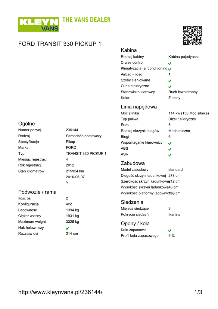 FORD TRANSIT 330 PICKUP 1 Kabina Rodzaj kabiny Kabina pojedyncza Cruise control Klimatyzacja (airconditioning) Airbag - ilość 1 Szyby cieniowane Okna elektryczne Stanowisko kierowcy Ruch lewostronny Kolor Zielony Linia napędowa Ogólne Moc silnika 114 kw (153 Moc silnika) Typ paliwa Dizel / elktryczny Euro 5 Numer pozycji 236144 Rodzaj skrzynki biegów Mechaniczna Rodzaj Samochód dostawczy Biegi 6 Specyfikacja Pikap Wspomaganie kierownicy Marka FORD ABS Typ TRANSIT 330 PICKUP 1 ASR Miesiąc rejestracji 4 Rok rejestracji 2012 Zabudowa Stan kilometrów 215924 km Model zabudowy 2016-05-07 Długość skrzyni ładunkowej 278 cm Y Szerokość skrzyni ładunkowej212 cm standard Wysokość skrzyni ładunkowej40 cm Podwozie / rama Wysokość platformy ładowniczej 100 cm Ilość osi 2 Konfiguracja 4x2 Siedzenia Ladownosc 1394 kg Miejsca siedzące 3 Ciężar własny 1931 kg Pokrycie siedzeń tkanina Maximum weight 3325 kg Opony / koła Hak holowniczy Rozstaw osi Koło zapasowe 314 cm http://www.kleynvans.pl/236144/ Profil koła zapasowego 9% 1/3 FORD TRANSIT 330 PICKUP 1 Ilość osi mm mm Hamulce tarczowe Rodzaj osi skrętnej Mechaniczne Wymiar opony 215/75R16,0 Oś skrętna Raport inspekcji Kody wyświetlacza Elektryczny Kolumna kierownicу Resory mm mm Hamulce tarczowe Typ zawieszenia Zawieszenie resorowe Wymiar opony 215/75R16,0 Rama Idealny/nowy Hamulce Bardzo dobry Silnik - całość Rozsądny Stan Układ chłodzenia Akceptowalny Układ paliwowy Nie spełnia wymagań Układ wydechowy Układ smarowania Skrzynka biegów Sprzęgło Napęd Opony http://www.kleynvans.pl/236144/ 2/3 FORD TRANSIT 330 PICKUP 1 http://www.kleynvans.pl/236144/ 3/3