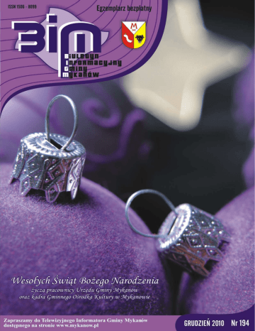 BI M GRUDZ I E Ń 2 0 10 Informacja Krzysztofa Smeli Wójta Gminy Mykanów W tym numerze: Informacja Krzysztofa Wójta Gminy Mykanów Smeli 3 Straż gminna w Mykanowie 4 Święta dawniej 5 Electronic Games Party 6 Przeciwdziałanie narkomanii 8 Chlebem trzeba się dzielić – rozmowa o pasji, macierzyństwie i magicznych składnikach 9 Podziękowania dla mieszkańców. Pragnę bardzo serdecznie podziękować mieszkańcom Naszej Gminy za udział w wyborach samorządowych, które odbyły się 21 listopada 2010 r. Decyzją Państwa zostałem wybrany na kolejną kadencje 2010-1014 Wójtem Gminy Mykanów. Ogromne - ponad 78% poparcie umacnia mnie w przekonaniu, że nie zmarnowaliśmy ostatnich lat i że znakomita większość mieszkańców chce kontynuacji dotychczasowych kierunków rozwoju. Z przedwyborczych rozmów wynika, że nadal priorytetami w Naszej Gminie będą oświata, drogownictwo, ochrona środowiska i szeroko pojmowane bezpieczeństwo publiczne. Pozostałe trudne zadania dotyczyć będą oświetlenia ulicznego, służby zdrowia i gospodarki wodnej. Cały czas trzeba umiejętnie korzystać ze środków pozabudżetowych w tym preferencyjnych kredytów i pożyczek. Budżetu gminy nie stać na realizację inwestycji ze środków własnych. Proszę nie wierzyć kłamliwym opowieściom o bankructwie gminy. Jest to prawnie niemożliwe, a naszą gospodarkę finansową kontroluje wiele instytucji i każdy kredyt czy pożyczka wymaga ich pozytywnej opinii. Będę korzystał ze wszystkich źródeł finansowania gminnych inwestycji, ale z pełnym bezpieczeństwem przy akceptacji Rady Gminy, służb finansowych i w zgodzie z obowiązującym prawem. Przykro mi, że w kampanii wyborczej kontrkandydat oprócz żałosnej i nachalnej propagandy nie zaprezentował żadnego merytorycznego programu, a skupił się na oszczerstwach i osobistych wycieczkach. No cóż, chyba tylko na tyle było go stać. Gratuluję Państwu wyboru radnych swoich miejscowości z wyrazem przekonania, że tak jak do tej pory, będziemy potrafili współpracować i rozwiązywać najbardziej palące zadania publiczne. Państwu Radnym gratuluję wyboru i zaufania jakie otrzymali od swoich mieszkańców. Rywalizacja była trudna, czasem decydowało kilka lub kilkanaście głosów. Tym bardziej musimy się wspólnie starać, aby udowodnić, że wybory były trafne. Jeszcze raz ogromnie dziękuję za okazane wsparcie. Wiem, że mogę liczyć na swoich mieszkańców, wiem, że na Wasze głosy trzeba sobie zasłużyć pracą, osobistym zaangażowaniem i wzajemną choć czasem trudną współpracą. Wierzę, że wspólnie damy radę. 3 Dzień Wolontariatu „Sowi Las” 10 12 Warsztaty dla nauczycieli przedszkoli 12 ,,Wichura” już działa! 13 „Magia i czary w naszym Przedszkolu”, „Urodziny Pluszowego Misia” - listopadowe Uroczystości w Przedszkolu w Starym Cykarzewie 14 Przedszkolaki w Borownie małymi ratownikami 15 Pasowanie pierwszoklasistów w SP w Borownie czyli odbicia linii papilarnych uczniów na herbie klasy 16 Wyprzedzić grypę 17 Komenda Miejska Policji w Częstochowie: Radzi – Ostrzega – Proponuje 17 Sport 18 BI M GRUDZ I E Ń 2 0 10 Straż Gminna w Mykanowie Podsumowanie i zestawienie wyników za okres: 01.01.2010 r. – 30.11.2010 r. Głównym zadaniem Straży Gminnej, zgodnie z ustawą o strażach gminnych (miejskich), jest ochrona spokoju i porządku w miejscach publicznych. Strażnicy zajmują się przede wszystkim ujawnianiem oraz podejmowanie czynności służbowych wobec sprawców wykroczeń najbardziej uciążliwych dla mieszkańców gminy Mykanów. Jednym z elementów systemu poprawy bezpieczeństwa jest kontro- la ruchu drogowego. Straże gminne są w tym zakresie ograniczone przepisami wynikającymi z Ustawy Prawo o Ruchu Drogowym. Ale przede wszystkim zajmujemy się sprawami mieszkańców, którzy zgłosili do nas prawie 500 interwencji. Strażnicy gminni ujęli m.in. na gorącym uczynku sprawców kradzieży blachy miedzianej z kościoła w Borownie, trzykrotnie ujęli sprawców kradzieży drewna oraz ujęli sprawców kradzieży krzewów z prywatnej posesji w Kuźnicy Kiedrzyńskiej. Strażnicy zatrzymali również wielu nietrzeźwych rowerzystów, regularnie patrolują gminę Mykanów w celu poprawy bezpieczeństwa. Podczas patrolu gminy zatrzymano kobietę spacerującą z rocznym dzieckiem, które nie było ubrane odpowiednio do panujących warunków atmosferycznych, zostało ono hospitalizowane. Strażnicy zajmują się także losem bezdomnych zwierząt. Komendant Straży Gminnej w Mykanowie Mgr Dariusz Rowicki ZESTAWIENIE WYNIKÓW STRAŻY GMINNEJ W MYKANOWIE za okres od 01.01.2010 r. do 30.11.2010 r. Lp 1 2 3 4 5 6 7 8 9 10 11 12 13 14 15 16 17 18 19 Stwierdzone wykroczenia nie zachowanie środków ostrożności przy utrzymaniu zwierząt (psy) zaśmiecanie, zanieczyszczanie miejsca publicznego używanie nieprzyzwoitych słów utrzymywanie czystości i porządku: spożywanie alkoholu w miejscu publicznym usiłowanie spożycia alkoholu w miejscu publicznym uchylanie się od obowiązku ochronnego szczepienia psów (brak szczepień) podawanie fałszywych danych osobowych umieszczanie nielegalnych ogłoszeń jazda rowerem bez oświetlenia inne wykroczenia w ruchu drogowym nieprzestrzeganie wymagań sanitarnych liczba wysłanych listów poleconych wnioski do sądu zgłoszenia interwencji: - przemoc w rodzinie - przekazanie policji ‒ nietrzeźwi rowerzyści ‒ nietrzeźwi kierowcy ‒ nietrzeźwi leżący ‒ kradzież drzewa (w miejscowościach: Tylin oraz Broniszew Stary) ‒ przekazanie sprawy do sądu rodzinnego (niezachowanie opieki nad dzieckiem) ‒ kradzież blachy z kościoła (w miejscowości Borowno) ‒ nieletni jadący motorowerem bez ubezpieczenia OC i dokumentów kontrole posesji kontrole dzikich wysypisk kontrole handlowe kontrole szkół oraz terenów przyszkolnych 4 Ilość 3 3 3 4 10 5 1 1 1 3 2 1 38015 691 459 31 33 24 3 1 2 1 1 1 100 18 8 61 BI M GRUDZ I E Ń 2 0 10 