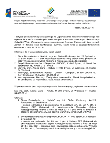 Projekt współfinansowany przez Unię Europejską z Europejskiego Funduszu Rozwoju Regionalnego w ramach Regionalnego Programu Operacyjnego Województwa Śląskiego na lata 2007 - 2013 Toszek, 06.11.2013r. - dotyczy postępowania przetargowego na „Sprawowanie nadzoru inwestorskiego nad wykonaniem robót budowlanych realizowanych w ramach projektu pn. Rewitalizacja Gotyckiej Wieży Zamkowej z przeznaczeniem na Centrum Ekspozycji Historycznych Zamek w Toszku oraz rewitalizacja budynku stajni wraz z zagospodarowaniem otoczenia” z dnia 19.08.2013r. Informuję, że w w/w postępowaniu wzięli udział: 1. Firma Budowlaniec – „Nadzór” mgr inż. Stefan Konieczny, 44-120 Pyskowice, ul. Braci Pisko 1/3 – brak możliwości ustalenia ceny oferty (cena podana za każdy miesiąc sprawowania nadzoru, a nie za całość przedsięwzięcia) 2. Zespół Rzeczoznawców i Ekspertów „BUDOX”, 41-902 Bytom, ul. Strzelców Bytomskich 18, kwota: 21.918,00 zł 3. Mgr inż. arch. Ariana Gano – Kotula, 41-908 Bytom, ul. Wiśniowa 41, kwota: 54.000,00 zł 4. Inwestycje, Budownictwo, Handel – „Inwest – Complex”, 44-100 Gliwice, ul. Góry Chełmskiej 15, kwota: 108.486,00 zł 5. Kosztorysowanie, Nadzory, Zastępstwa Inwestorskie, Marek Matysiakiewicz, 41-908 Bytom, ul. Reptowska 76/22, kwota: 79.950,00 zł W postępowaniu, jako najkorzystniejsza dla Zamawiającego, wybrana została oferta: Mgr inż. arch. Ariana Gano – Kotula, 41-908 Bytom, ul. Wiśniowa 41, kwota: 54.000,00 zł Oferta nr 1 Firma Budowlaniec – „Nadzór” mgr inż. Stefan Konieczny, 44-120 Pyskowice, ul. Braci Pisko 1/3 – została odrzucona z postępowania na podstawie Art. 89, ust 1, pkt. 6 Ustawy PZP (Załącznik do obwieszczenia Marszałka Sejmu Rzeczypospolitej Polskiej z dnia 28 maja 2013 r. poz. 907): w związku z błędnym obliczeniem ceny, nie spełniła warunków określonych w SIWZ, 2 Zespół Rzeczoznawców i Ekspertów „BUDOX”, 41-902 Bytom, ul. Strzelców Bytomskich 18 – została na podstawie: Art. 89, ust 1, pkt. 4 Ustawy PZP (Załącznik do obwieszczenia Marszałka Sejmu Rzeczypospolitej Polskiej z dnia 28 maja 2013 r. poz. 907) – oceniona, jako zawierająca rażąco niską cenę. W trybie Art. 90, ust. 1, Zamawiający zwrócił się do Wykonawcy o złożenie wyjaśnień. Oferent nie złożył wyjaśnień w wyznaczonym terminie; Zamawiający dokonał odrzucenia oferty w trybie Art. 90, ust. 3, Ustawy PZP (Załącznik do obwieszczenia Marszałka Sejmu Rzeczypospolitej Polskiej z dnia 28 maja 2013 r. poz. 907). Informuję, że umowa zostanie zawarta nie prędzej niż po upływie 5 dni od zawiadomienia oferentów o wyniku postępowania (po wyczerpaniu okresu ochrony prawnej i terminów przysługujących oferentom, biorącym udział w postępowaniu). Otrzymują: 1. Firma Budowlaniec – „Nadzór” mgr inż. Stefan Konieczny, 44-120 Pyskowice, ul. Braci Pisko 1/3 2. Zespół Rzeczoznawców i Ekspertów „BUDOX”, 41-902 Bytom, ul. Strzelców Bytomskich 3. Mgr inż. arch. Ariana Gano – Kotula, 41-908 Bytom, ul. Wiśniowa 41 4. Inwestycje, Budownictwo, Handel – „Inwest – Complex”, 44-100 Gliwice, ul. Góry Chełmskiej 15 5. Kosztorysowanie, Nadzory, Zastępstwa Inwestorskie, Marek Matysiakiewicz, 41-908 Bytom, ul. Reptowska 76/22 6. BIP Urzędu Miasta Toszek