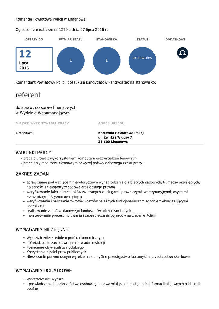 Komenda Powiatowa Policji w Limanowej Ogłoszenie o naborze nr 1279 z dnia 07 lipca 2016 r. OFERTY DO WYMIAR ETATU STANOWISKA 1 1 12 lipca 2016 STATUS DODATKOWE archiwalny Komendant Powiatowy Policji poszukuje kandydatów\kandydatek na stanowisko: referent do spraw: do spraw finansowych w Wydziale Wspomagającym MIEJSCE WYKONYWANIA PRACY: ADRES URZĘDU: Limanowa Komenda Powiatowa Policji ul. Żwirki i Wigury 7 34-600 Limanowa WARUNKI PRACY - praca biurowa z wykorzystaniem komputera oraz urządzeń biurowych; - praca przy monitorze ekranowym powyżej połowy dobowego czasu pracy. ZAKRES ZADAŃ sprawdzanie pod względem merytorycznym wynagrodzenia dla biegłych sądowych, tłumaczy przysięgłych, należności za ekspertyzy sądowe oraz obsługę prawną weryfikowanie faktur i rachunków związanych z usługami: prawniczymi, weterynaryjnymi, asystami komorniczymi, trybem awaryjnym weryfikowanie i naliczanie zwrotów kosztów należnych funkcjonariuszom zgodnie z obowiązującymi przepisami realizowanie zadań zakładowego funduszu świadczeń socjalnych monitorowanie procesu holowania i zabezpieczania pojazdów na zlecenie Policji WYMAGANIA NIEZBĘDNE Wykształcenie: średnie o profilu ekonomicznym doświadczenie zawodowe: praca w administracji Posiadanie obywatelstwa polskiego Korzystanie z pełni praw publicznych Nieskazanie prawomocnym wyrokiem za umyślne przestępstwo lub umyślne przestępstwo skarbowe WYMAGANIA DODATKOWE Wykształcenie: wyższe - poświadczenie bezpieczeństwa osobowego upoważniające do dostępu do informacji niejawnych o klauzuli poufne DOKUMENTY I OŚWIADCZENIA NIEZBĘDNE Życiorys/CV i list motywacyjny Kopie dokumentów potwierdzających spełnienie wymagania niezbędnego w zakresie wykształcenia Kopie dokumentów potwierdzających spełnienie wymagania niezbędnego w zakresie doświadczenia zawodowego / stażu pracy - oświadczenie o wyrażeniu zgody na przeprowadzenie postępowania sprawdzającego zgodnie z ustawą z dnia 5 sierpnia 2010 r. o ochronie informacji niejawnych (Dz. U. Nr 182, poz. 1228) lub kopia poświadczenia bezpieczeństwa uprawniającego do dostępu do informacji niejawnych Oświadczenie o posiadaniu obywatelstwa polskiego albo kopia dokumentu potwierdzającego posiadanie polskiego obywatelstwa Oświadczenie o wyrażeniu zgody na przetwarzanie danych osobowych do celów naboru Oświadczenie o korzystaniu z pełni praw publicznych Oświadczenie o nieskazaniu prawomocnym wyrokiem za umyślne przestępstwo lub umyślne przestępstwo skarbowe DOKUMENTY I OŚWIADCZENIA DODATKOWE Kopie dokumentów potwierdzających spełnienie wymagania dodatkowego w zakresie wykształcenia poświadczenie bezpieczeństwa osobowego upoważniające do dostępu do informacji niejawnych o klauzuli poufne TERMINY I MIEJSCE SKŁADANIA DOKUMENTÓW Dokumenty należy złożyć do: 12 lipca 2016 r. Decyduje data: stempla pocztowego / osobistego dostarczenia oferty do urzędu Miejsce składania dokumentów: Komenda Powiatowa Policji ul. Żwirki i Wigury 7 34-600 Limanowa INNE INFORMACJE: W miesiącu poprzedzającym datę upublicznienia ogłoszenia wskaźnik zatrudnienia osób niepełnosprawnych w urzędzie, w rozumieniu przepisów o rehabilitacji zawodowej i społecznej oraz zatrudnianiu osób niepełnosprawnych, wynosi co najmniej 6%. Oferty, które nie spełnią wymogów formalnych, niekompletne oraz przesłane po terminie /decyduje data stempla pocztowego/ nie będą brane pod uwagę. Oświadczenia muszą być podpisane własnoręcznie. Nie zwracamy nadesłanych dokumentów. Oferty należy składać w kopertach z dopiskiem „Nabór na stanowisko referent ds. finansowych”. Do składania dokumentów zachęcamy także osoby niepełnosprawne. Kandydaci zakwalifikowani zostaną powiadomieni o terminie testu i rozmowy kwalifikacyjnej. Zatrudnienie w Komendzie Powiatowej Policji w Limanowej osoby wyłonionej w wyniku naboru może nastąpić po przeprowadzeniu przez Pełnomocnika ds. Ochrony Informacji Niejawnych Komendanta Powiatowego Policji w Limanowej postępowania sprawdzającego i wydaniu poświadczenia bezpieczeństwa. Dodatkowe informacje: (018) 337-94-20 Legenda Pierwszeństwo dla osób z niepełnosprawnościami Ogłoszenie z tym symbolem oznacza, że pierwszeństwo w zatrudnieniu mają osoby z niepełnosprawnościami, które spełniają wszystkie następujące warunki: • złożyły w terminie ofertę wraz z dokumentem potwierdzającym niepełnosprawność, • spełniają warunki wymienione w ogłoszeniu, • po rekrutacji znalazły się w gronie najlepszych kandydatów. Zastępstwo Ogłoszenie z tym symbolem oznacza, że urząd poszukuje kandydatów do pracy na czas przewidywanej nieobecności swojego pracownika. Jeśli w ogłoszeniu nie wskazano okresu zastępstwa, możesz o to spytać w urzędzie. Osoba zatrudniona na zastępstwo jest członkiem korpusu służby cywilnej. Nabór otwarty dla cudzoziemców Ogłoszenie z tym symbolem oznacza, że o stanowisko mogą starać się, poza polskimi obywatelami, również cudzoziemcy. Kandydaci muszą spełniać następujące warunki: • są obywatelami państwa Unii Europejskiej lub innego państwa, którego obywatelom na podstawie umów międzynarodowych lub przepisów prawa wspólnotowego przysługuje prawo podjęcia zatrudnienia na terytorium Polski, • ich znajomość języka polskiego jest potwierdzona jednym z dokumentów wskazanych w rozporządzeniu w sprawie rodzajów dokumentów potwierdzających znajomość języka polskiego przez osoby nieposiadające obywatelstwa polskiego, ubiegające się o zatrudnienie w służbie cywilnej.
