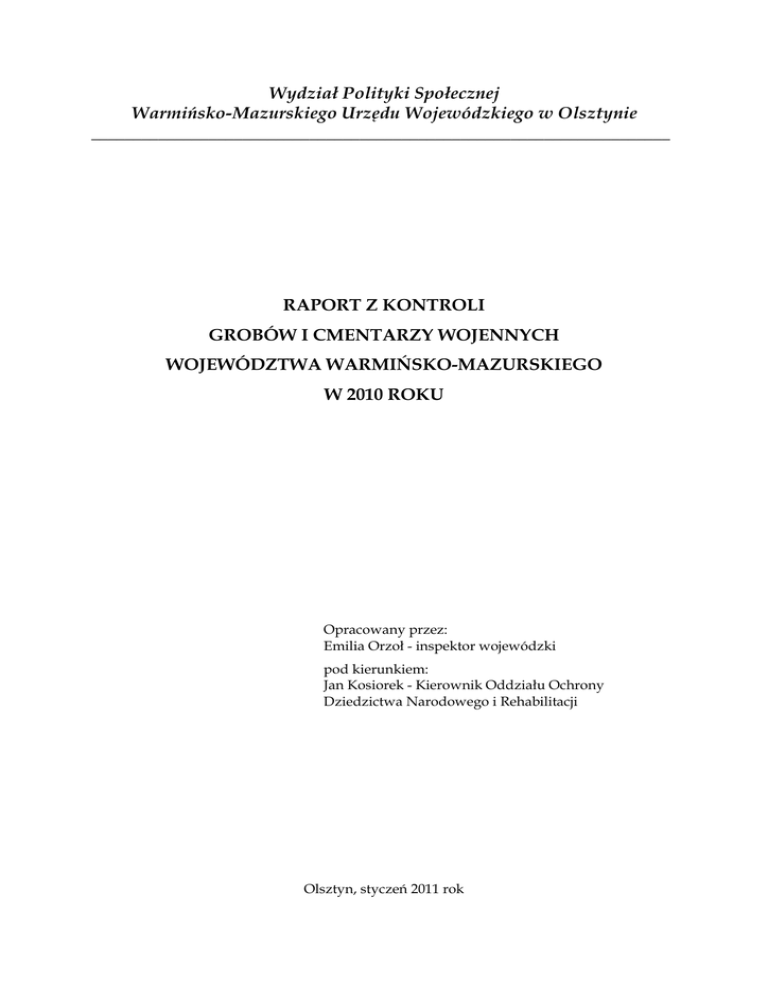 Wydział Polityki Społecznej Warmińsko-Mazurskiego Urzędu Wojewódzkiego w Olsztynie _____________________________________________________________________ RAPORT Z KONTROLI GROBÓW I CMENTARZY WOJENNYCH WOJEWÓDZTWA WARMIŃSKO-MAZURSKIEGO W 2010 ROKU Opracowany przez: Emilia Orzoł - inspektor wojewódzki pod kierunkiem: Jan Kosiorek - Kierownik Oddziału Ochrony Dziedzictwa Narodowego i Rehabilitacji Olsztyn, styczeń 2011 rok Raport z kontroli grobów i cmentarzy wojennych woj. warmińsko-mazurskiego 1. PRZEPISY PRAWNE Zagadnienia związane z ochroną ofiar wojny poruszają cztery Konwencje podpisane w Genewie 12 sierpnia 1949 r., które Polska ratyfikowała pięć lat później. Określają one zalecany sposób postępowania państw wobec Ŝołnierzy, jeńców wojennych i osób cywilnych podczas konfliktów zbrojnych, jak równieŜ regulują sprawy związane z ochroną miejsc spoczynku ofiar wojny. Dodatkowo Rzeczpospolita Polska zawarła z państwami ościennymi umowy i traktaty dwustronne, regulujące wzajemne obowiązki sygnatariuszy w opiece nad mogiłami i cmentarzami wojennymi znajdującymi się na terenie układających się stron (Białoruś, Litwa, Niemcy, Rosja, Ukraina). Umowy tego rodzaju Polska zawarła takŜe z innymi krajami (Kirgistan, Uzbekistan). Natomiast podstawowym polskim aktem regulującym kwestie cmentarzy wojennych jest ustawa z dnia 28 marca 1933 r. o grobach i cmentarzach wojennych (Dz. U. Nr 39, poz. 311 z późn. zm.). Zgodnie z jej zapisami do zadań wojewody naleŜy: − zarządzenie ekshumacji zwłok z grobu wojennego i przeniesienie ich do innego grobu; wskutek umotywowanej prośby rodziny lub otoczenia osoby pochowanej w grobie wojennym, bądź prośby instytucji społecznej, wydawanie zezwolenia na ekshumację zwłok z grobu wojennego, przeniesienie ich na inne miejsce w kraju lub poza granicami Państwa i na sprowadzenie zwłok z obcego państwa celem pochowania w kraju w grobie wojennym (art. 4), − wydawanie zezwolenia na przeprowadzanie robót ziemnych, wznoszenie pomników i innych urządzeń na cmentarzach i grobach wojennych (art. 5), − powierzenie jednostce samorządu terytorialnego, w drodze porozumienia, obowiązku utrzymania grobów i cmentarzy wojennych, z jednoczesnym przekazaniem odpowiednich funduszy, jeŜeli jednostka samorządu terytorialnego nie przejmie tego obowiązku bezpłatnie (art. 6 ust. 3). Sprawy dotyczące opieki nad grobami wojennymi reguluje ponadto rozporządzenie Ministra Spraw Wewnętrznych z dnia 23 października 1936 r. wydane w porozumieniu z Ministrami Spraw Wojskowych i Opieki Społecznej w sprawie wykonania ustawy z dnia 28 marca 1933 r. o grobach i cmentarzach wojennych (Dz. U. Nr 85, poz. 595). 2 Raport z kontroli grobów i cmentarzy wojennych woj. warmińsko-mazurskiego Zgodnie z § 2 rozporządzenia do zakresu działania wojewody naleŜą sprawy dotyczące: − ekshumacji i przeniesienia zwłok z cmentarza lub grobu wojennego na inny cmentarz lub do innego grobu wojennego, − udzielania pozwoleń na remont lub budowę grobowców, na wznoszenie pomników, na wykonywanie robót ziemnych i innych urządzeń na cmentarzach wojennych oraz zatwierdzania projektów budowy pomników i projektów innych urządzeń, − ogólnego zarządu cmentarzy wojennych, a w szczególności sprawy związane z ewidencją, remontem i utrzymaniem grobów i cmentarzy wojennych oraz sprawy związane z uregulowaniem własności gruntów, zajętych pod cmentarze wojenne. Obowiązki wynikające z powyŜszych aktów prawnych ciąŜą równieŜ na gminach, do których naleŜy bezpośredni dozór nad stanem grobów i cmentarzy wojennych (art. 7 ustawy, § 4 ust. 1 rozporządzenia) oraz zawiadamianie wojewody w razie uszkodzenia grobu lub jakichkolwiek urządzeń na cmentarzu (§ 4 ust. 2 rozporządzenia). 2. ORGANIZOWANIE OPIEKI NAD GROBAMI I CMENTARZAMI WOJENNYMI NA TERENIE WOJEWÓDZTWA WARMIŃSKO-MAZURSKIEGO Według posiadanej ewidencji mogił, kwater i cmentarzy wojennych, opracowanej na podstawie danych przekazanych przez poszczególne gminy, na obszarze województwa warmińsko-mazurskiego znajduje się ponad 300 obiektów cmentarnictwa wojennego. Największy cmentarz z I wojny światowej na terenie województwa znajduje się w Markajmach (gm. Lidzbark Warmiński). Zajmuje on powierzchnię 1,08 ha. Spoczywa na nim 2.761 Ŝołnierzy kilku narodowości: 2.081 - armii rosyjskiej, 506 - rumuńskiej, 53 francuskiej, 49 - angielskiej, 45 - belgijskiej, 19 - włoskiej, 8 - serbskiej. Największe cmentarze pochodzące z okresu II wojny światowej, to: - cmentarz śołnierzy Armii Radzieckiej w Braniewie - pow. 6,5 ha, liczba pochowanych Ŝołnierzy - 31.237, - cmentarz śołnierzy Armii Radzieckiej w Olsztynie - pow. 1,4 ha, liczba Ŝołnierzy pochowanych ogółem: 5.222 (4.262 armii radzieckiej, 290 - Ŝoł. WP, 670 - lotnicy Wolnej Francji), - cmentarz śołnierzy Armii Radzieckiej w Elblągu – 1,4 ha, liczba pochowanych Ŝołnierzy - 2731, - cmentarz śołnierzy Armii Radzieckiej w Lidzbarku Warmińskim – pow. 0,669 ha, liczba pochowanych Ŝołnierzy - 1.972. 3 Raport z kontroli grobów i cmentarzy wojennych woj. warmińsko-mazurskiego Zgodnie z art. 6 ustawy o grobach i cmentarzach wojennych z 28 marca 1933 r., groby i cmentarze wojenne pozostają pod opieką Państwa, a koszty ich utrzymania ponosi Skarb Państwa. Obowiązek ich utrzymania wojewoda moŜe powierzyć gminie za przekazaniem odpowiednich funduszy, o ile nie przyjmie ona tego obowiązku bezpłatnie. Dotacja na utrzymanie grobów i cmentarzy wojennych zaplanowana w ustawie budŜetowej na rok 2010 w rozdziale 71035 § 2020 „Cmentarze” wynosiła 221.000 zł. Z tej ogólnej kwoty, Wojewoda Warmińsko-Mazurski przeznaczył 199.900 zł na bieŜące utrzymanie grobów i cmentarzy wojennych. Realizacja tego obowiązku wraz ze środkami finansowymi na ten cel, została powierzona na mocy porozumienia 54 gminom, zainteresowanym przejęciem zadania. Jedną z najwyŜszych kw