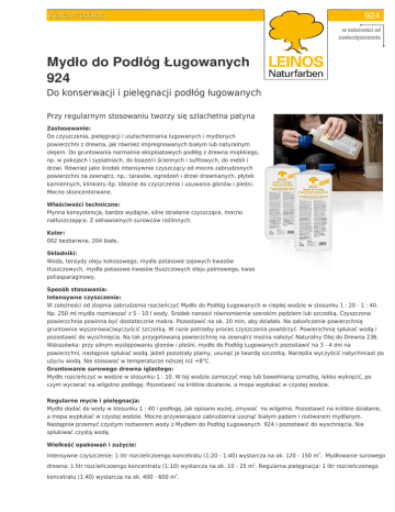924 Mydło do Podłóg Ługowanych 924 Do konserwacji i pielęgnacji podłóg ługowanych Przy regularnym stosowaniu tworzy się szlachetna patyna Zastosowanie: Do czyszczenia, pielęgnacji i uszlachetniania ługowanych i mydlonych powierzchni z drewna, jak również impregnowanych białym lub naturalnym olejem. Do gruntowania normalnie eksploatowych podłóg z drewna miękkiego, np. w pokojach i sypialniach, do boazerii ściennych i sufitowych, do mebli i drzwi. Również jako środek intensywnie czyszczący od mocno zabrudzonych powierzchni na zewnątrz, np.: tarasów, ogrodzeń i drzwi drewnianych, płytek kamiennych, klinkieru itp. Idealne do czyszczenia i usuwania glonów i pleśni. Mocno skoncentorwane. Właściwości techniczne: Płynna konsystencja, bardzo wydajne, silne działanie czyszczące, mocno natłuszczające. Z odnawialnych surowców roślinnych. Kolor: 002 bezbarwne, 204 białe, Składniki: Woda, tensydy oleju kokosowego, mydła potasowe sojowych kwasów tłuszczowych, mydła potasowe kwasów tłuszczowych oleju palmowego, kwas poliasparaginowy. Sposó b stosowania: Intensywne czyszczenie: W zależności od stopnia zabrudzenia rozcieńczyć Mydło do Podłóg Ługowanych w ciepłej wodzie w stosunku 1 : 20 - 1 : 40. Np. 250 ml mydła rozmieszać z 5 - 10 l wody. Środek nanosić równomiernie szerokim pędzlem lub szczotką. Czyszczona powierzchnia powinna być dostatecznie mokra. Pozostawić na ok. 20 min, aby działało. Na zakończenie powierzchnię gruntownie wyszorować/wyczyścić szczotką. W razie potrzeby proces czyszczenia powtórzyć. Powierzchnię spłukać wodą i pozostawić do wyschnięcia. Na tak przygotowaną powierzchnię na zewnątrz można nałożyć Naturalny Olej do Drewna 236. Wskazówka: przy silnym występowaniu glonów i pleśni, mydło do Podłóg Ługowanych pozostawić na 3 - 4 dni na powierzchni, następnie spłukać wodą. Jeżeli pozostały plamy, usunąć je twardą szczotką. Narzędia wyczyścić natychmiast po użyciu wodą. Nie stosować w temperaturze niższej niż +8°C. Gruntowanie surowego drewna iglastego: Mydło rozcieńczyć w wodzie w stosunku 1 : 10. W tej wodzie zamoczyć mop lub bawełnianą szmatkę, lekko wykręcić, po czym wycierać na wilgotno podłogę. Pozostawić na krótkie działanie, a mopa wypłukać w czystej wodzie. Regularne mycie i pielęgnacja: Mydło dodać do wody w stosunku 1 : 40 i podłogę, jak opisano wyżej, zmywać na wilgotno. Pozostawić na krótkie działanie, a mopa wypłukać w czystej wodzie. Mocno przywierające zabrudzenia usunąć białym padem i roztworem mydlanym. Następnie przemyć czystym roztworem wody z Mydłem do Podłóg Ługowanych 924 i pozostawić do wyschnięcia. Nie spłukiwać czystą wodą. Wielkość opakowań i zużycie: Intensywne czyszczenie: 1 litr rozcieńczoengo koncetratu (1:20 - 1:40) wystarcza na ok. 120 - 150 m2. Mydłowanie surowego drewna: 1 litr rozcieńczoengo koncentratu (1:10) wystarcza na ok. 10 - 25 m2. Regularna pielęgnacja: 1 litr rozcieńczonego koncetratu (1:40) wystarcza na ok. 400 - 600 m2. Opakowanie wystarcza na...* 1l 2,5l w zależności od zanieczyszczenia * średnia wydajność na jedną warstwę Przechowywanie i trwałość: Przechowywać w chłodnym i suchym miejscu, chronić przed mrozem. Napoczęte opakowania szczelnie zamykać. Utylizacja: Zgodnie z lokalnymi, urzędowymi przepisami. Wysuszone resztki produktu mogą być usuwane do odpadów komunalnych. Europejski kod odpaduEWC: 07 06 01. GISCODE: GE 10 Zwroty wskazujące środki ostrożności: Karta charakterystyki dostępna na życzenie. Chronić przed dziećmi. Unikać uwolnienia do środowiska. Zawartość/pojemnik usuwać zgodnie z lokalnymi przepisami. Biodegradowalne środki powierzchniowo czynne zgodnie z rozp. nr 648/2004 Parlamentu Europejskiego i Rady w sprawie detergentów. Aby osiągnąć optymalne wyniki należy przestrzegać zaleceń Kart Produktów wszystkich stosowanych produktów. Informacje opierają się na aktualnym stanie naszej wiedzy i doświadczeń. Nie stanowią jednak zapewnienia o właściwościach produktu i nie mają skutku prawnego umowy. Wraz z ukazaniem się tej Karty Produktu wszystkie poprzednie informacje tracą swoją ważność. Stan: 03.03.2017 Dystrybutor: AMBIENTE • Tomasz Szczepański • ul. Reymonta 12 • 48-370 Paczków tel./faks: +48(0)77/43175 23 • [email protected] • www.LEINOS.pl Producent: LEINOS • Reincke Naturfarben GmbH • Rudolf-Diesel-Straße 4 • 21614 Buxtehude, Germany Tel. +49 (0) 41 61 - 99 45 40 • www.LEINOS.de • [email protected]